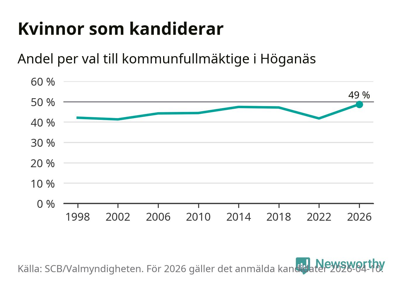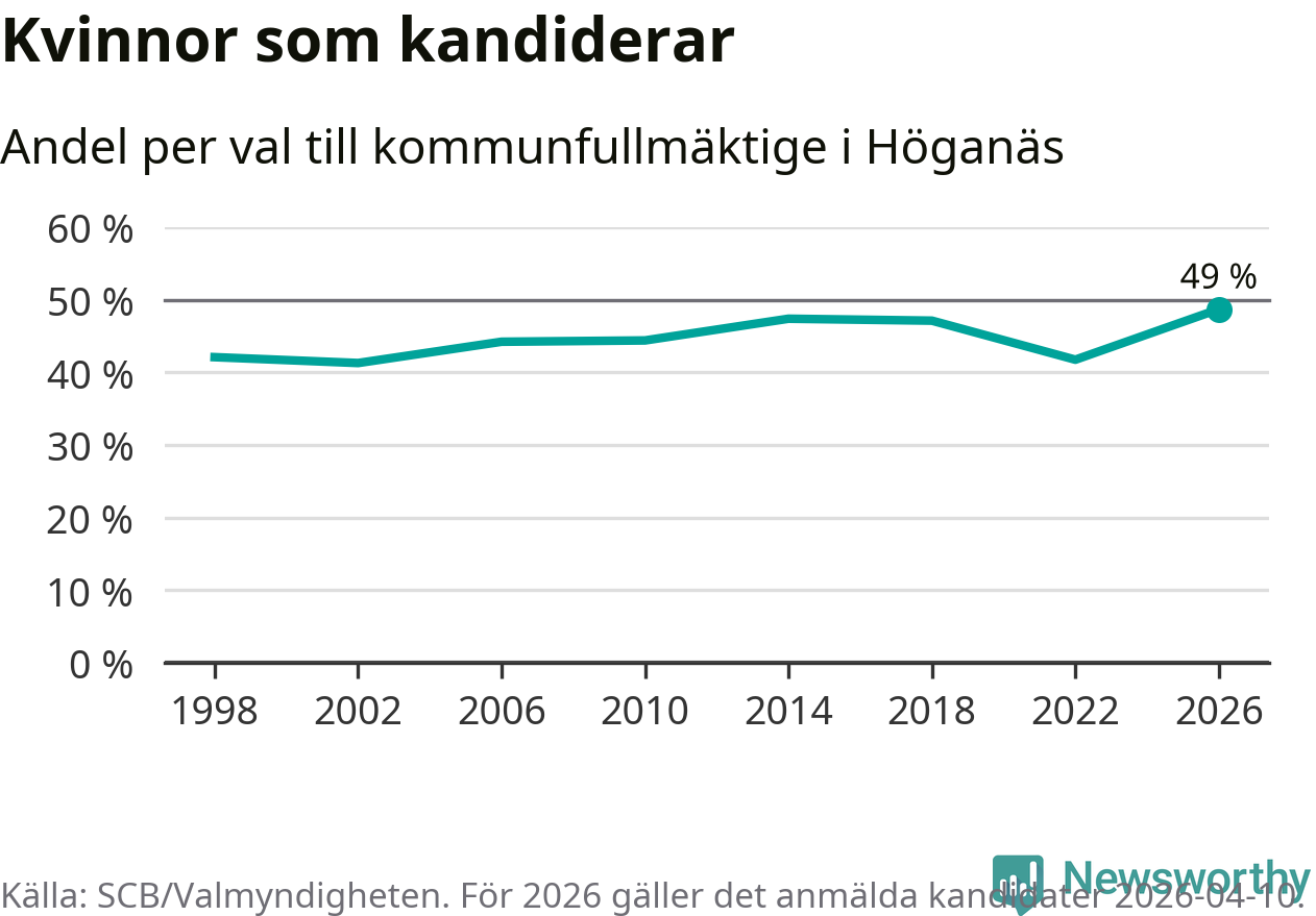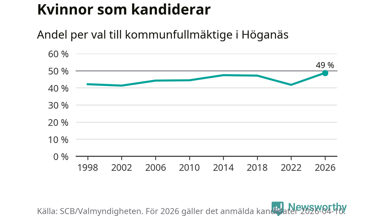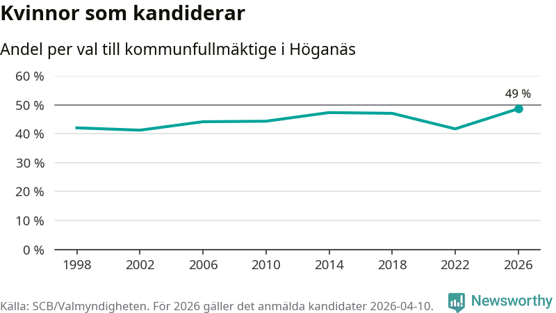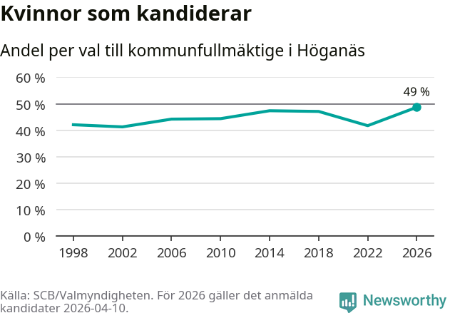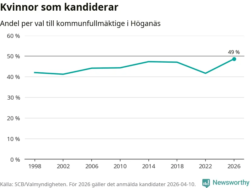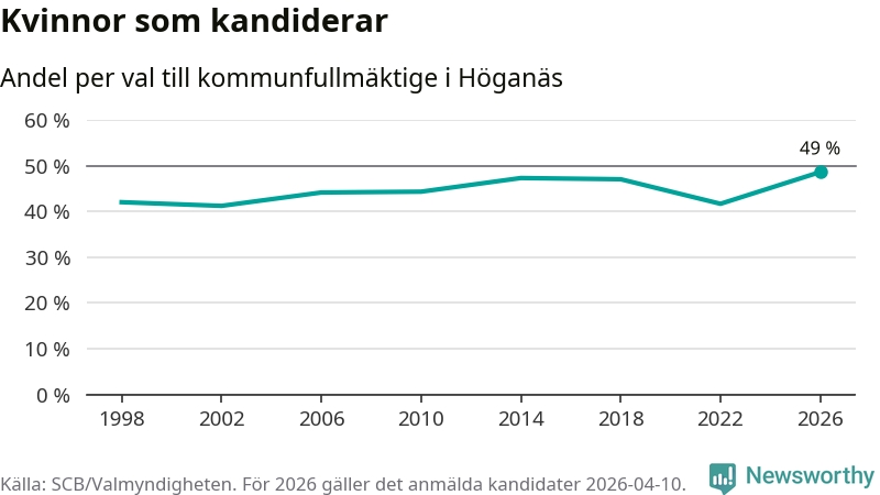 Kvinnorna utgör 49 procent av de hittills anmälda kandidaterna, vilket är den högsta andelen på listorna till kommunfullmäktige i Höganäs sedan åtminstone valet 1998. Höganäs är en av 264 kommuner i landet där männen utgör en majoritet av kandidaterna på listorna.