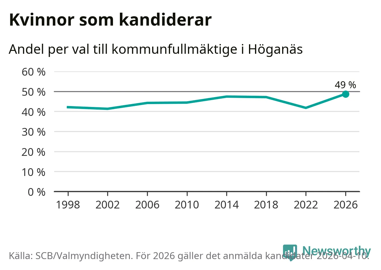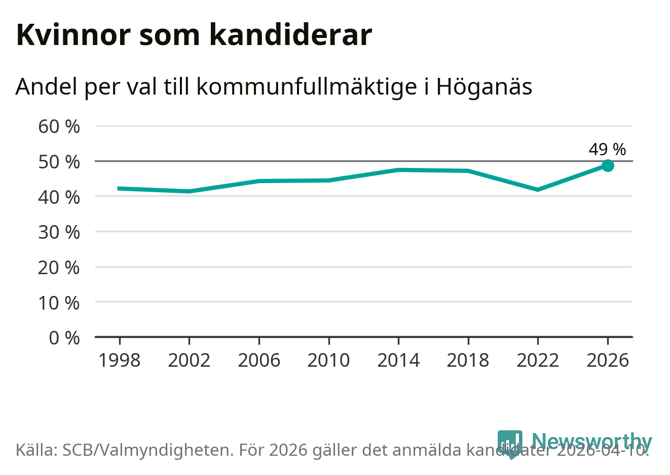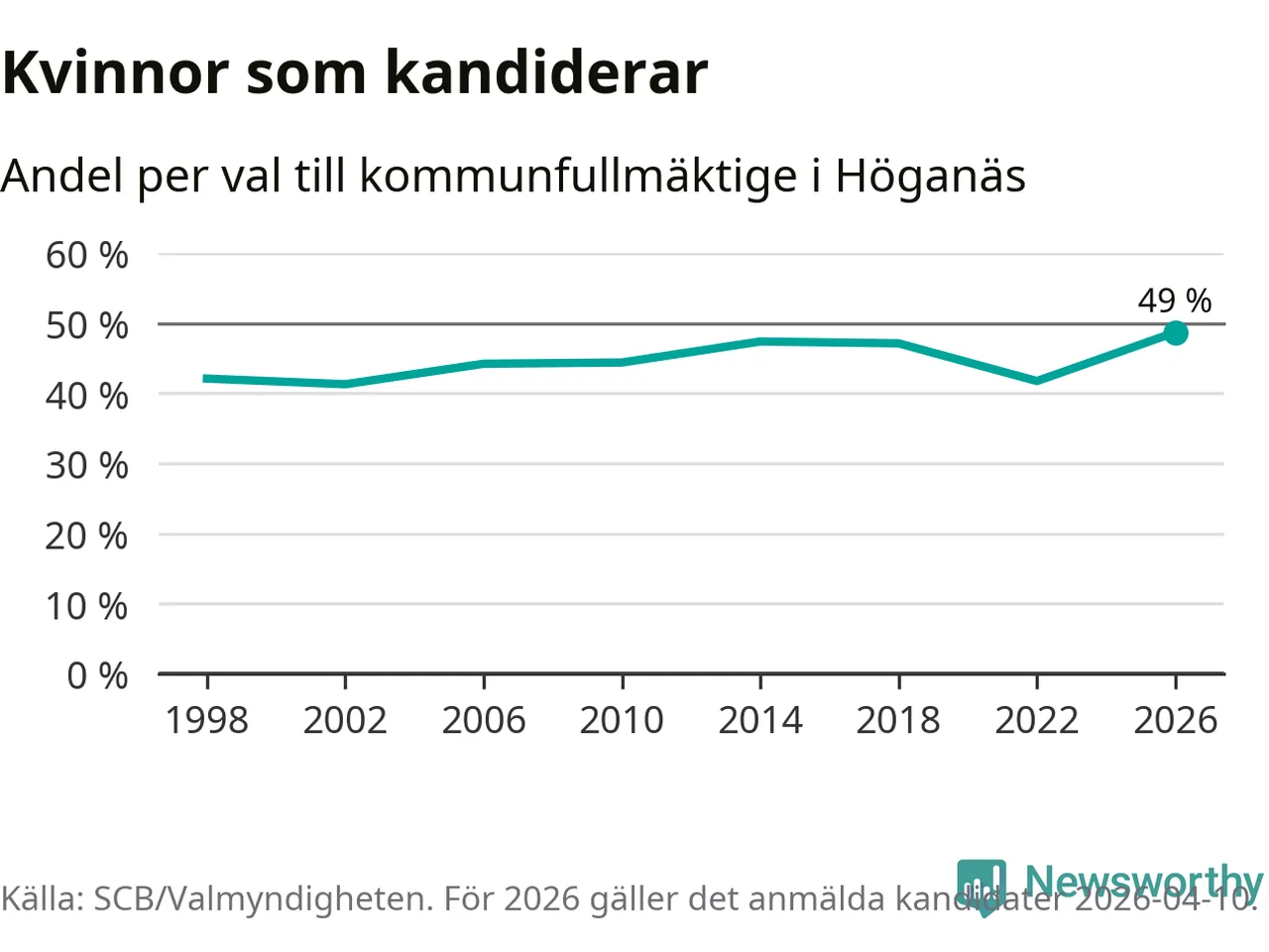 Kvinnorna utgör 49 procent av de hittills anmälda kandidaterna, vilket är den högsta andelen på listorna till kommunfullmäktige i Höganäs sedan åtminstone valet 1998. Höganäs är en av 264 kommuner i landet där männen utgör en majoritet av kandidaterna på listorna.