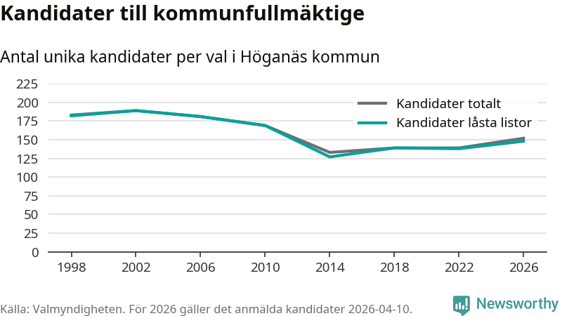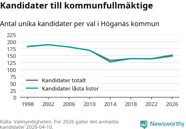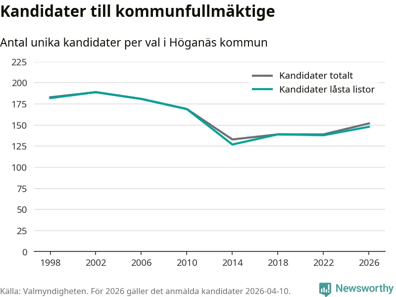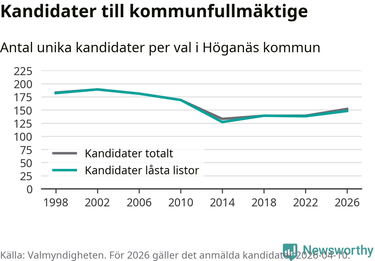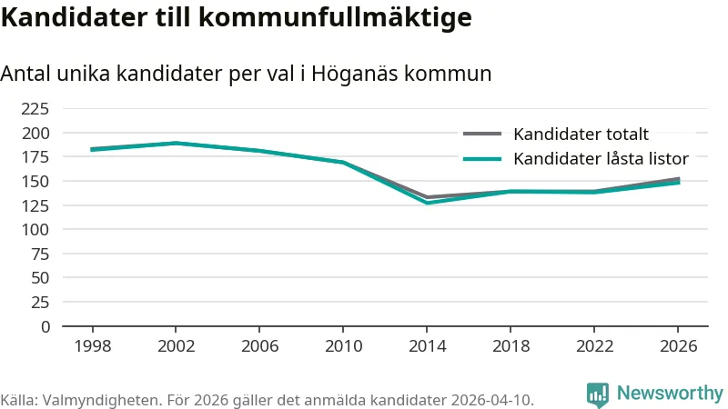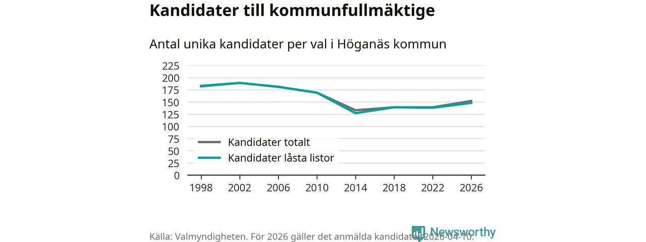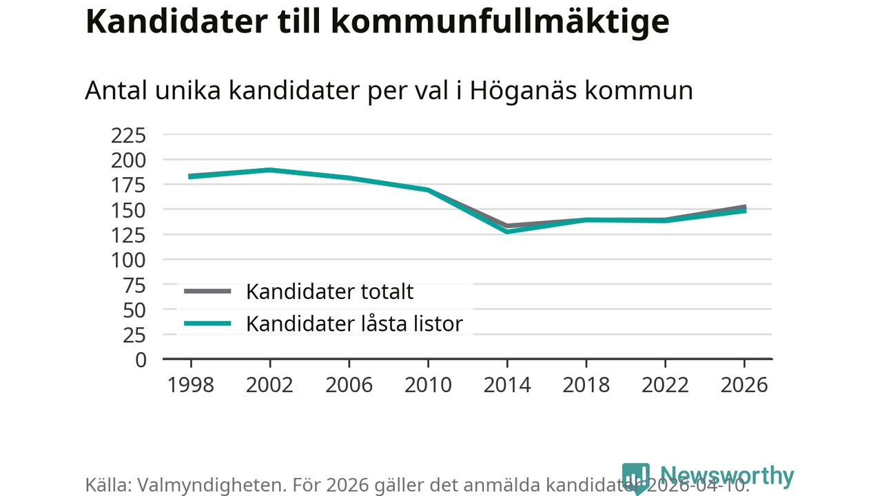 På torsdagen var det deadline för partier med låsta listor att registrera sina kandidater inför höstens val. Till valet till kommunfullmäktige i Höganäs är 148 kandidater anmälda på sådana listor, vilket är tio fler än i valet 2022.