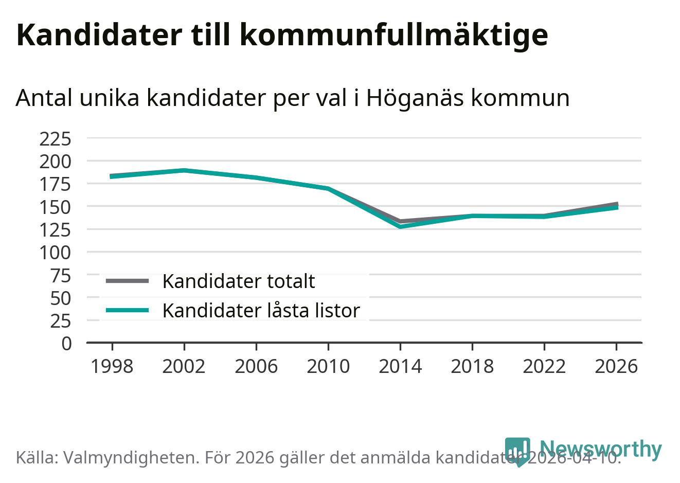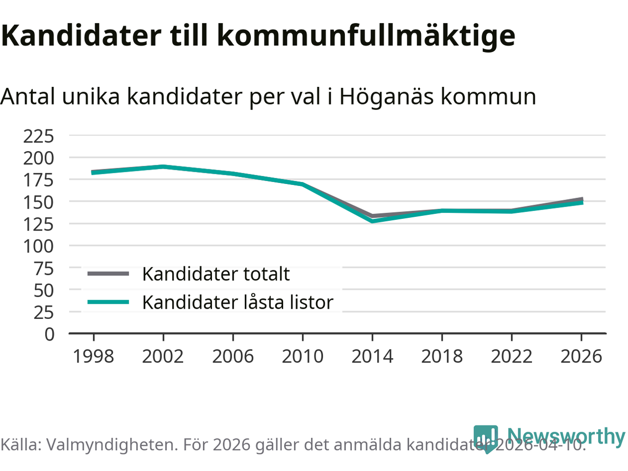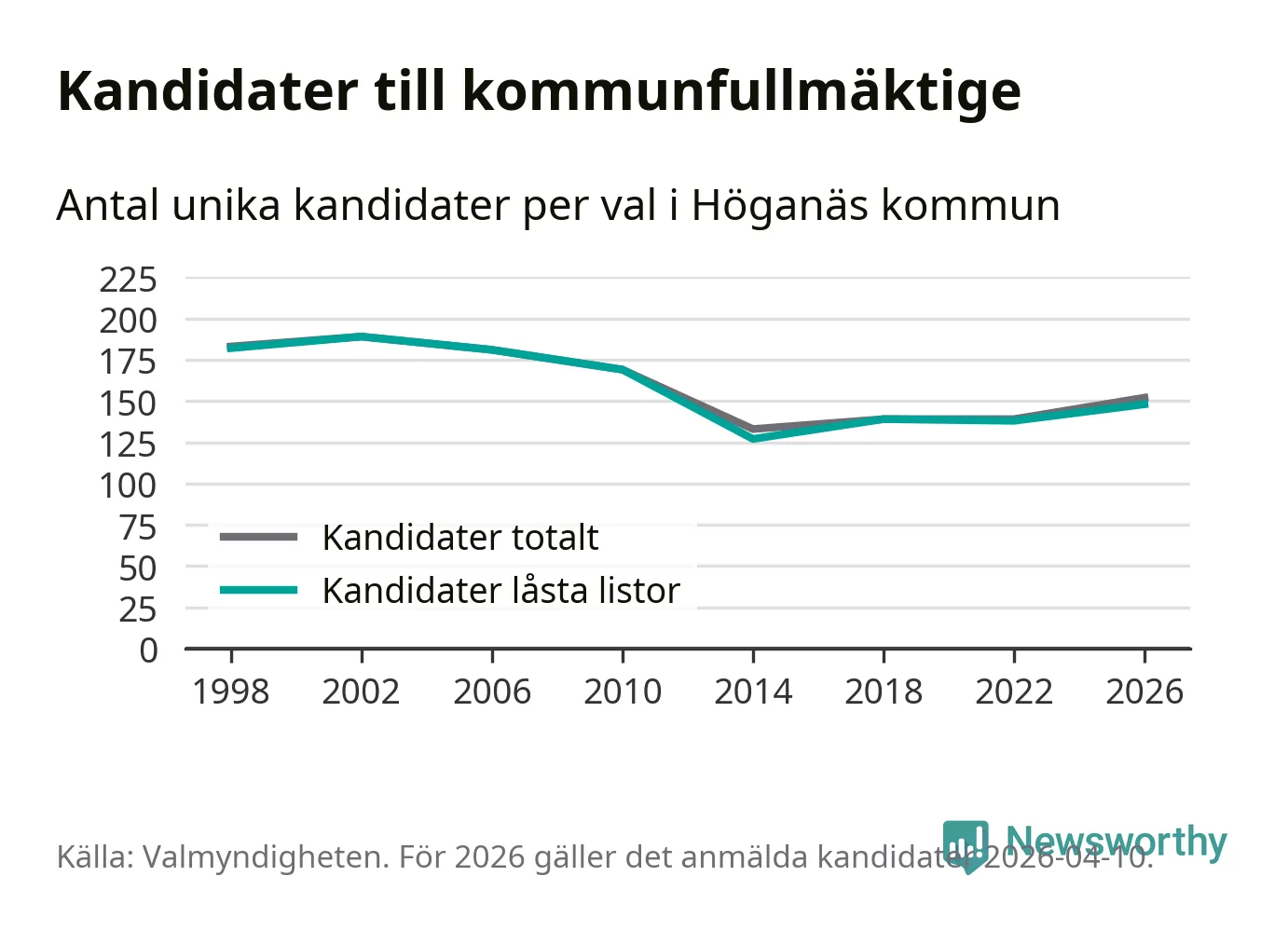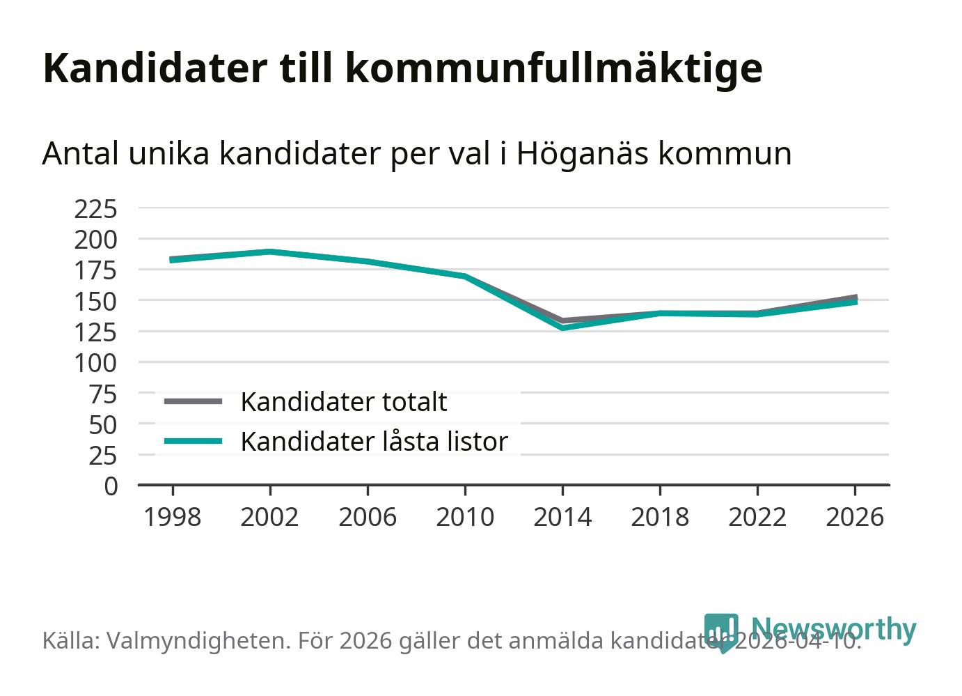 På torsdagen var det deadline för partier med låsta listor att registrera sina kandidater inför höstens val. Till valet till kommunfullmäktige i Höganäs är 148 kandidater anmälda på sådana listor, vilket är tio fler än i valet 2022.