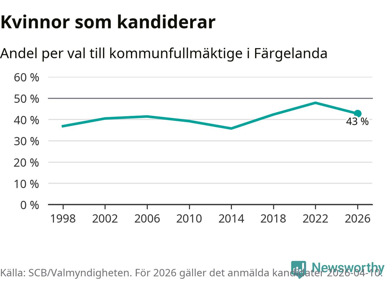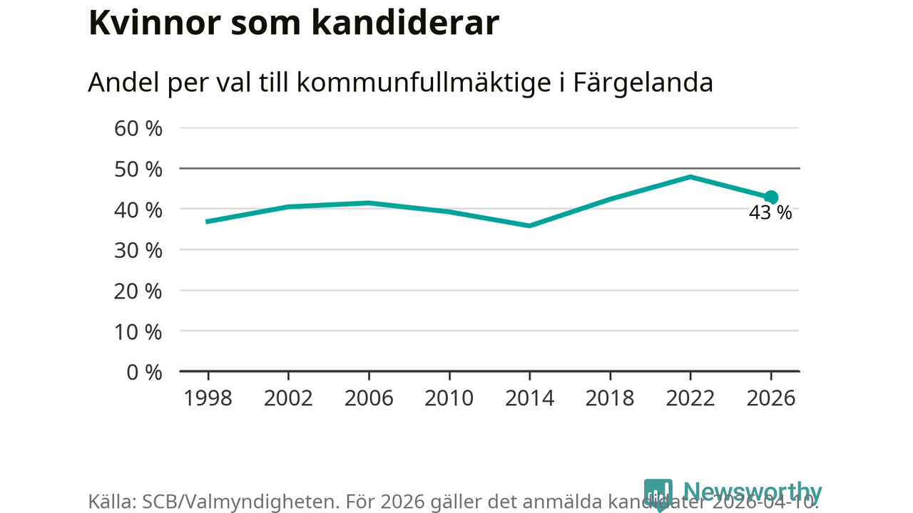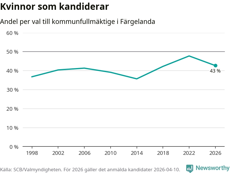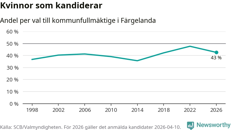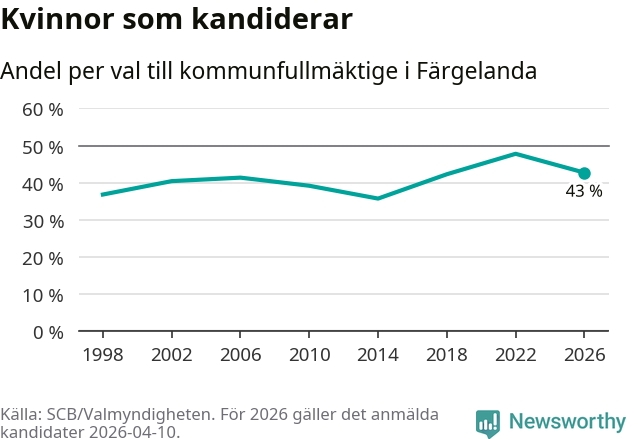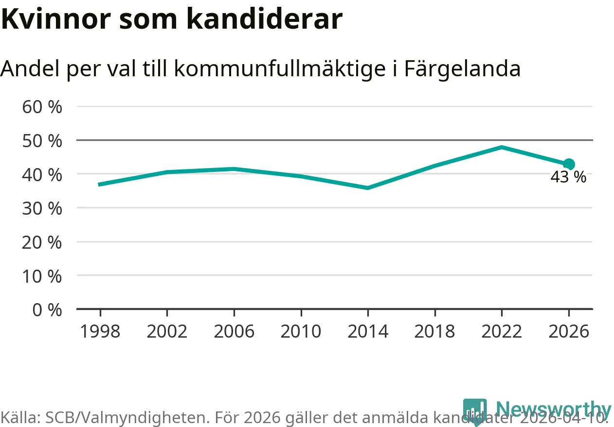 Kvinnorna utgör 43 procent av de hittills anmälda kandidaterna. Vid valet 2022 var 48 procent kvinnor, valet 2014 var motsvarande siffra 36 procent. Färgelanda är en av 264 kommuner i landet där männen utgör en majoritet av kandidaterna på listorna.