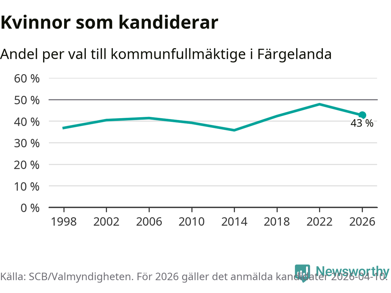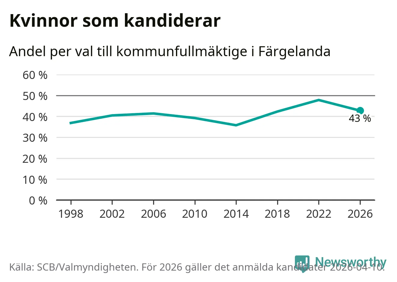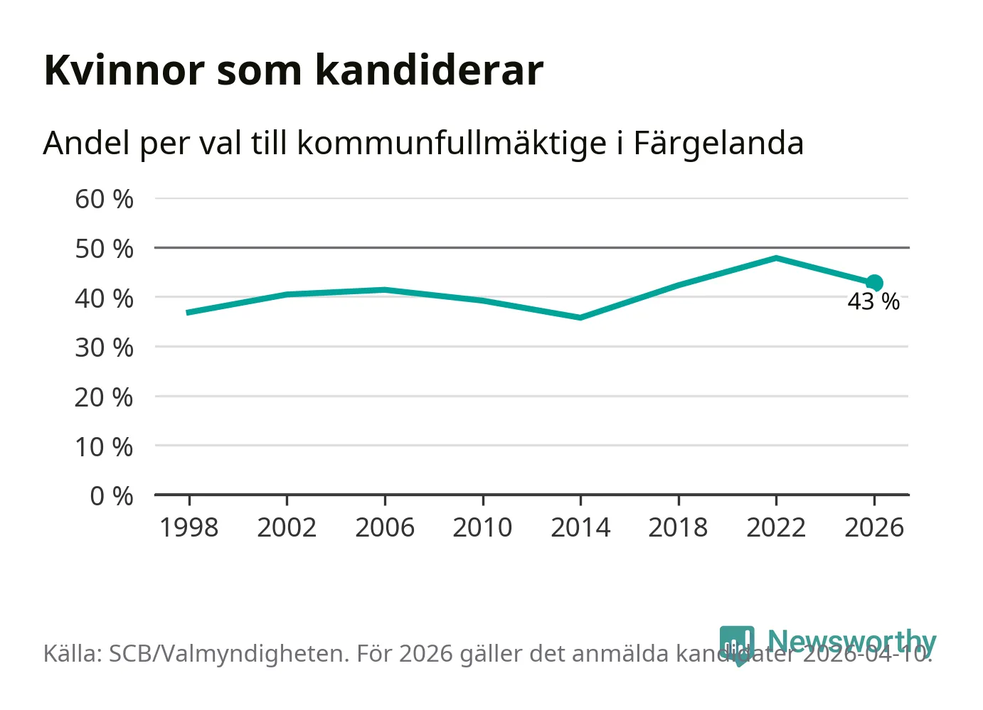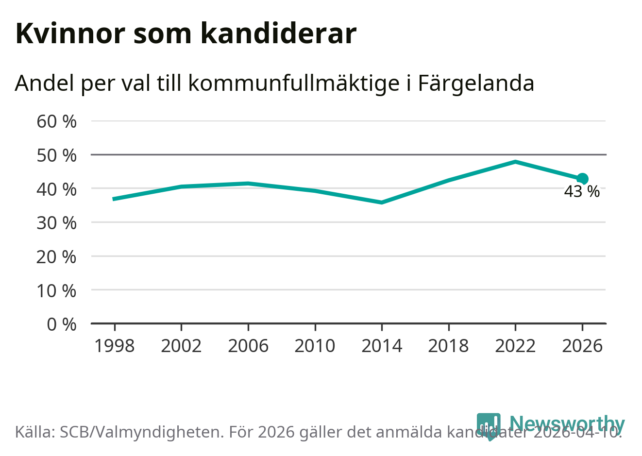 Kvinnorna utgör 43 procent av de hittills anmälda kandidaterna. Vid valet 2022 var 48 procent kvinnor, valet 2014 var motsvarande siffra 36 procent. Färgelanda är en av 264 kommuner i landet där männen utgör en majoritet av kandidaterna på listorna.