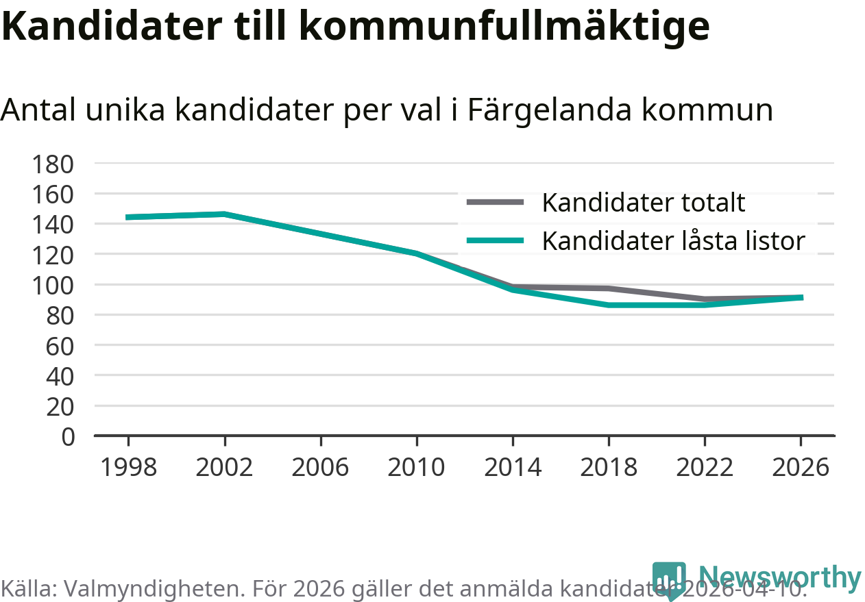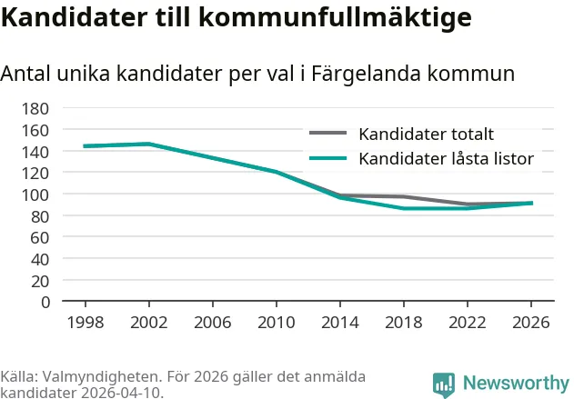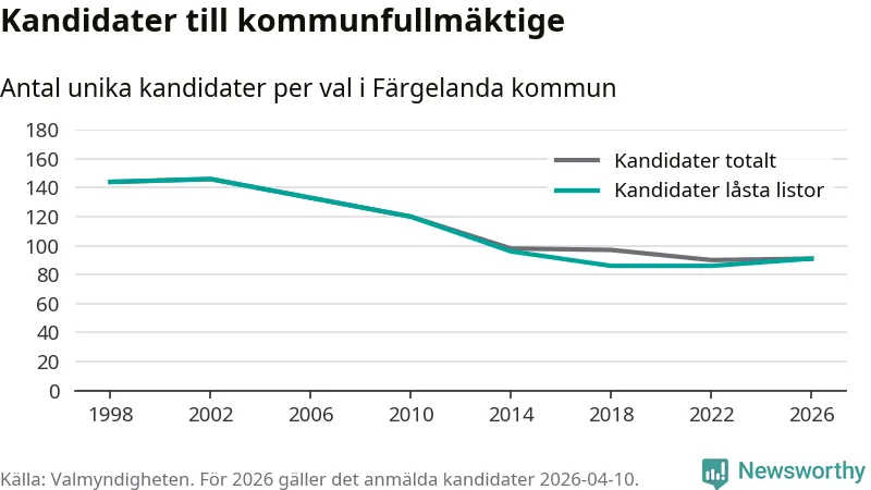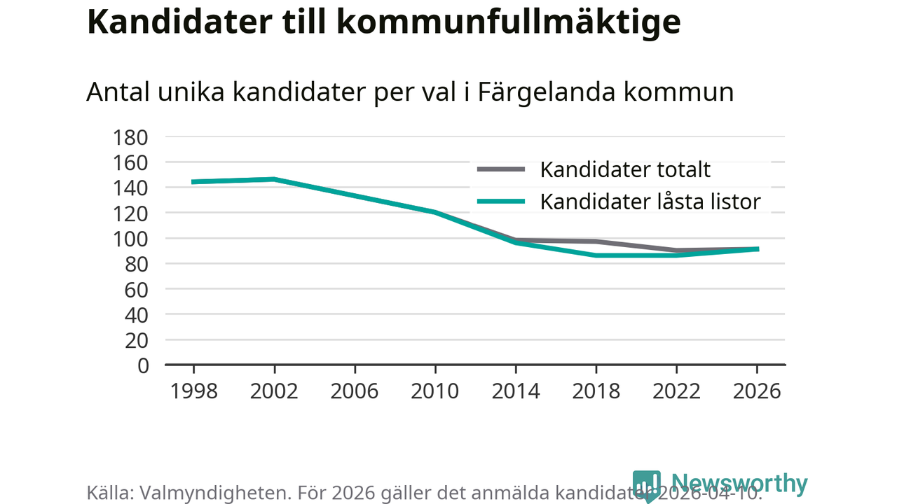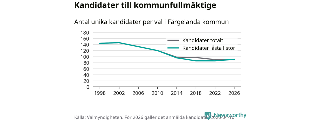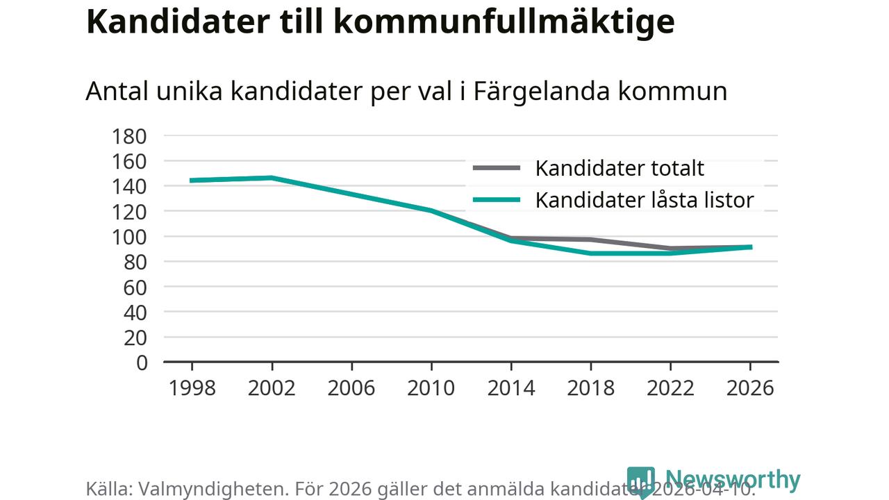 På torsdagen var det deadline för partier med låsta listor att registrera sina kandidater inför höstens val. Till valet till kommunfullmäktige i Färgelanda är 91 kandidater anmälda på sådana listor, vilket är fem fler än i valet 2022.