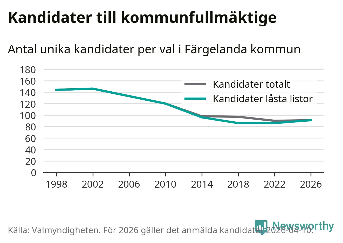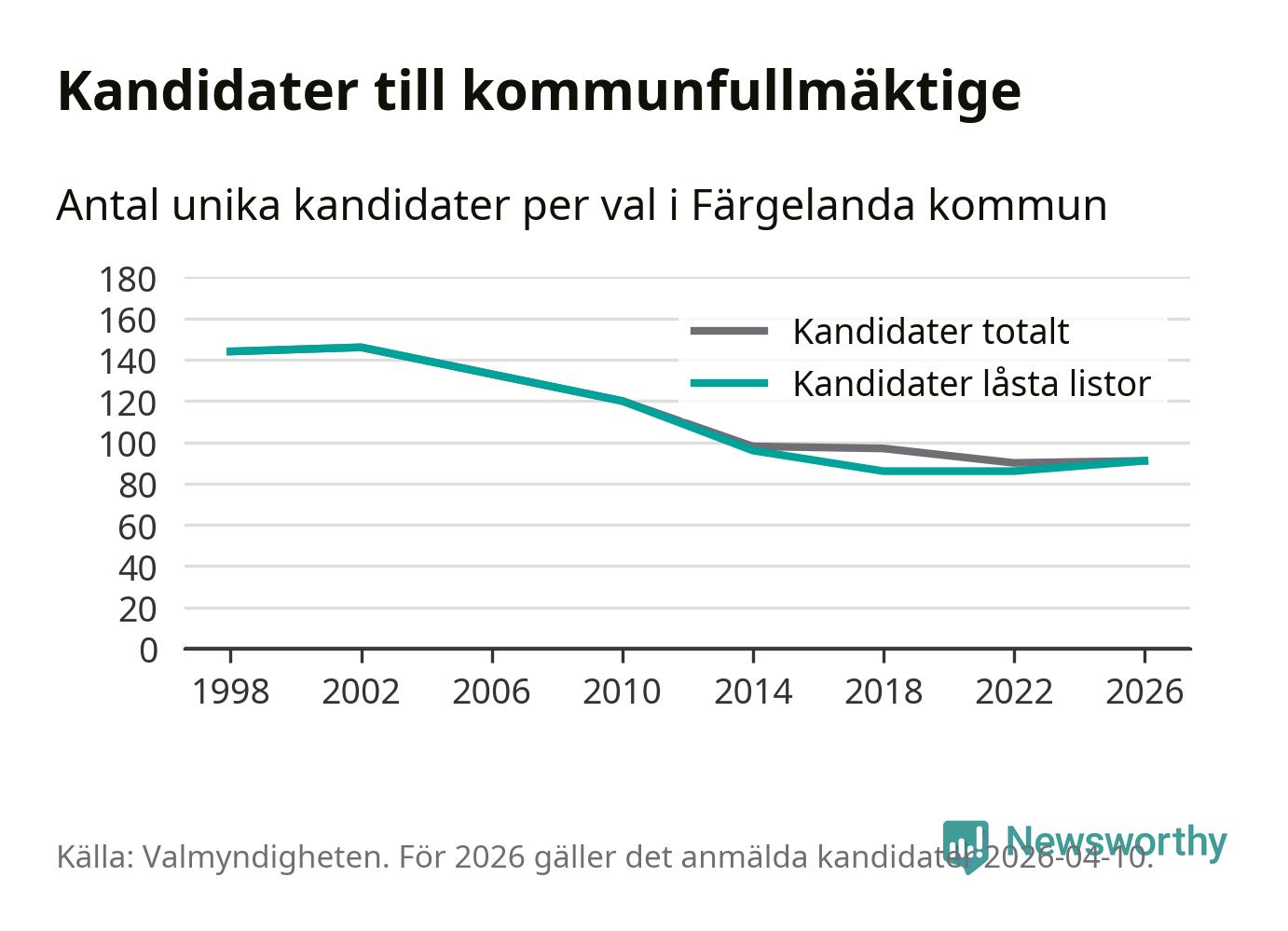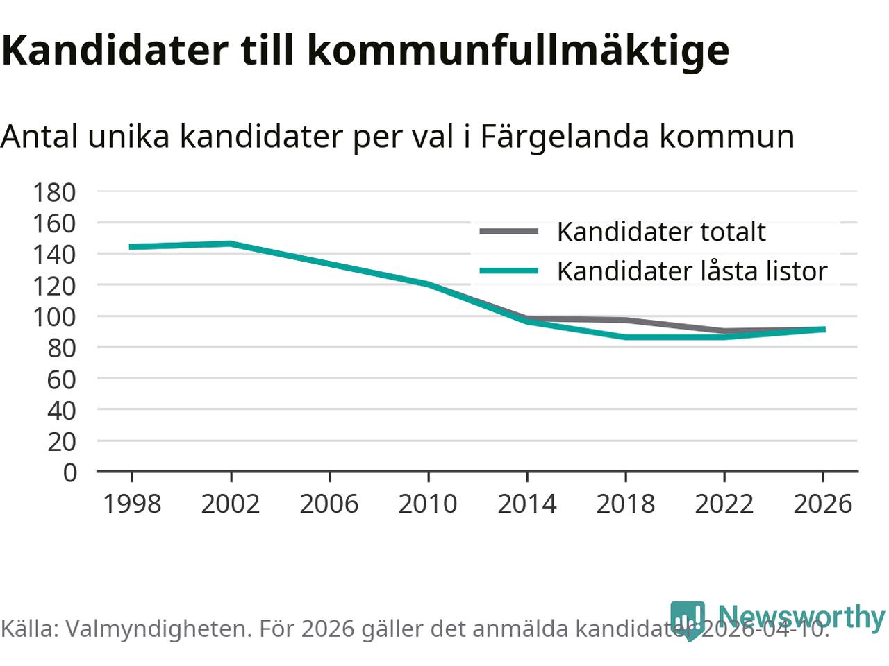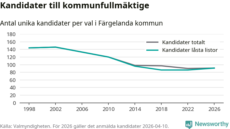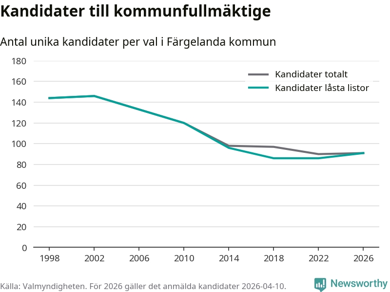 På torsdagen var det deadline för partier med låsta listor att registrera sina kandidater inför höstens val. Till valet till kommunfullmäktige i Färgelanda är 91 kandidater anmälda på sådana listor, vilket är fem fler än i valet 2022.