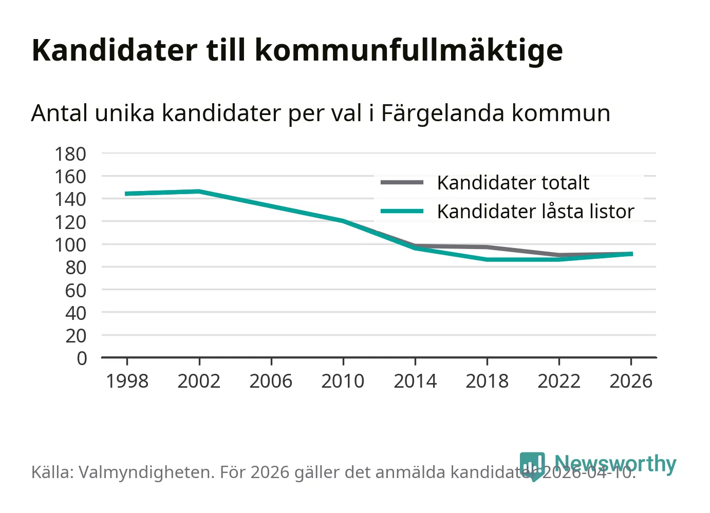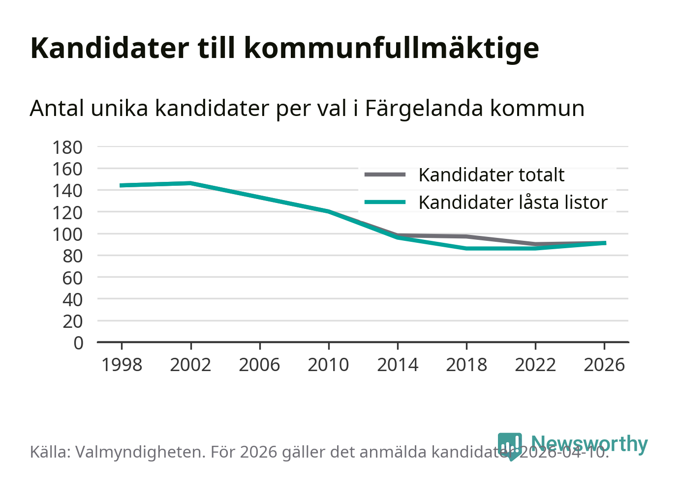 Källa: Valmyndigheten 10 april 2026. en kandidat har enligt Valmyndighetens uppgifter inte lämnat förklaring om samtycke, vilket de skulle ha gjort senast den 9 april för att vara med på listan. Det kan också vara så att förklaring har lämnats, men ännu inte hunnit registrerats i systemet.