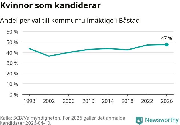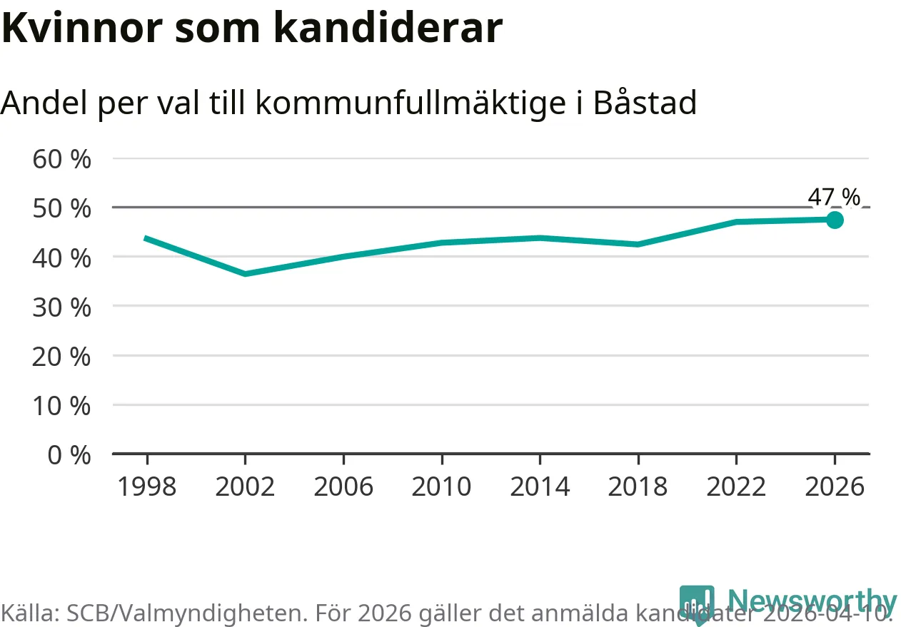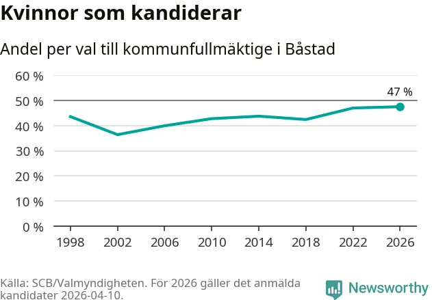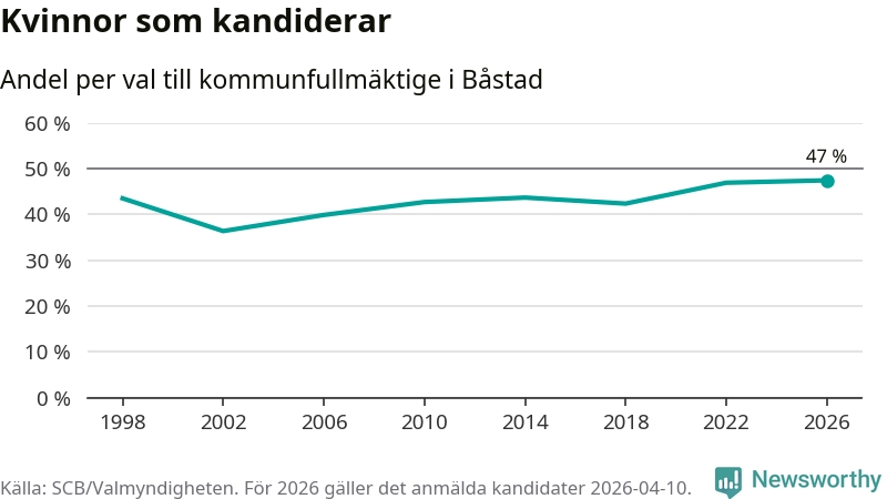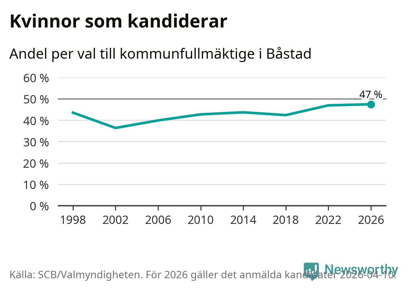 Kvinnorna utgör 47 procent av de hittills anmälda kandidaterna, vilket är den högsta andelen på listorna till kommunfullmäktige i Båstad sedan åtminstone valet 1998. Båstad är en av 264 kommuner i landet där männen utgör en majoritet av kandidaterna på listorna.