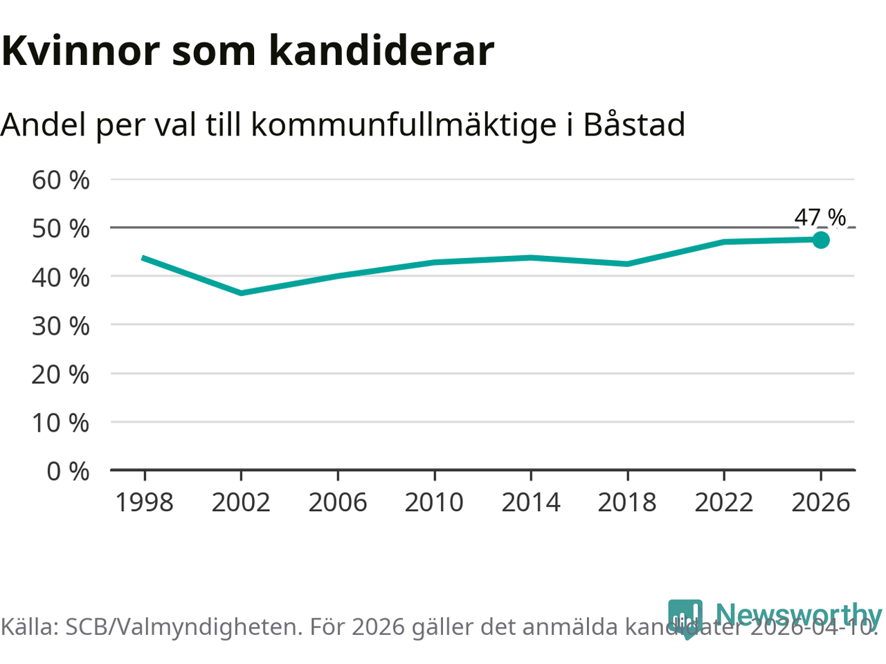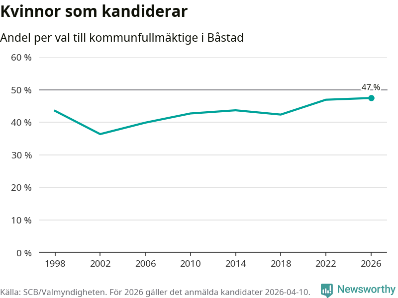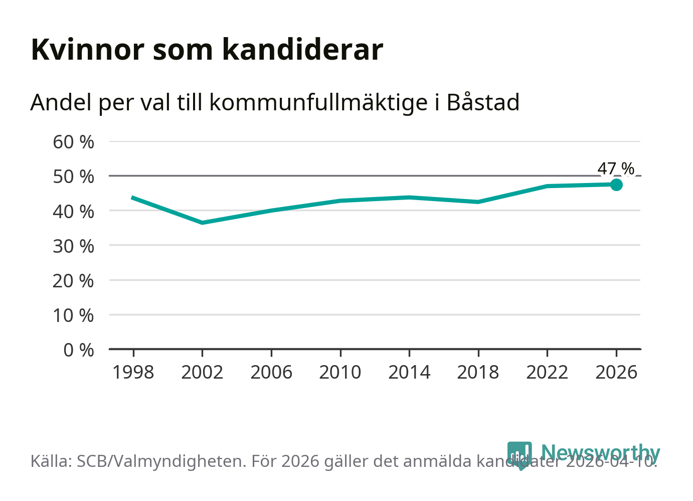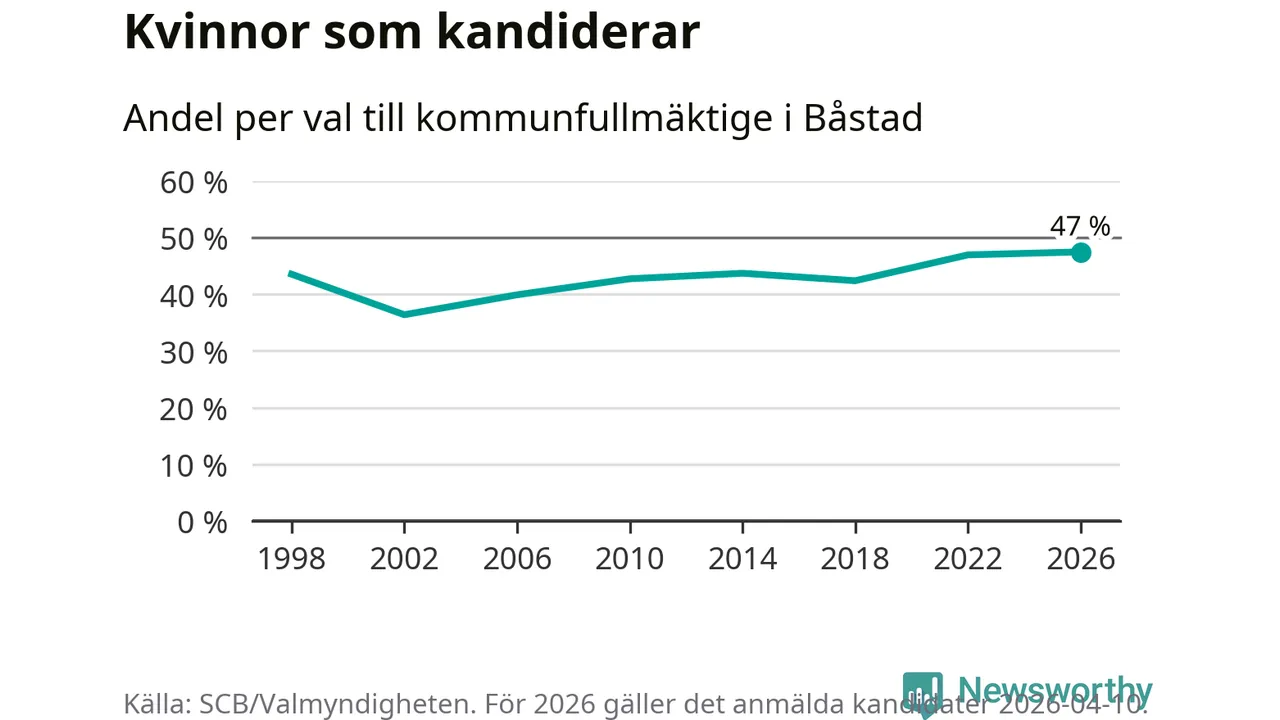Kvinnorna utgör 47 procent av de hittills anmälda kandidaterna, vilket är den högsta andelen på listorna till kommunfullmäktige i Båstad sedan åtminstone valet 1998. Båstad är en av 264 kommuner i landet där männen utgör en majoritet av kandidaterna på listorna.