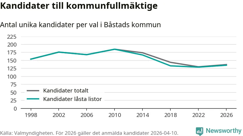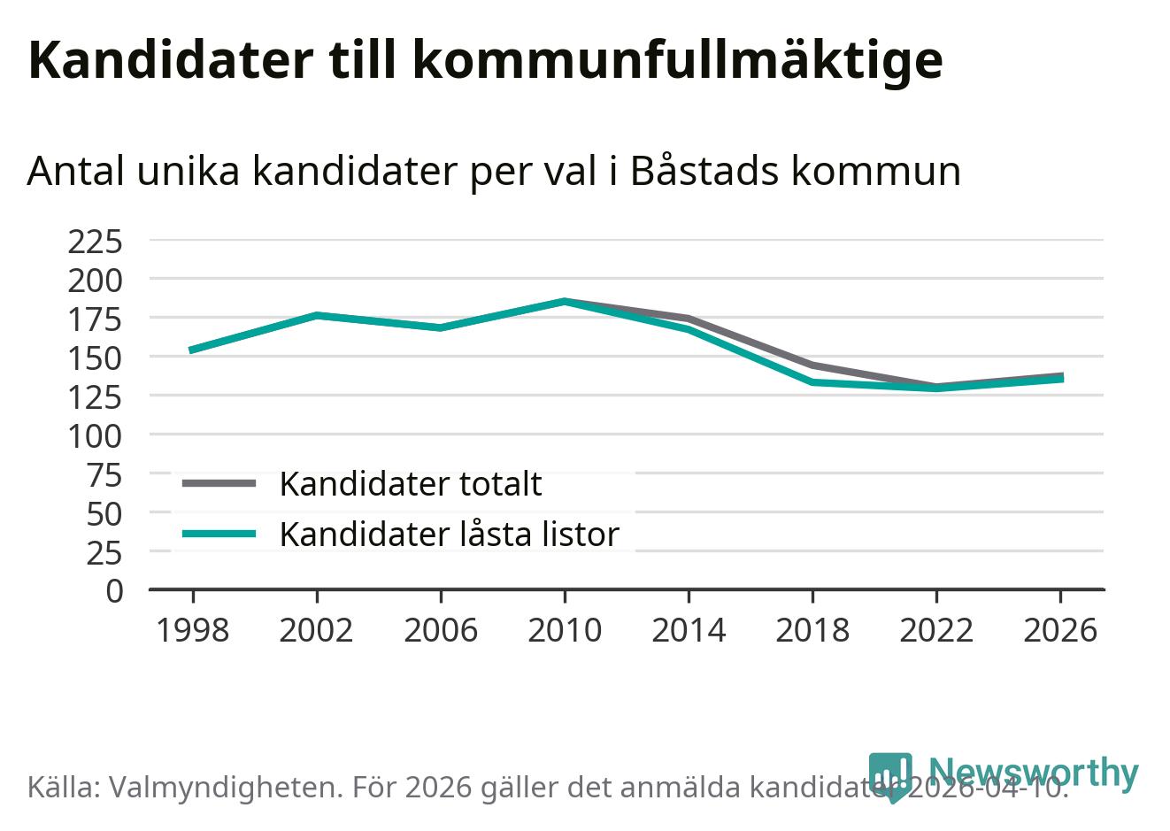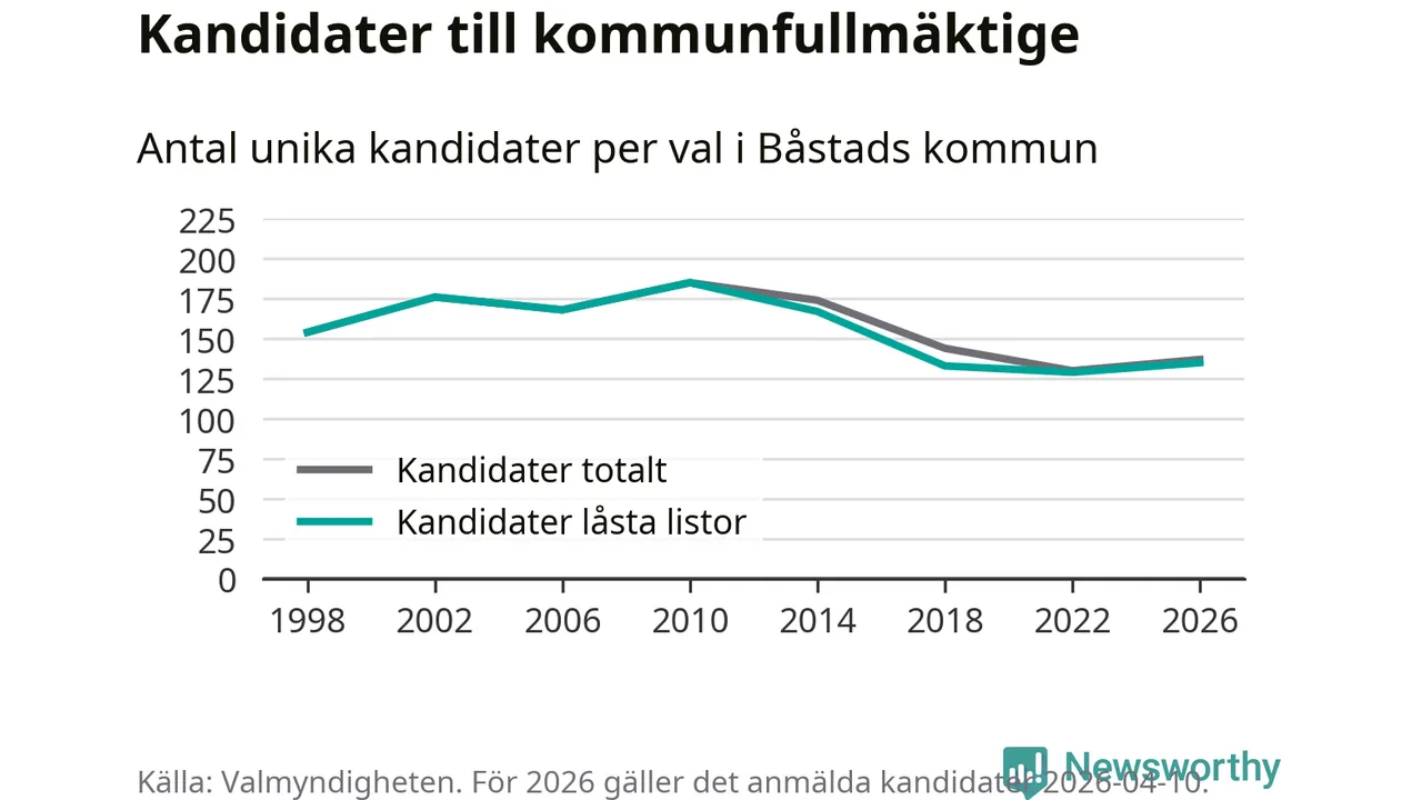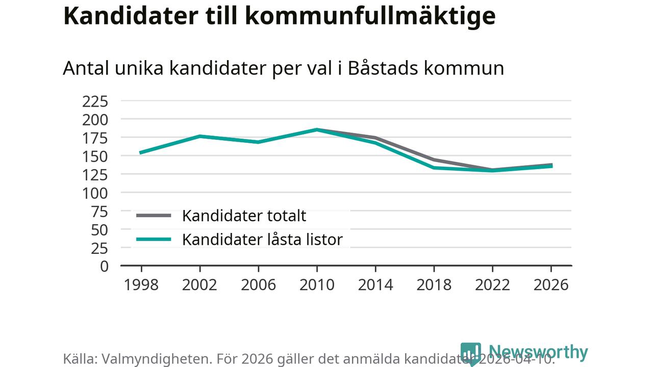 På torsdagen var det deadline för partier med låsta listor att registrera sina kandidater inför höstens val. Till valet till kommunfullmäktige i Båstad är 135 kandidater anmälda på sådana listor, vilket är sex fler än i valet 2022.