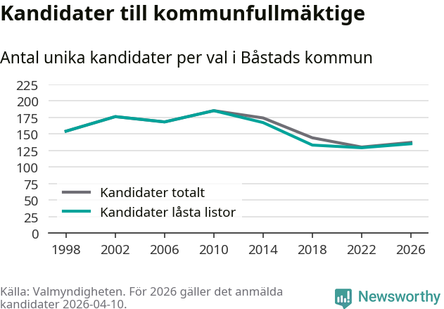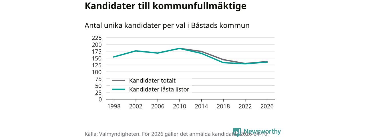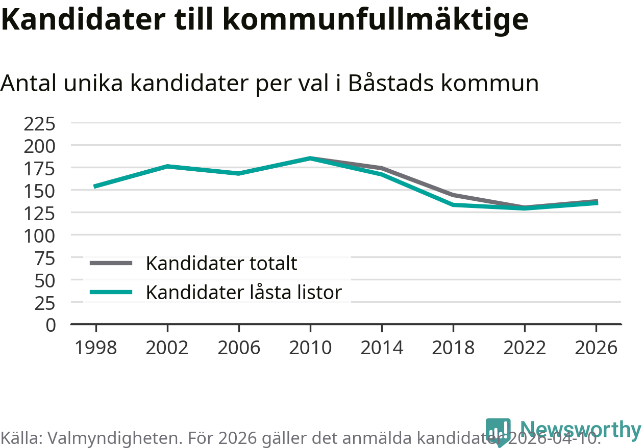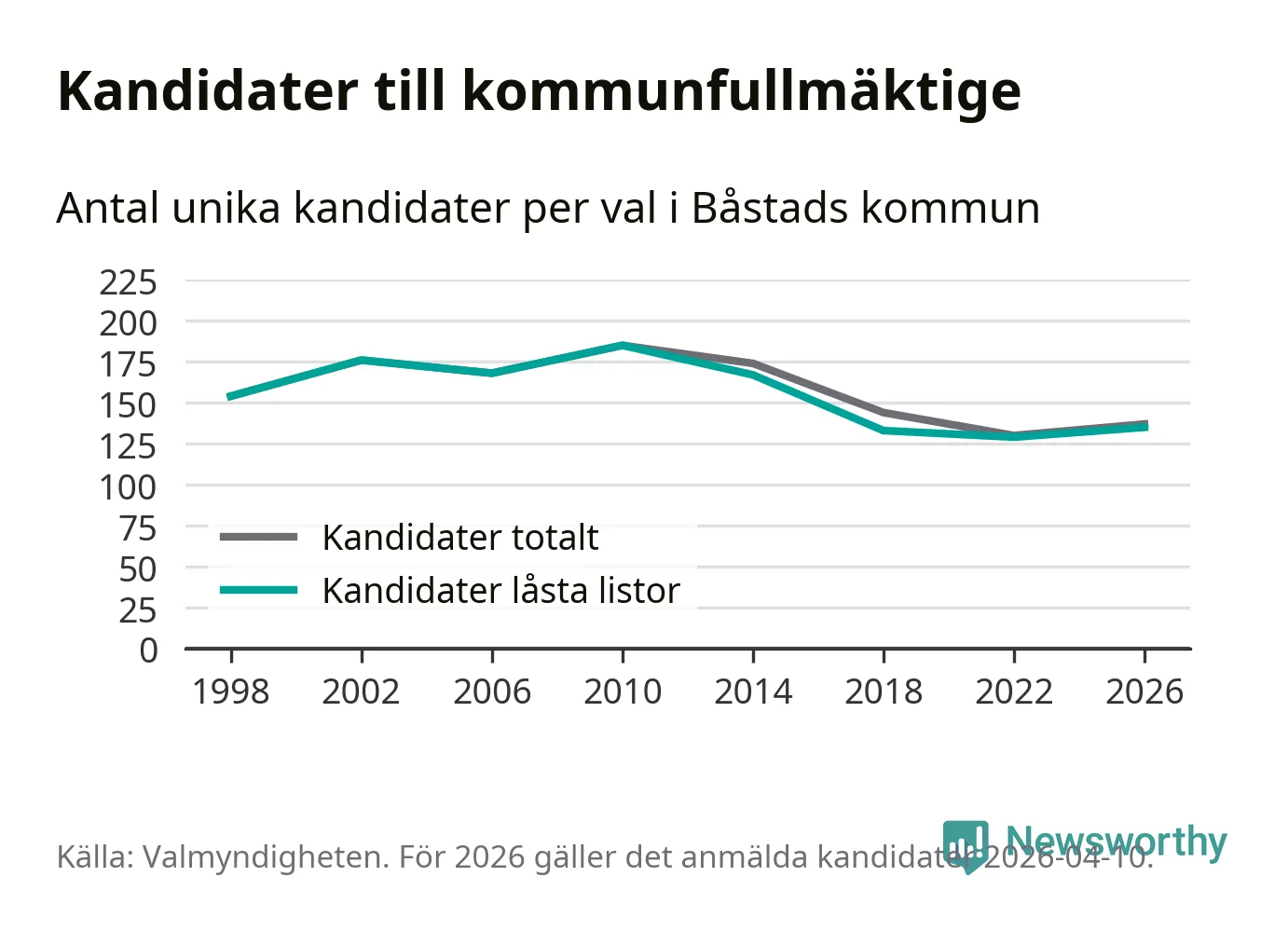 På torsdagen var det deadline för partier med låsta listor att registrera sina kandidater inför höstens val. Till valet till kommunfullmäktige i Båstad är 135 kandidater anmälda på sådana listor, vilket är sex fler än i valet 2022.