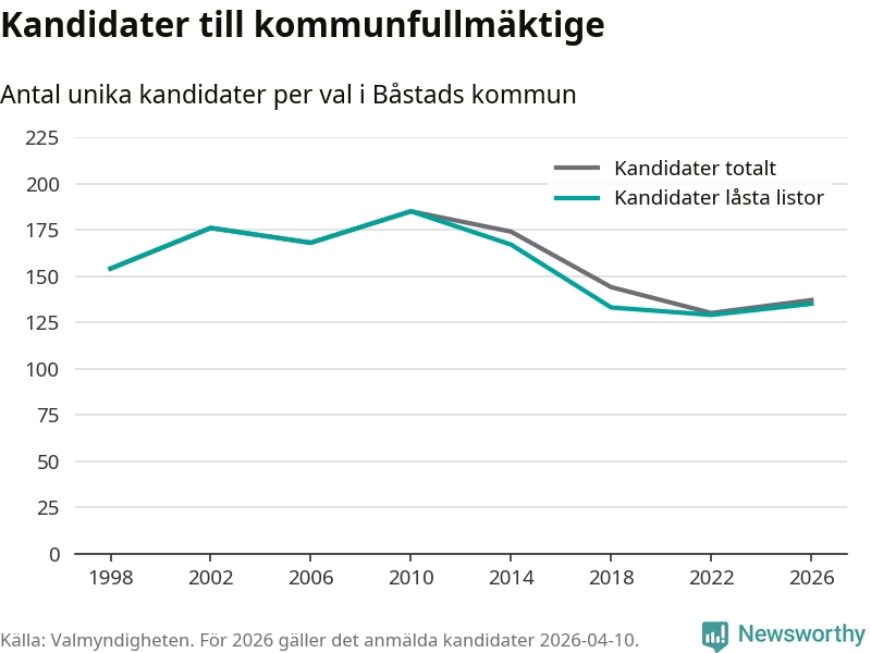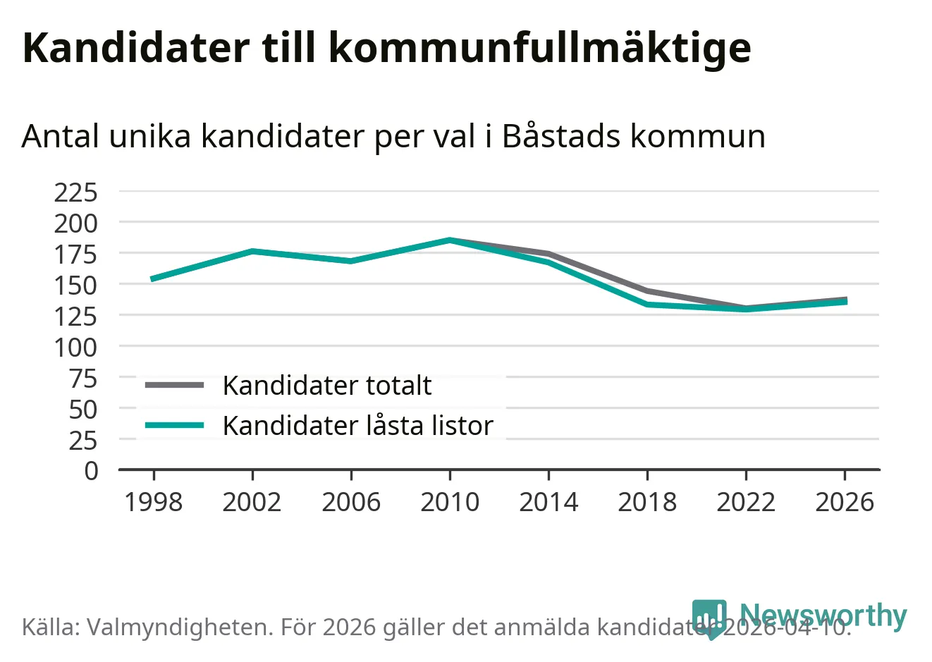 Att listan är låst innebär att partiet redan har anmält sina kandidater och bestämt ordningen på listan och att väljare inte kan lägga till egna kandidater. På öppna listor kan kandidater läggas till fram till dagarna före valet och vem som helst kan anmäla sig som kandidat. De senaste valen har drygt nio av tio kandidater anmälts på låsta listor. I valet till kommunfullmäktige i Båstad 2022 fanns i princip alla kandidater på låsta listor. Hittills i år finns två kandidater på öppna listor. Totalt rör det sig alltså om 137 kandidater till höstens val.