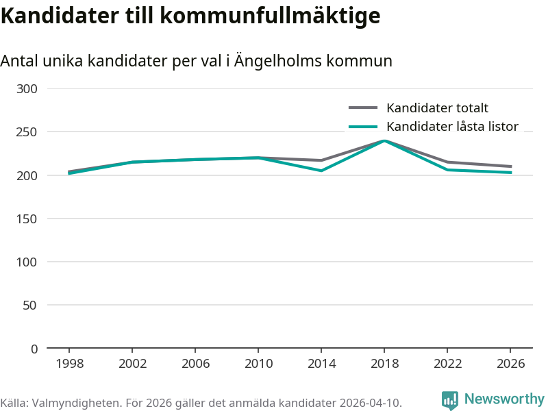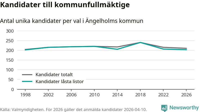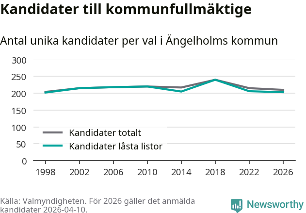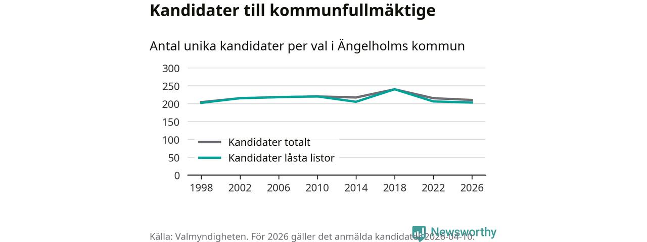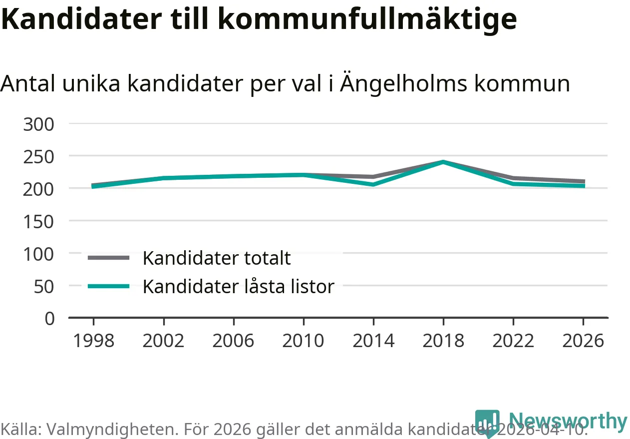 På torsdagen var det deadline för partier med låsta listor att registrera sina kandidater inför höstens val. Till valet till kommunfullmäktige i Ängelholm är 203 kandidater anmälda på sådana listor, vilket är tre färre än i valet 2022.