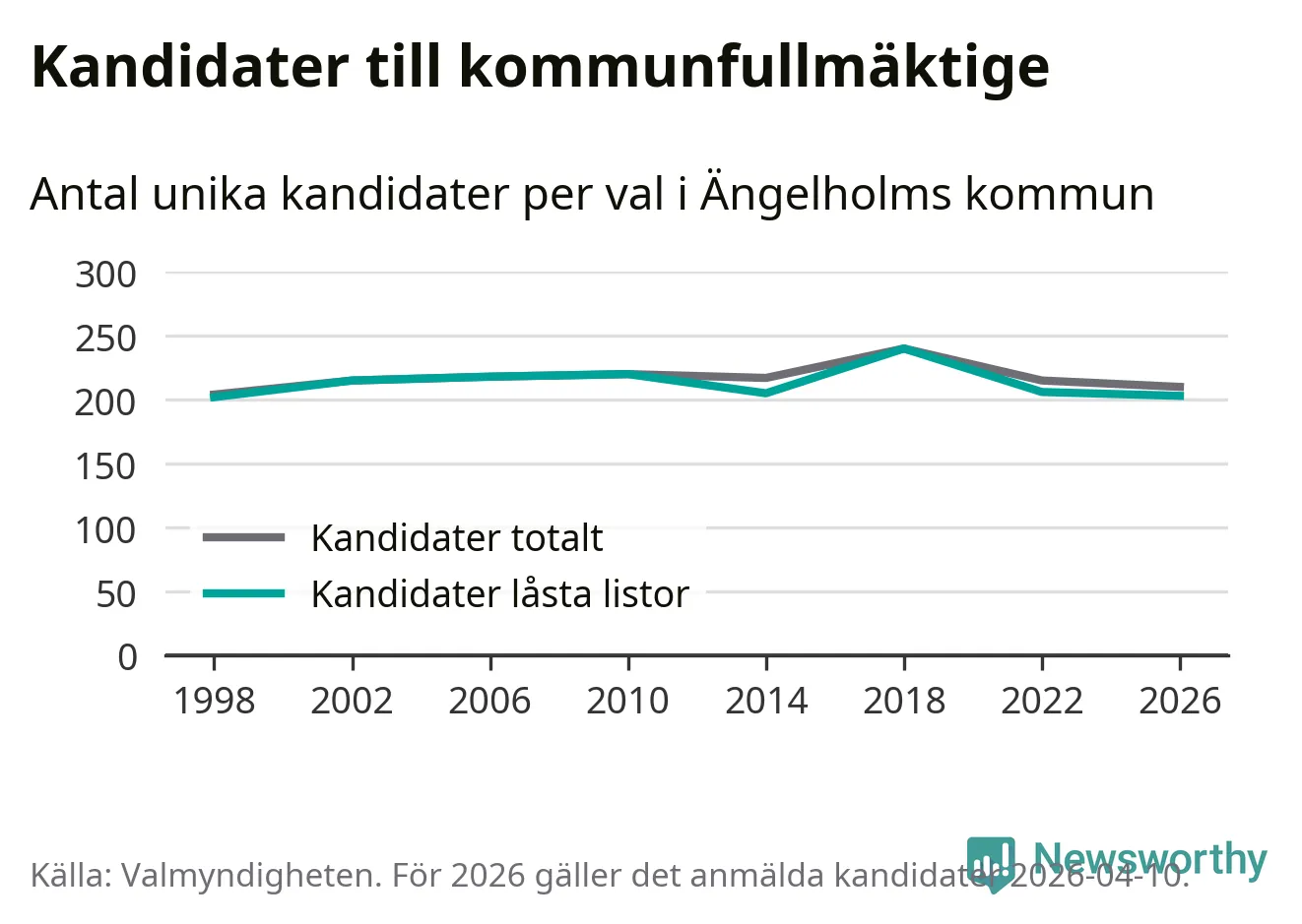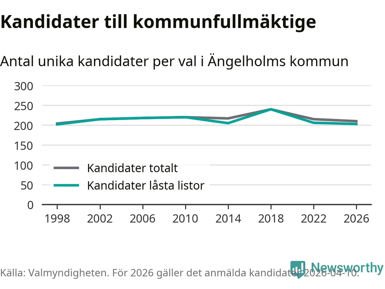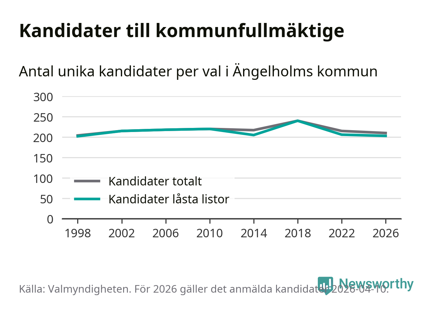 På torsdagen var det deadline för partier med låsta listor att registrera sina kandidater inför höstens val. Till valet till kommunfullmäktige i Ängelholm är 203 kandidater anmälda på sådana listor, vilket är tre färre än i valet 2022.