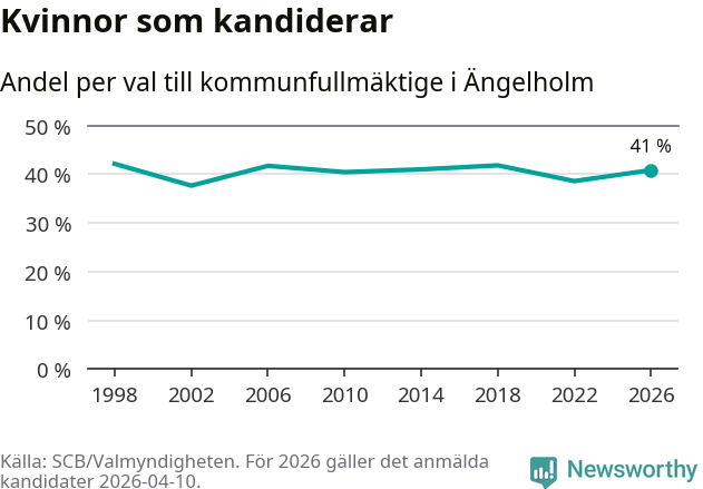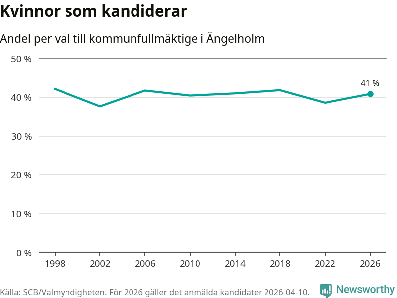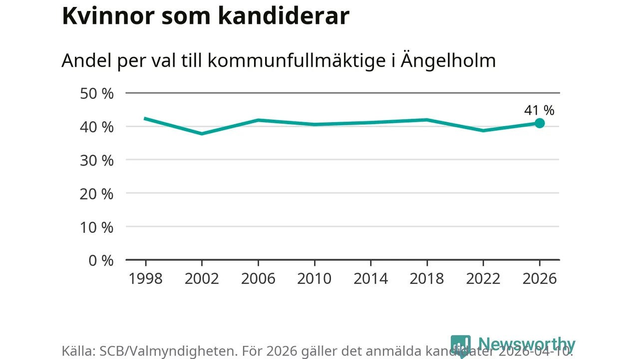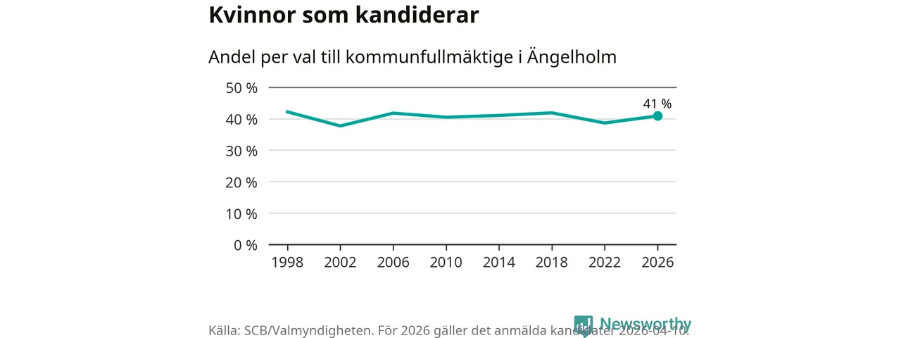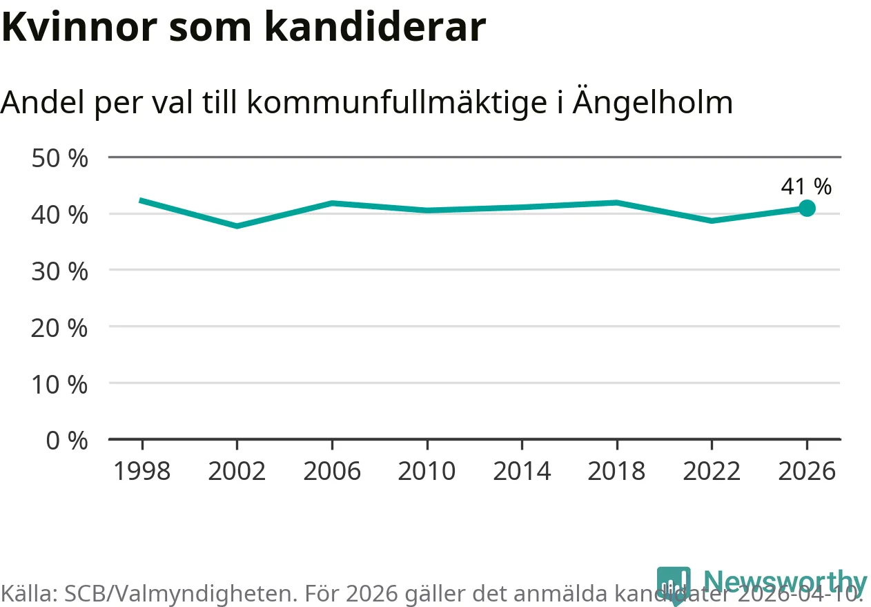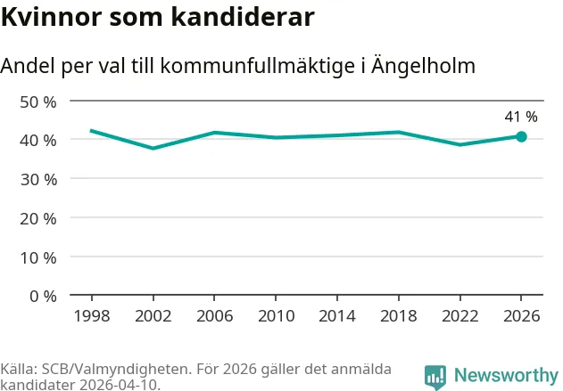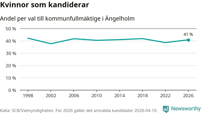 Kvinnorna utgör 41 procent av de hittills anmälda kandidaterna. Vid valet 1998 var 42 procent kvinnor, valet 2002 var motsvarande siffra 38 procent. Ängelholm är en av 264 kommuner i landet där männen utgör en majoritet av kandidaterna på listorna.