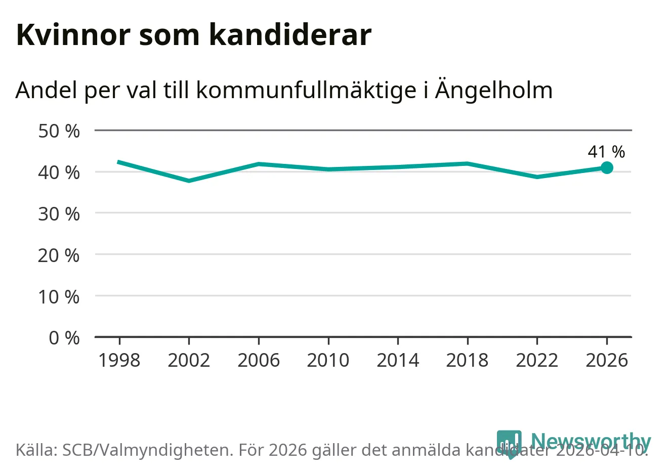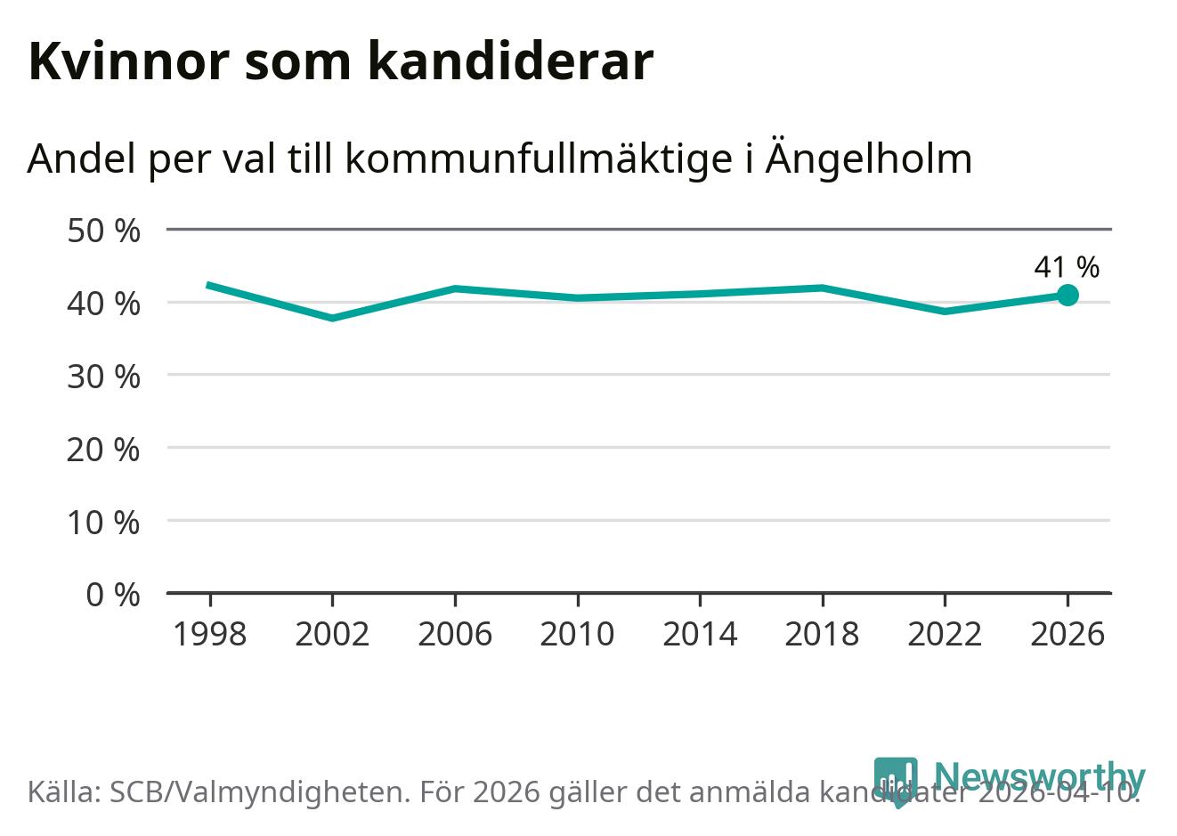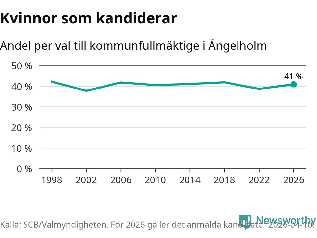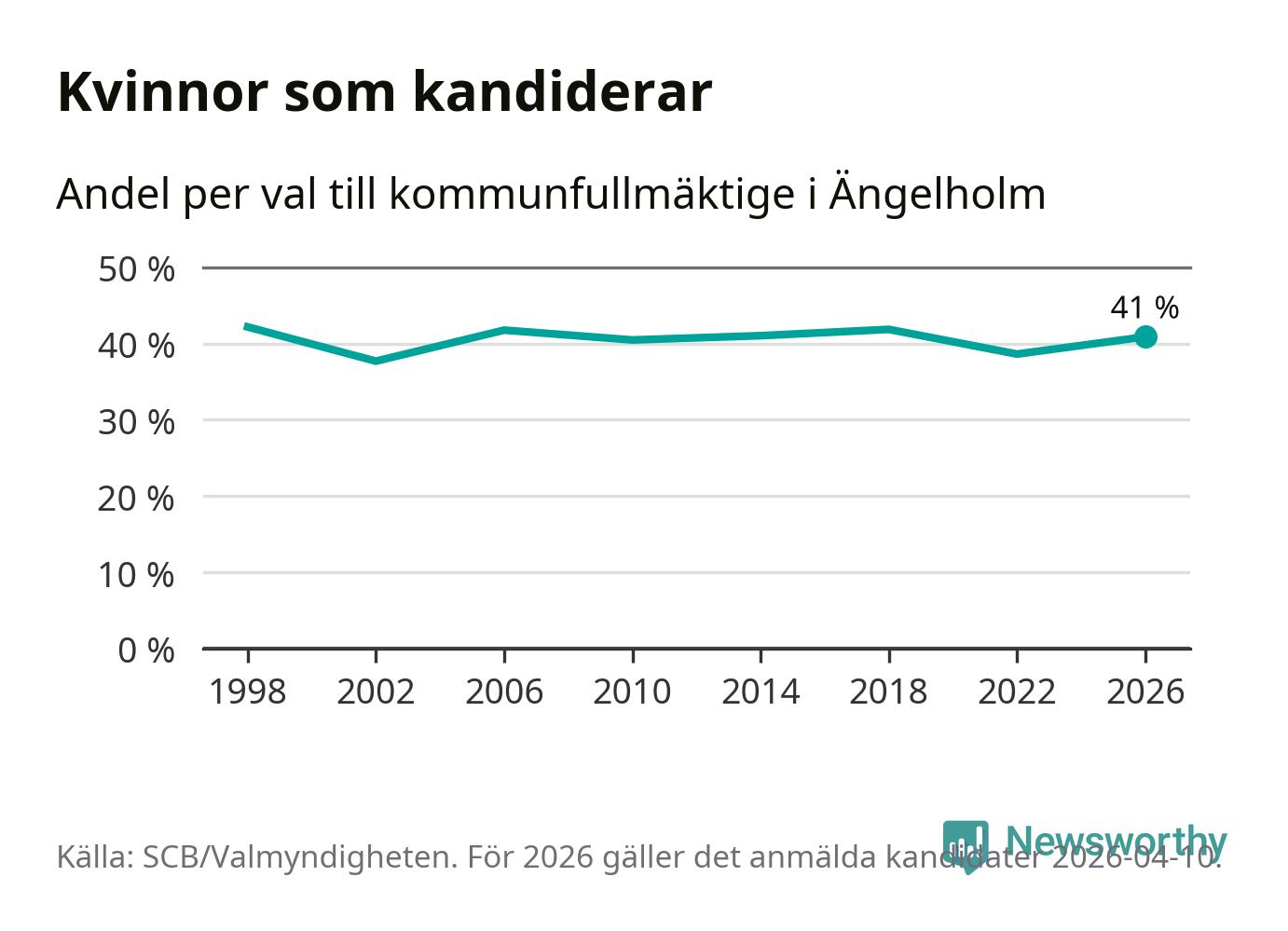 Kvinnorna utgör 41 procent av de hittills anmälda kandidaterna. Vid valet 1998 var 42 procent kvinnor, valet 2002 var motsvarande siffra 38 procent. Ängelholm är en av 264 kommuner i landet där männen utgör en majoritet av kandidaterna på listorna.