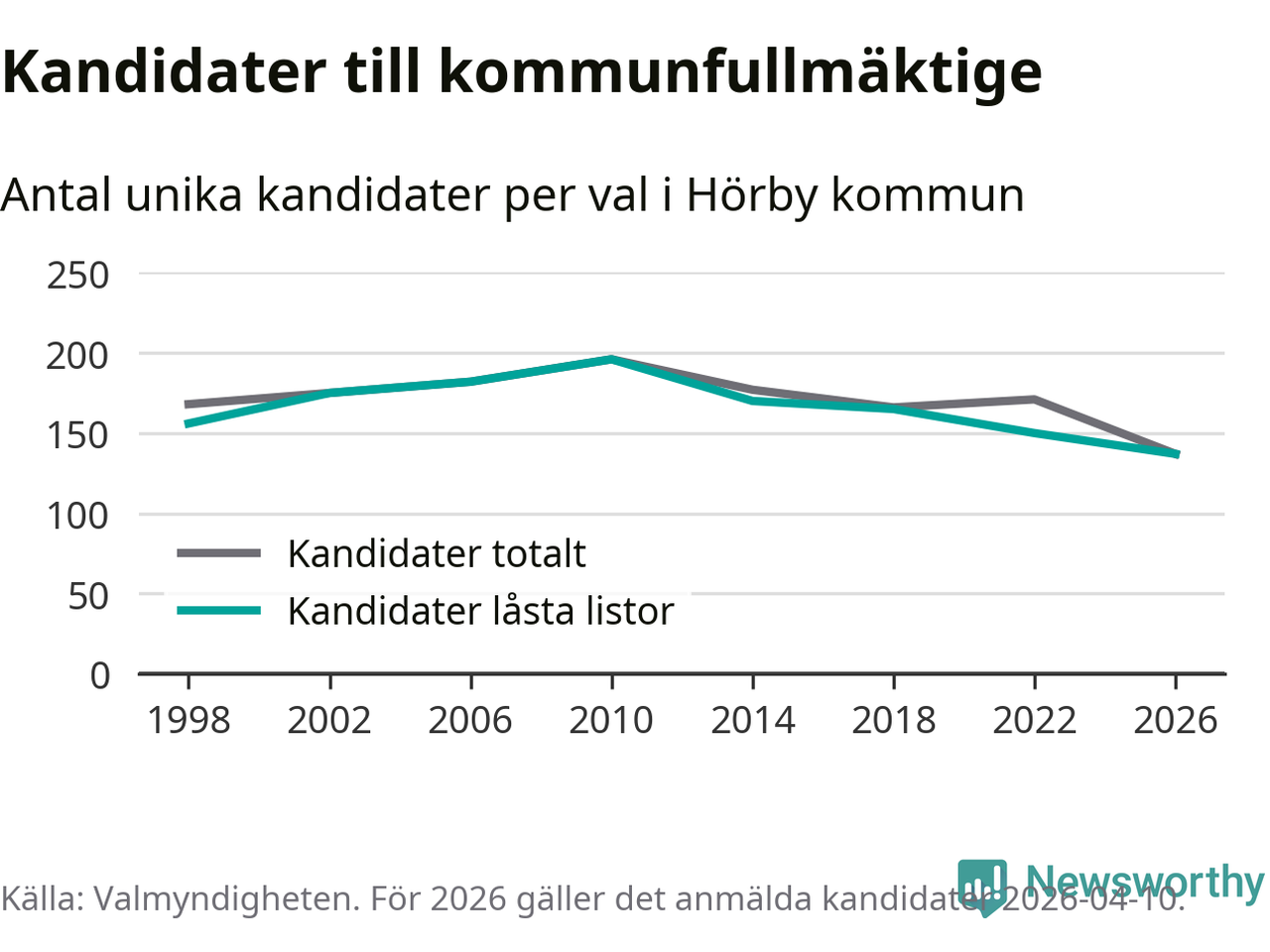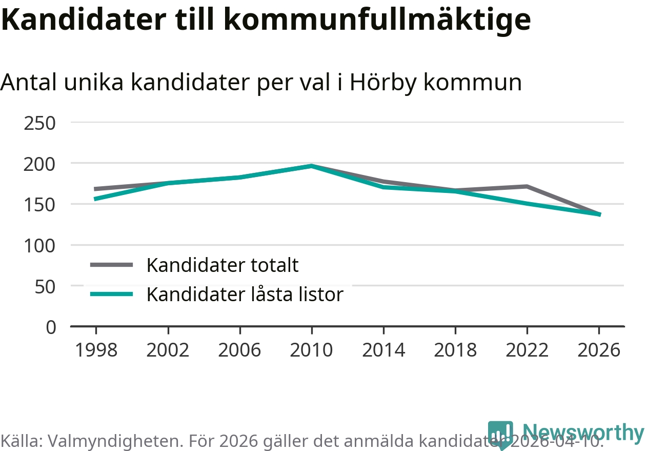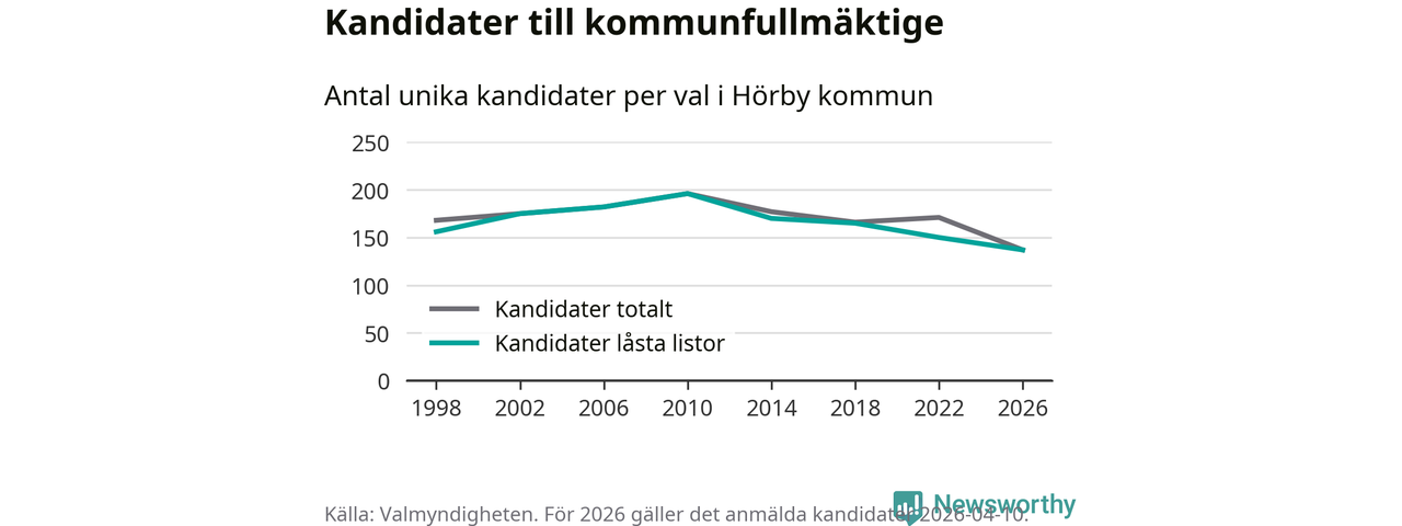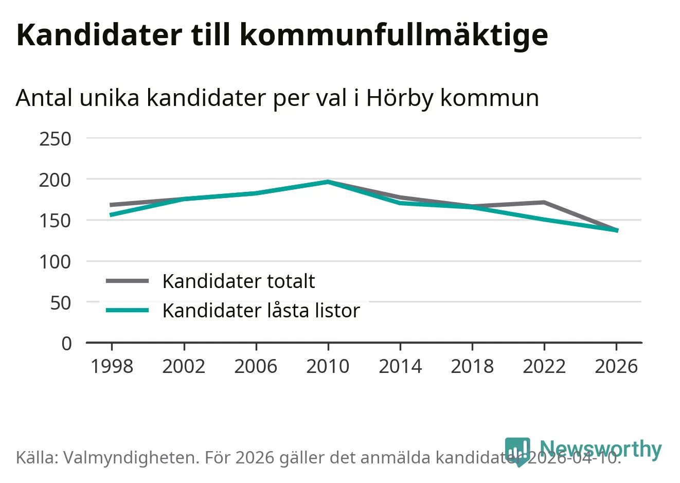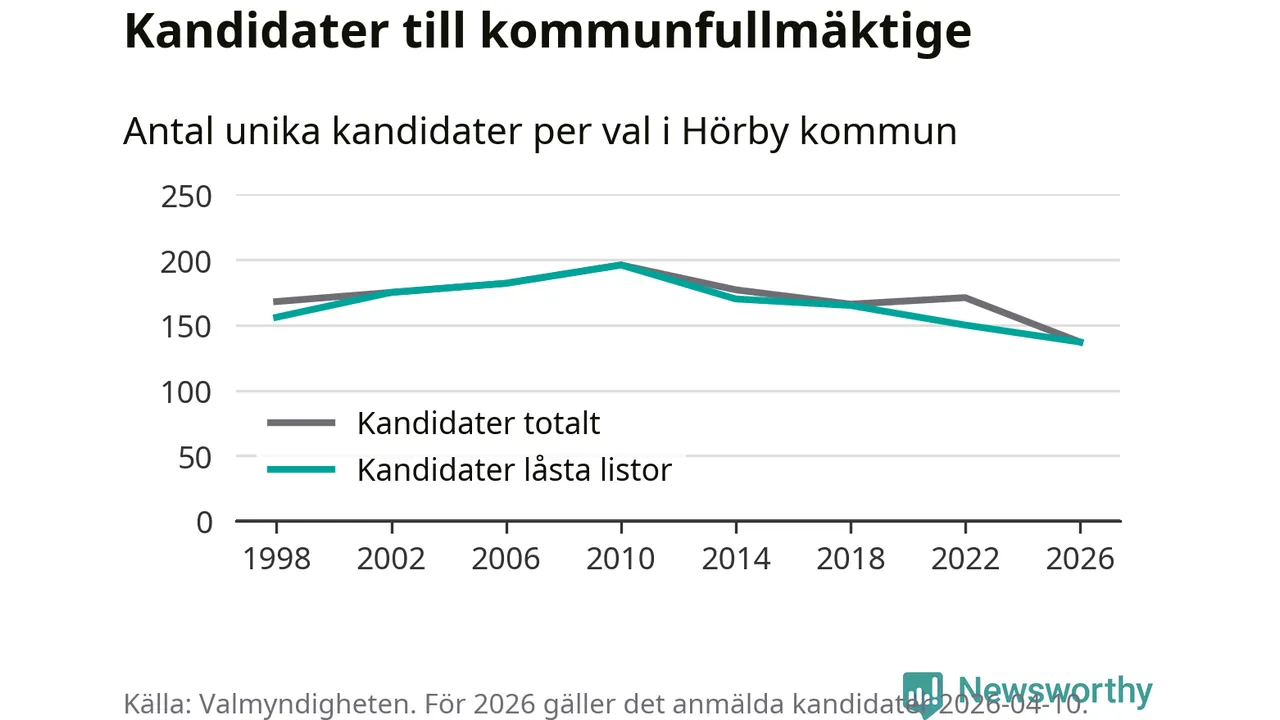 På torsdagen var det deadline för partier med låsta listor att registrera sina kandidater inför höstens val. Till valet till kommunfullmäktige i Hörby är 137 kandidater anmälda på sådana listor, vilket är 13 färre än i valet 2022. Det är den lägsta siffran sedan åtminstone valet 1998, vilket är så långt tillbaka som vi har statistik för.