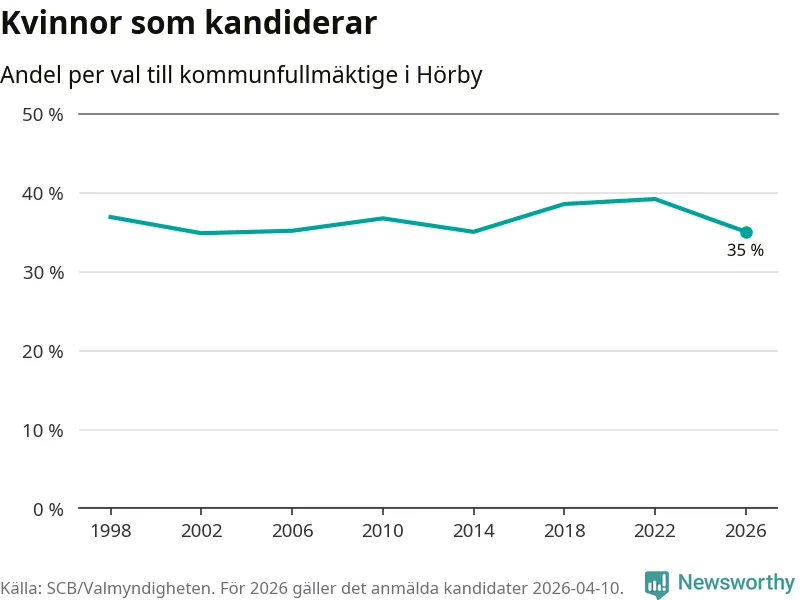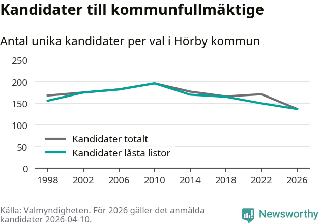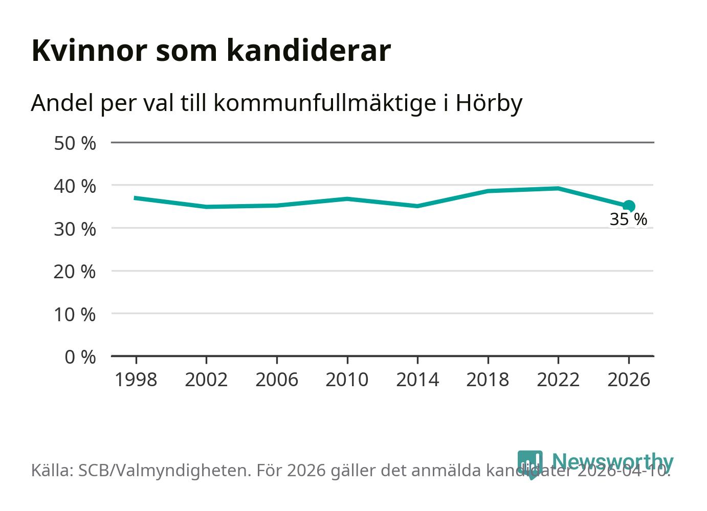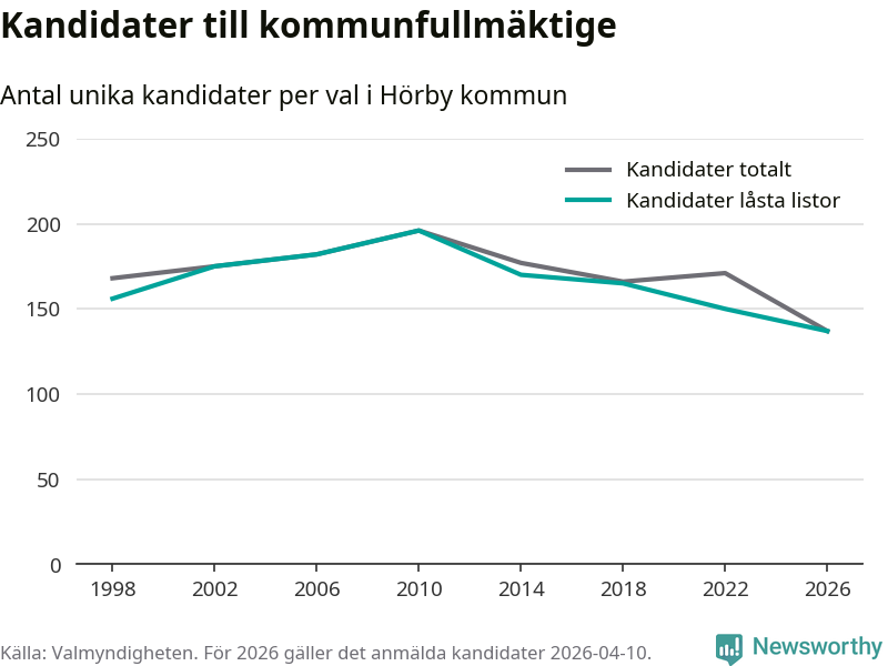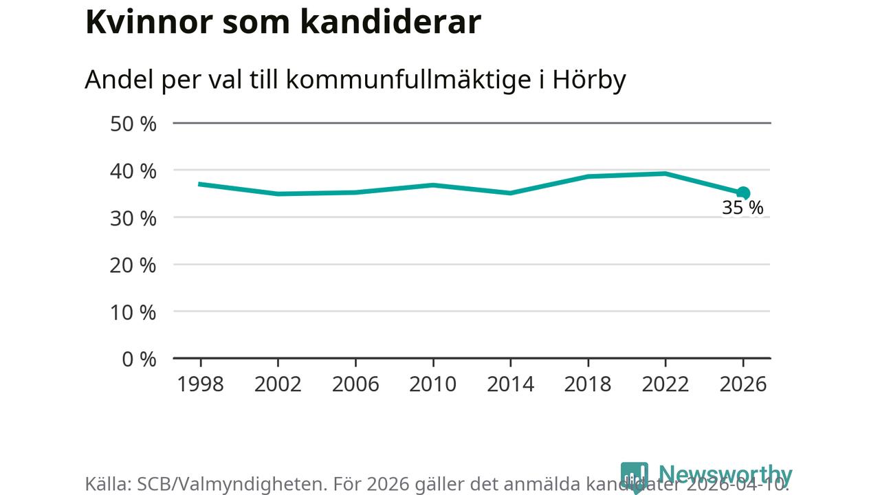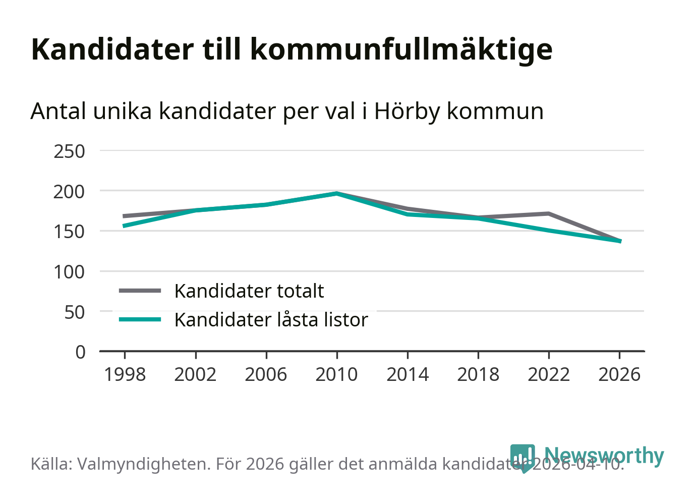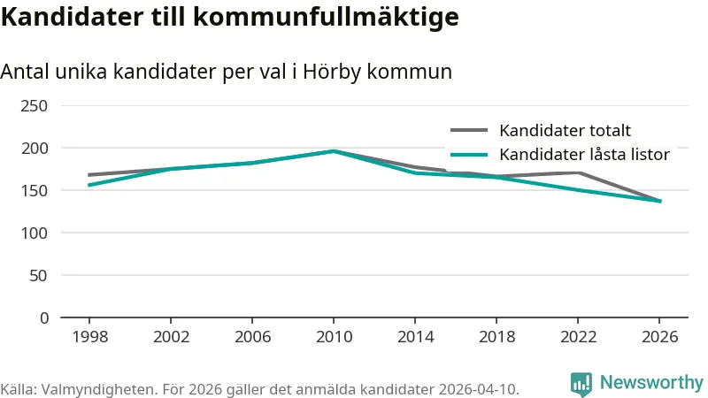 På torsdagen var det deadline för partier med låsta listor att registrera sina kandidater inför höstens val. Till valet till kommunfullmäktige i Hörby är 137 kandidater anmälda på sådana listor, vilket är 13 färre än i valet 2022. Det är den lägsta siffran sedan åtminstone valet 1998, vilket är så långt tillbaka som vi har statistik för.