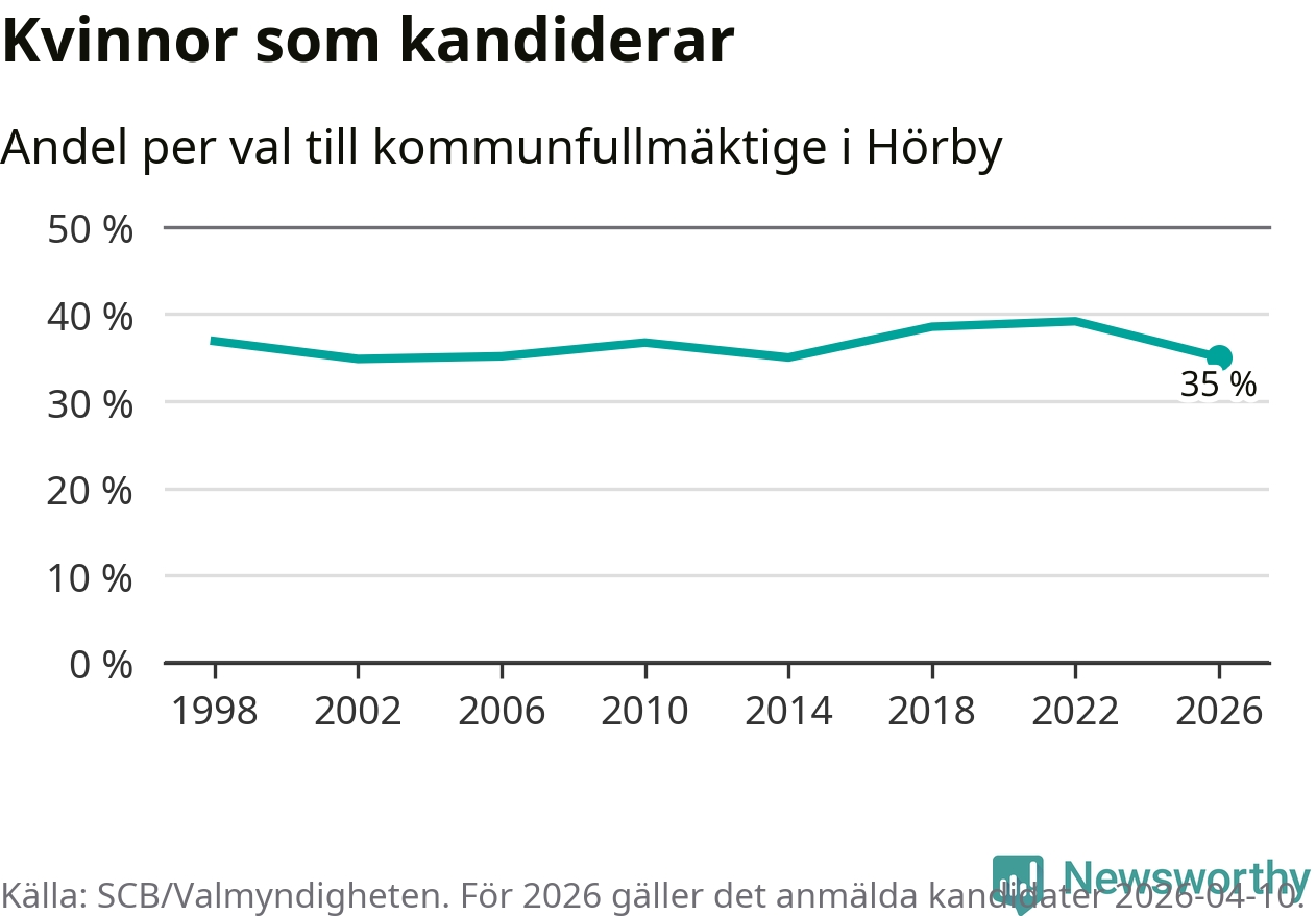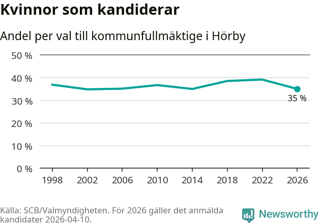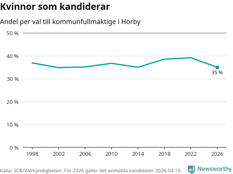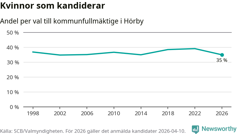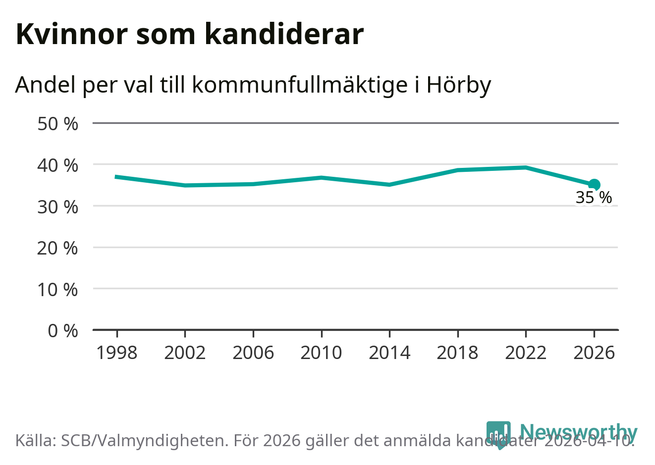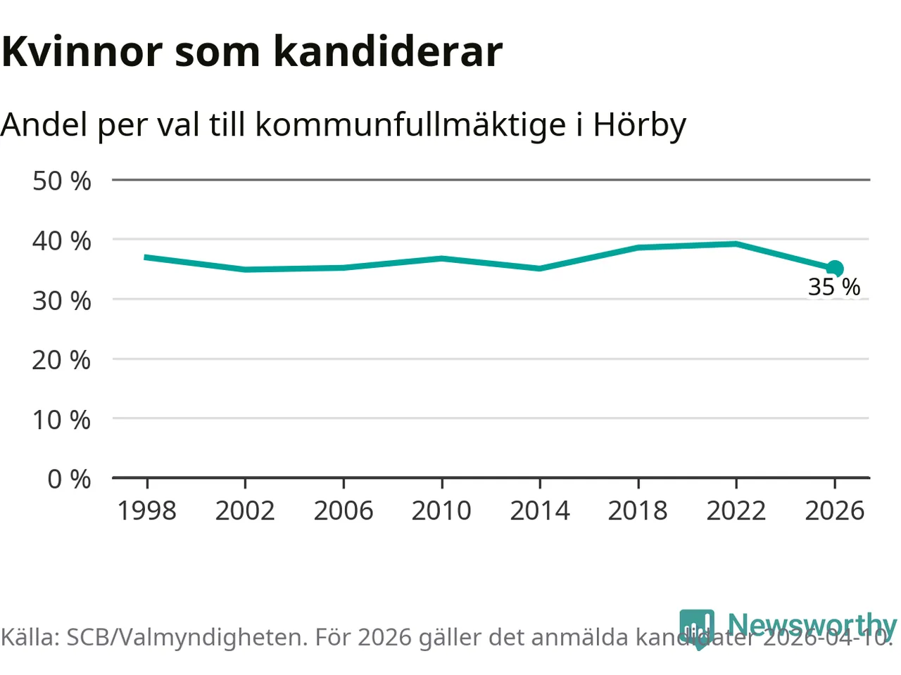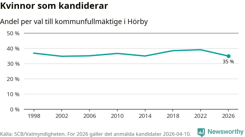 På torsdagen var det deadline för partier med låsta listor att registrera sina kandidater inför höstens val. Till valet till kommunfullmäktige i Hörby är 137 kandidater anmälda på sådana listor, vilket är 13 färre än i valet 2022. Det är den lägsta siffran sedan åtminstone valet 1998, vilket är så långt tillbaka som vi har statistik för.