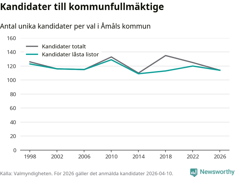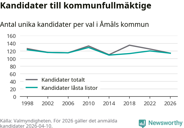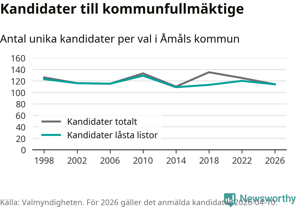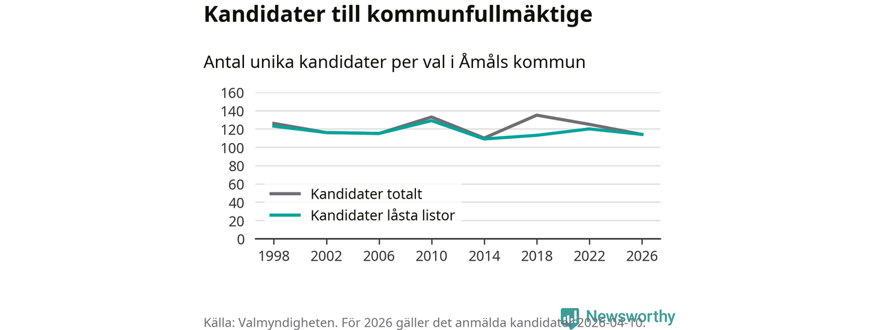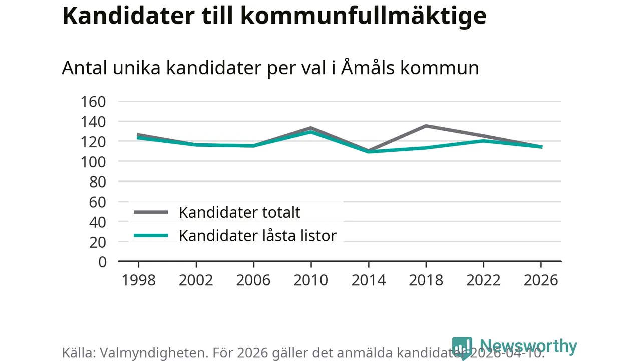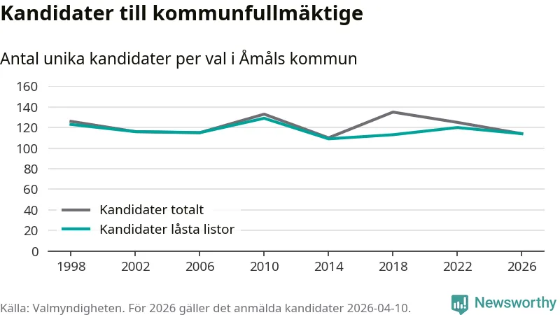 På torsdagen var det deadline för partier med låsta listor att registrera sina kandidater inför höstens val. Till valet till kommunfullmäktige i Åmål är 114 kandidater anmälda på sådana listor, vilket är sex färre än i valet 2022.