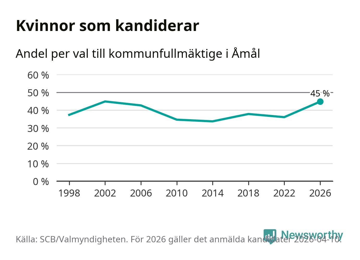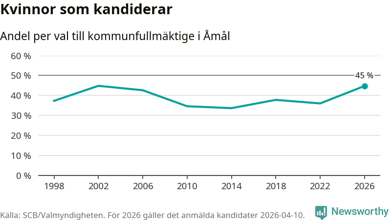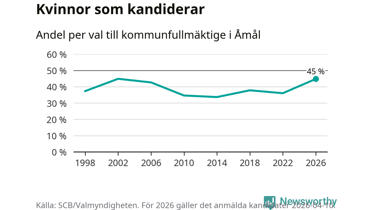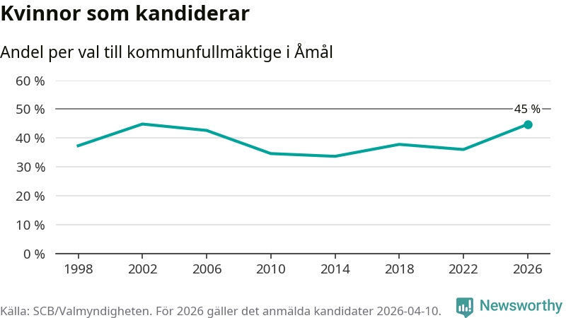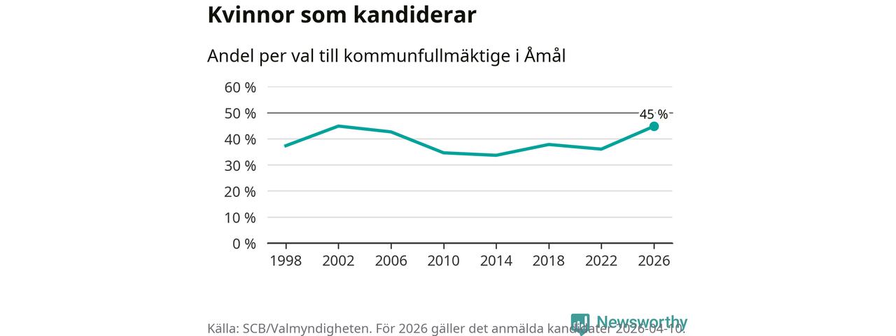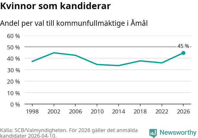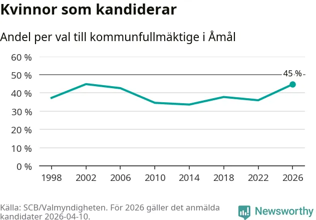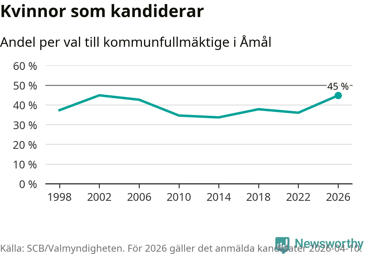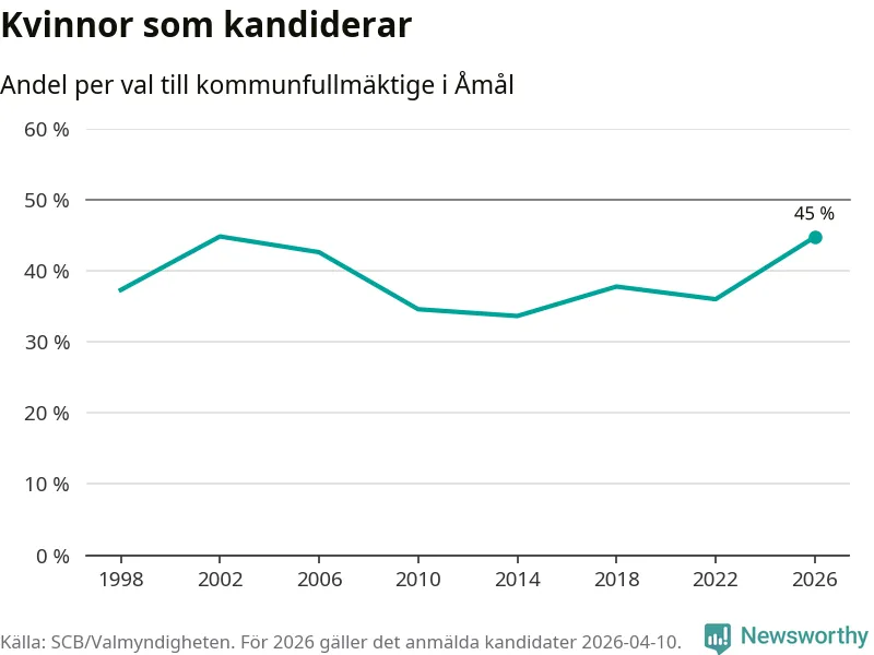 Kvinnorna utgör 45 procent av de hittills anmälda kandidaterna, vilket är den högsta andelen på listorna till kommunfullmäktige i Åmål sedan valet 2002. Vid valet 2002 var 45 procent kvinnor, valet 2014 var motsvarande siffra 34 procent. Åmål är en av 264 kommuner i landet där männen utgör en majoritet av kandidaterna på listorna.