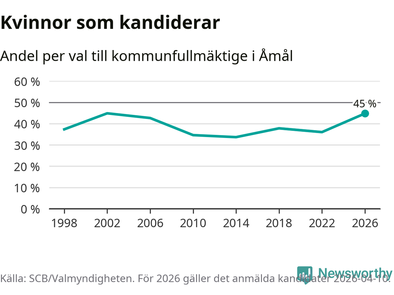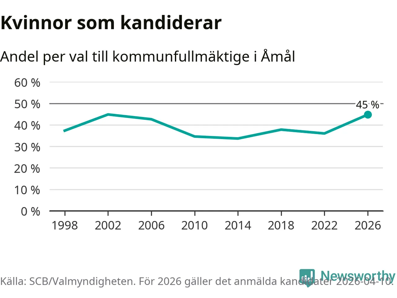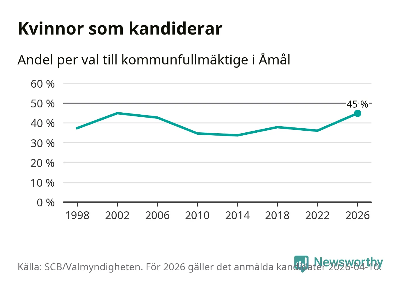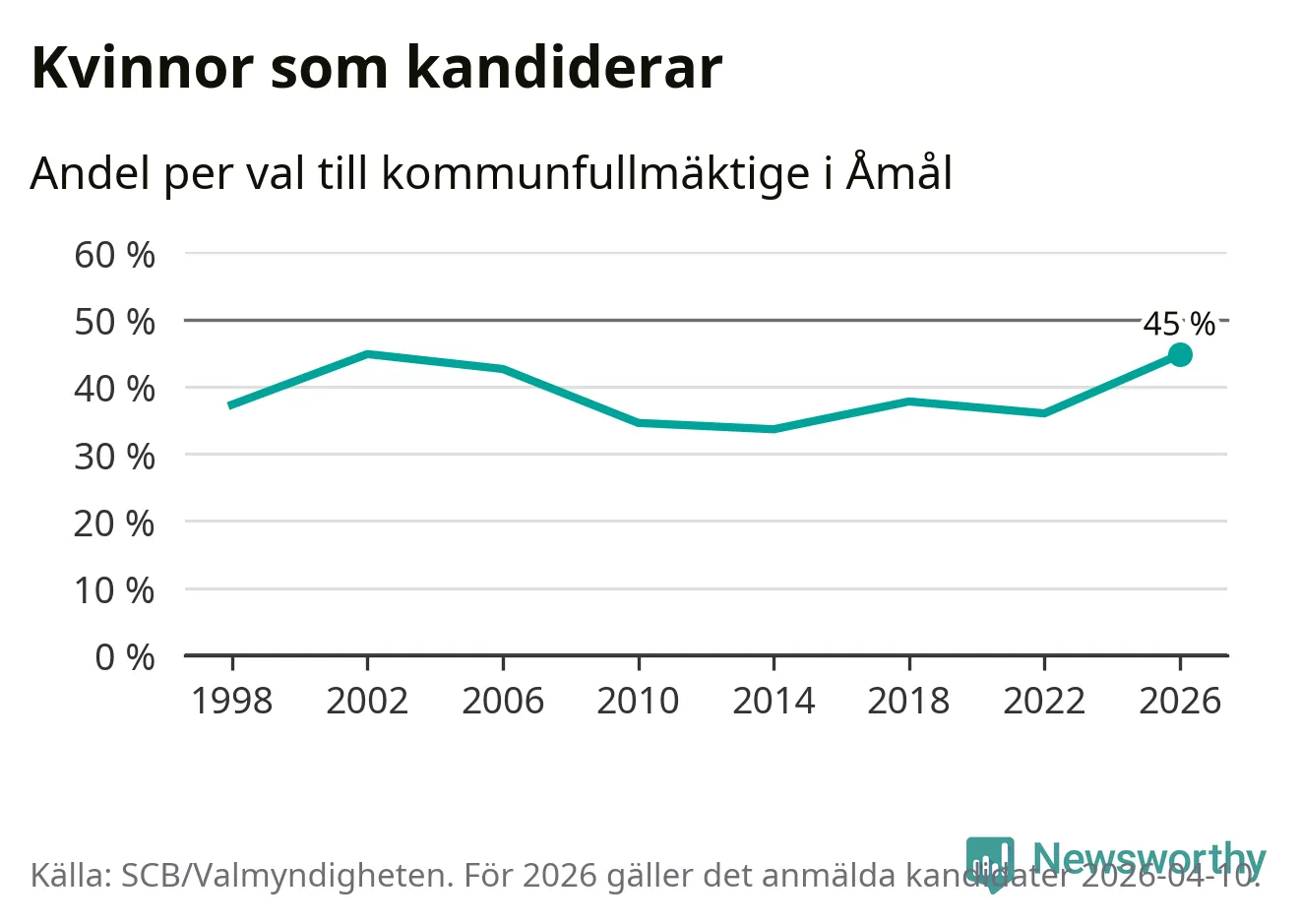Kvinnorna utgör 45 procent av de hittills anmälda kandidaterna, vilket är den högsta andelen på listorna till kommunfullmäktige i Åmål sedan valet 2002. Vid valet 2002 var 45 procent kvinnor, valet 2014 var motsvarande siffra 34 procent. Åmål är en av 264 kommuner i landet där männen utgör en majoritet av kandidaterna på listorna.