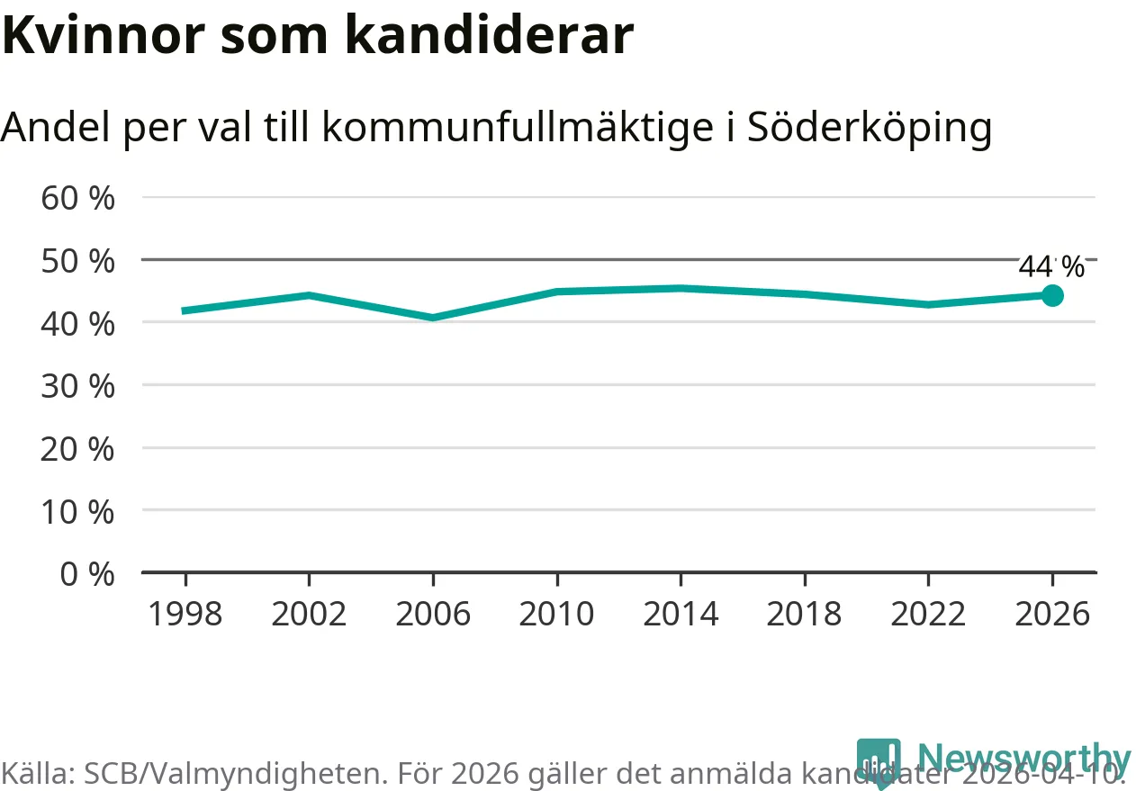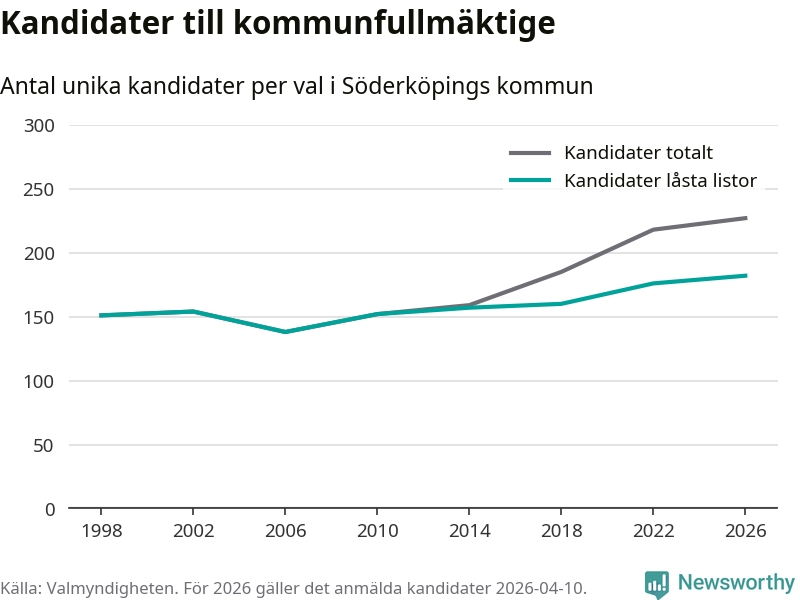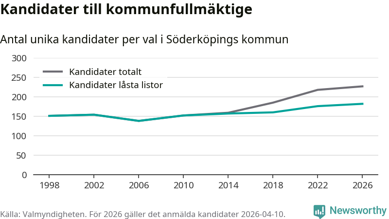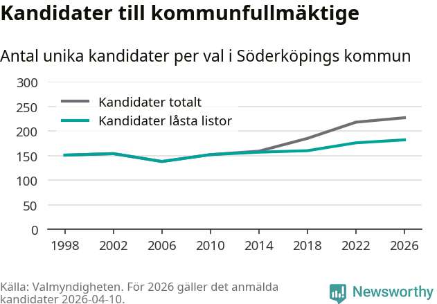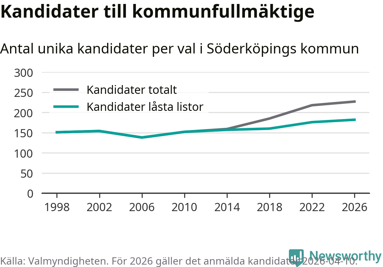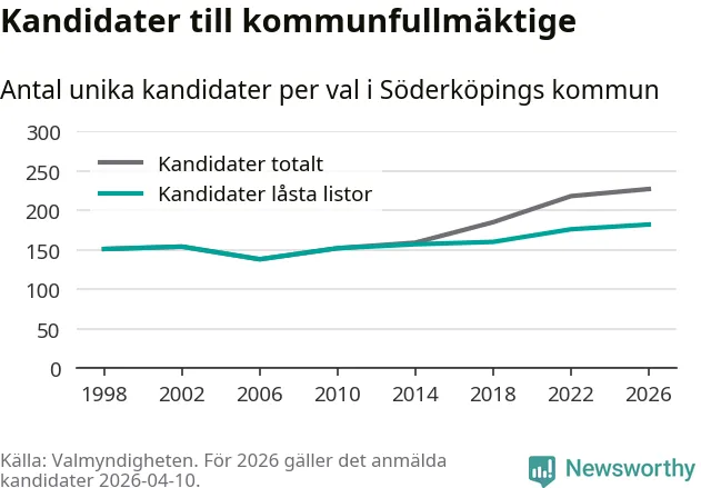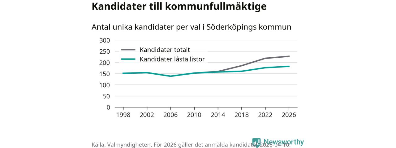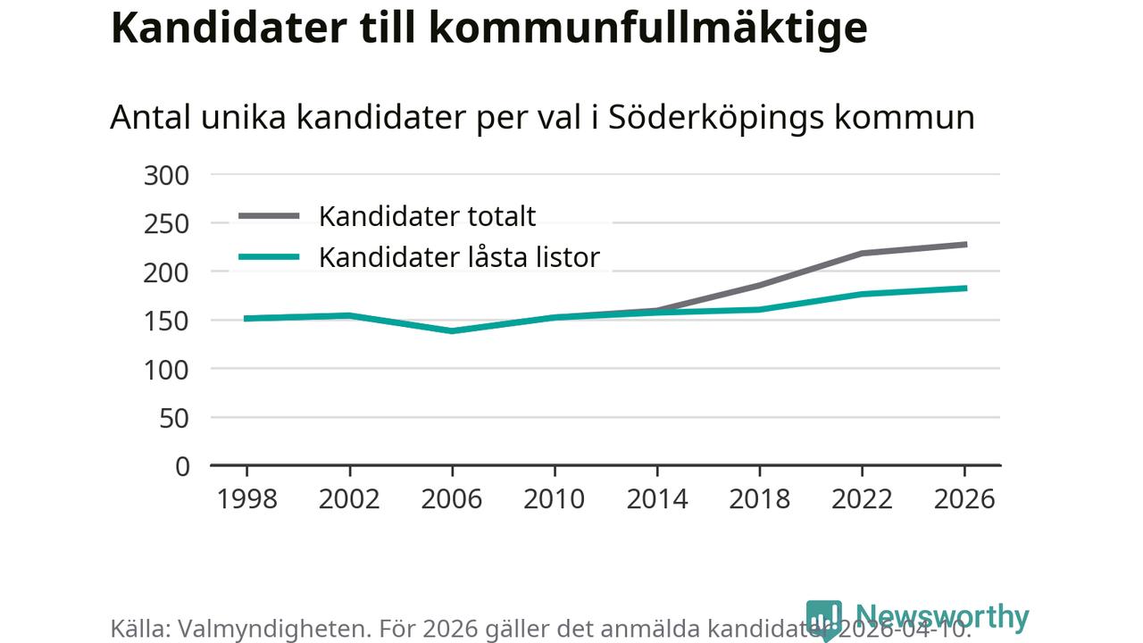 På torsdagen var det deadline för partier med låsta listor att registrera sina kandidater inför höstens val. Till valet till kommunfullmäktige i Söderköping är 182 kandidater anmälda på sådana listor, vilket är sex fler än i valet 2022. Det är den högsta siffran sedan åtminstone valet 1998, vilket är så långt tillbaka som vi har statistik för.