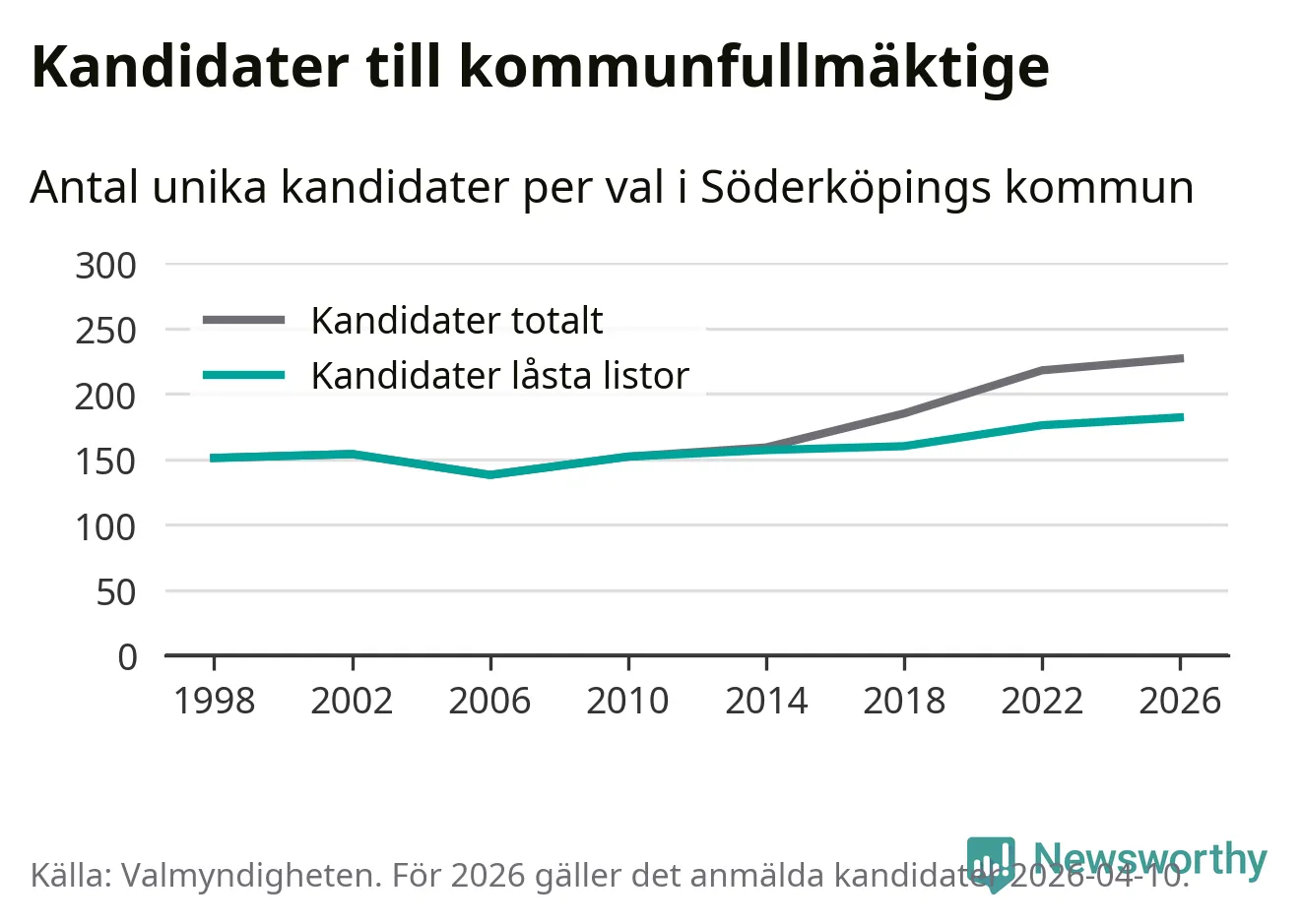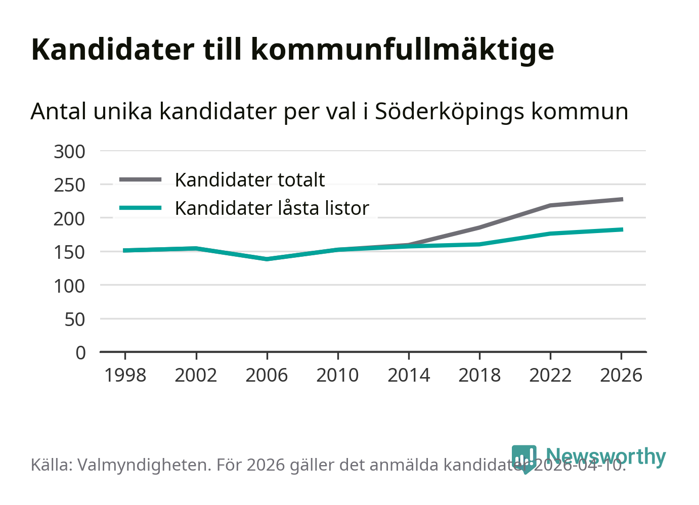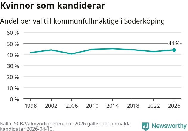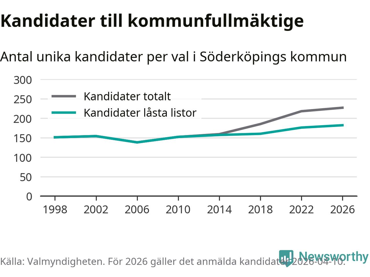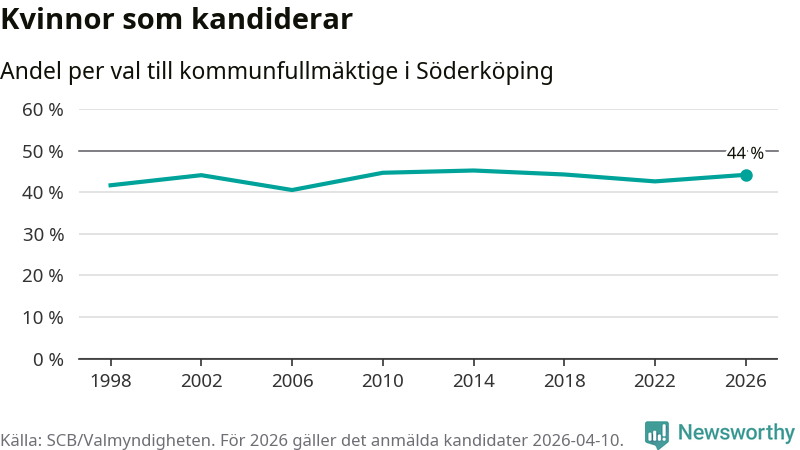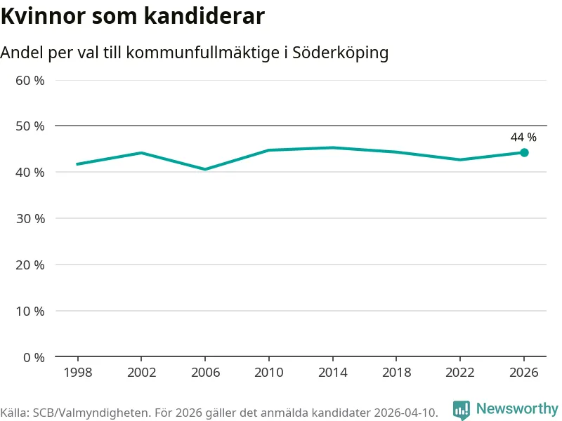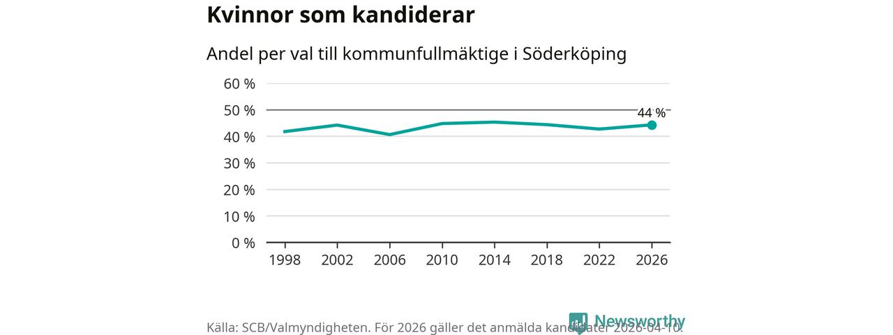 På torsdagen var det deadline för partier med låsta listor att registrera sina kandidater inför höstens val. Till valet till kommunfullmäktige i Söderköping är 182 kandidater anmälda på sådana listor, vilket är sex fler än i valet 2022. Det är den högsta siffran sedan åtminstone valet 1998, vilket är så långt tillbaka som vi har statistik för.