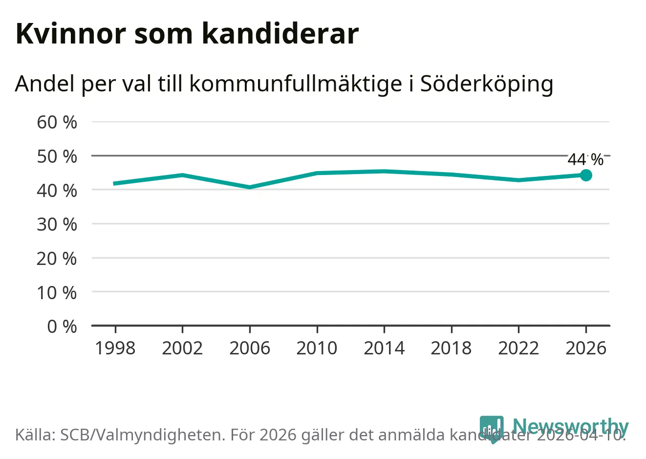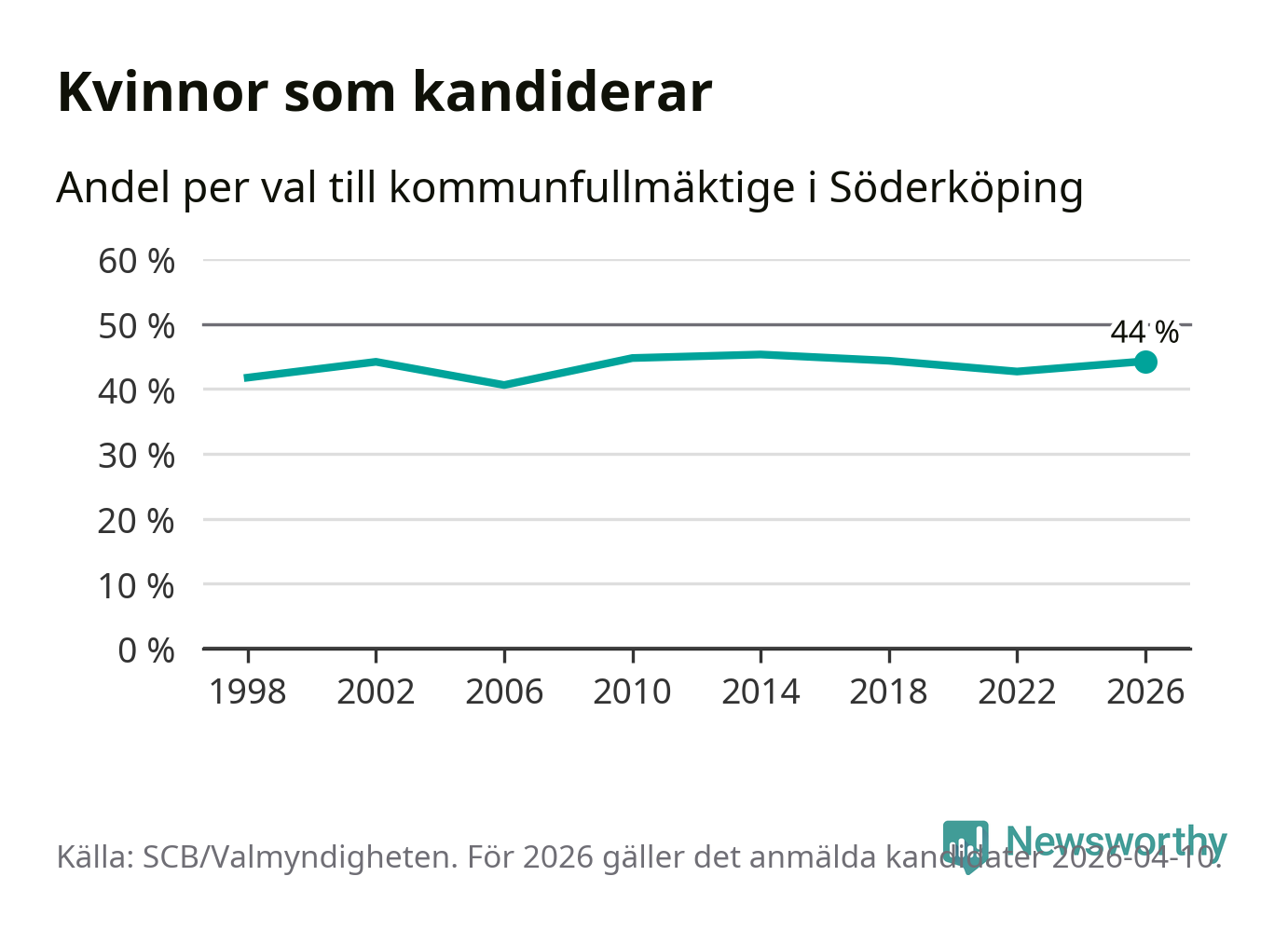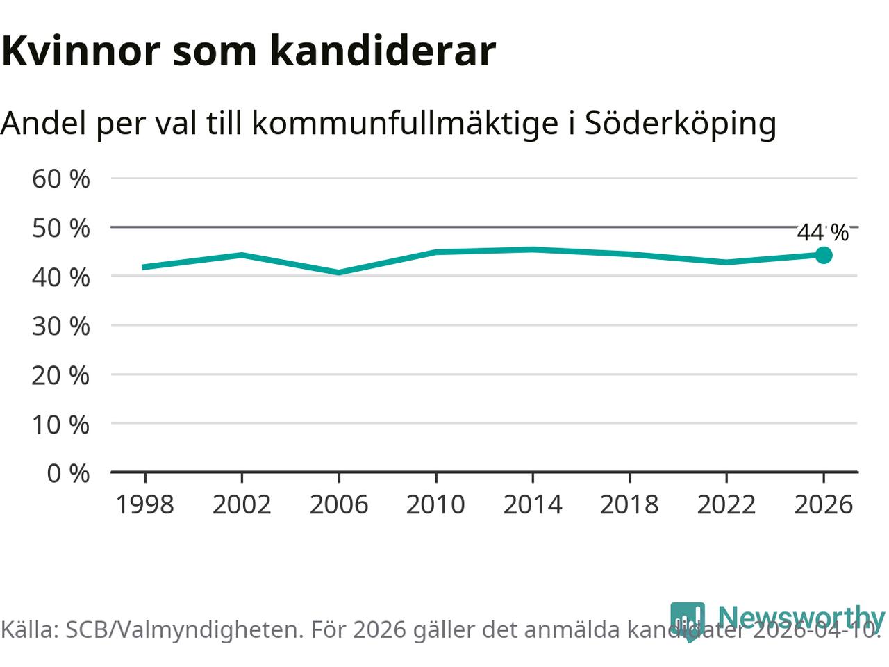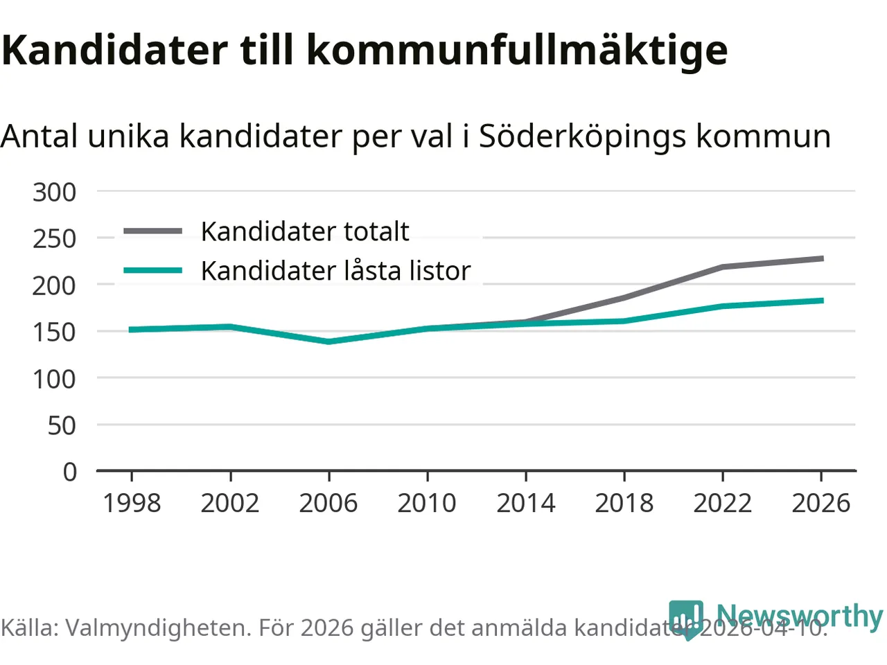 På torsdagen var det deadline för partier med låsta listor att registrera sina kandidater inför höstens val. Till valet till kommunfullmäktige i Söderköping är 182 kandidater anmälda på sådana listor, vilket är sex fler än i valet 2022. Det är den högsta siffran sedan åtminstone valet 1998, vilket är så långt tillbaka som vi har statistik för.