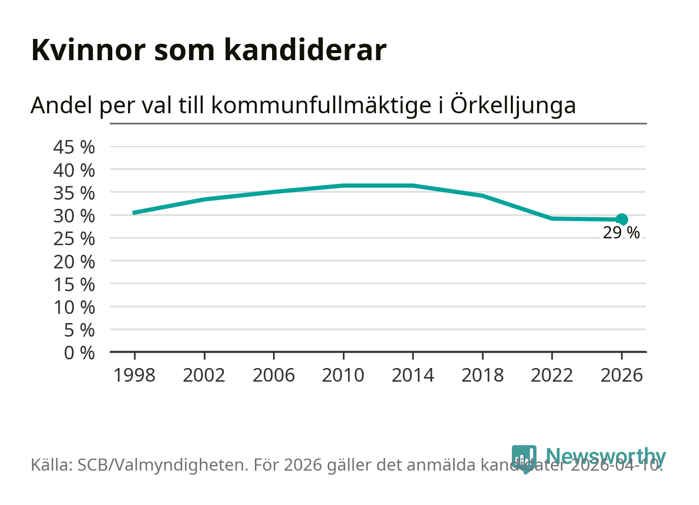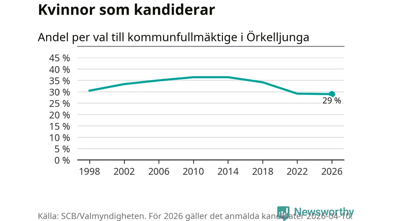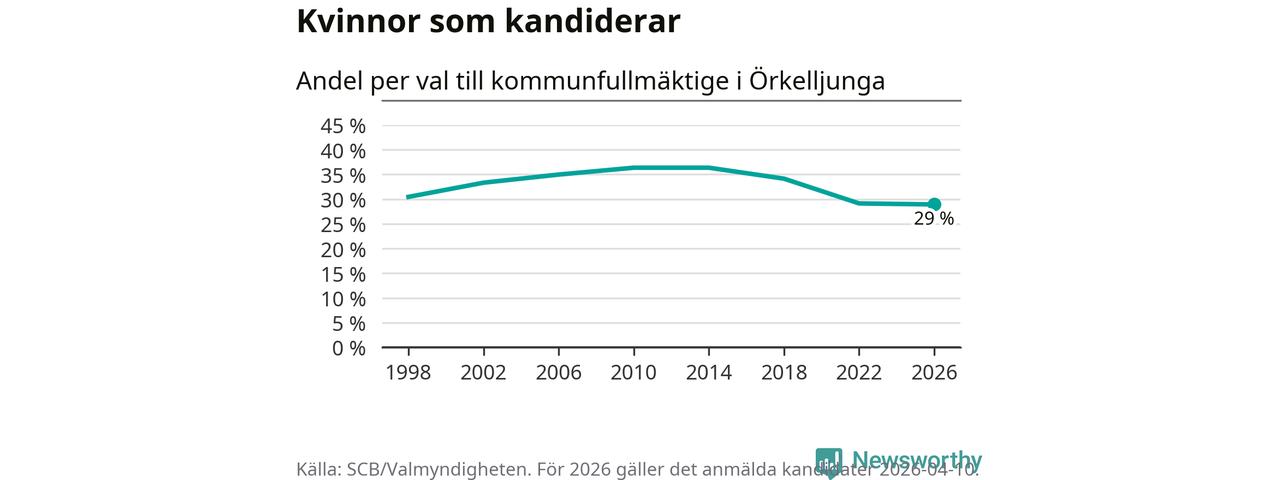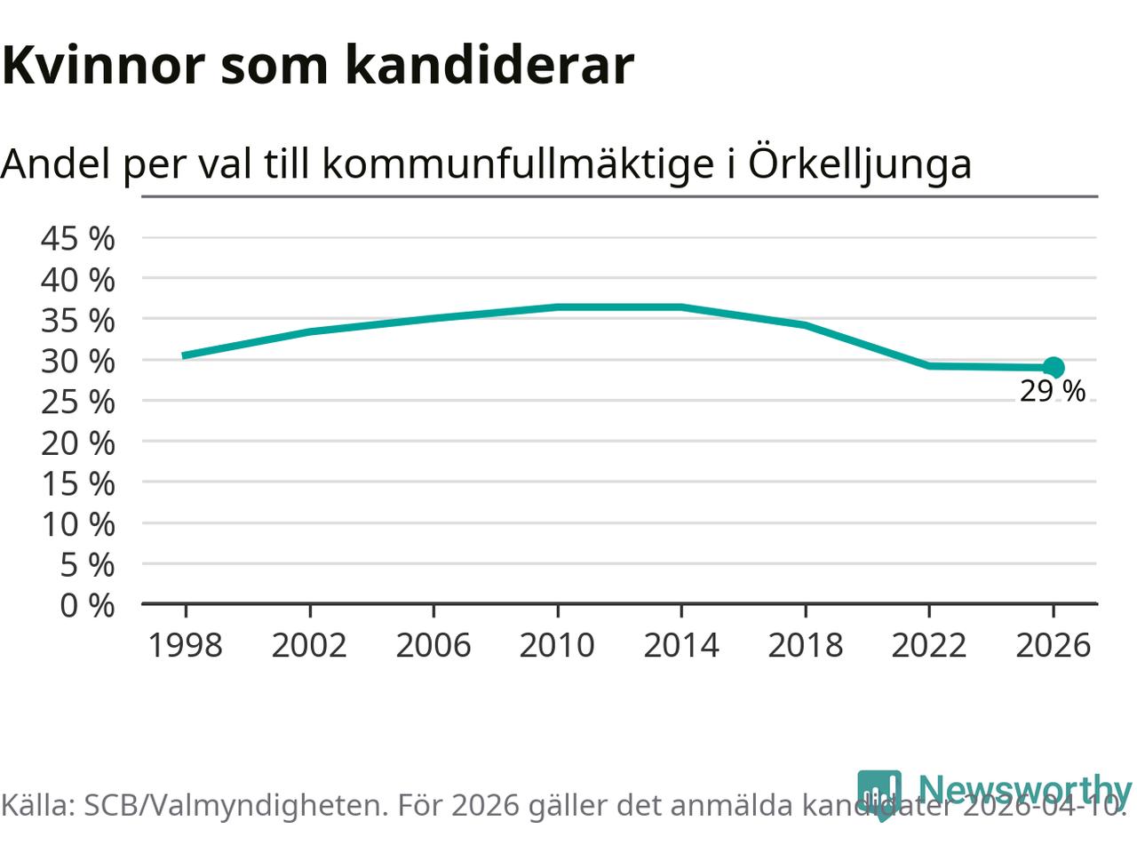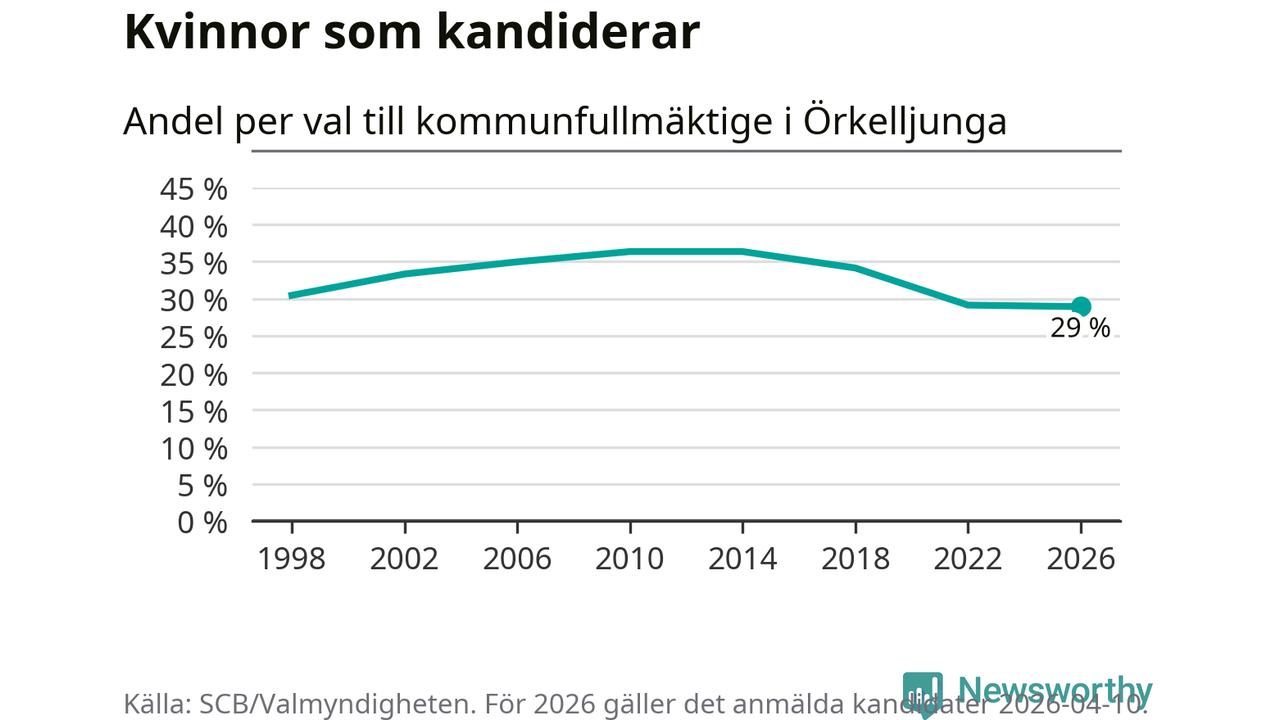 Kvinnorna utgör 29 procent av de hittills anmälda kandidaterna, vilket är den lägsta andelen på listorna till kommunfullmäktige i Örkelljunga sedan åtminstone valet 1998. Andelen kvinnor har minskat i Örkelljunga under de senaste två valen och minskningen ser alltså ut att forsätta i år. Örkelljunga är en av 264 kommuner i landet där männen utgör en majoritet av kandidaterna på listorna.