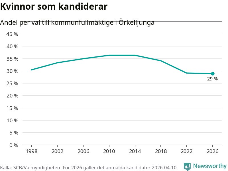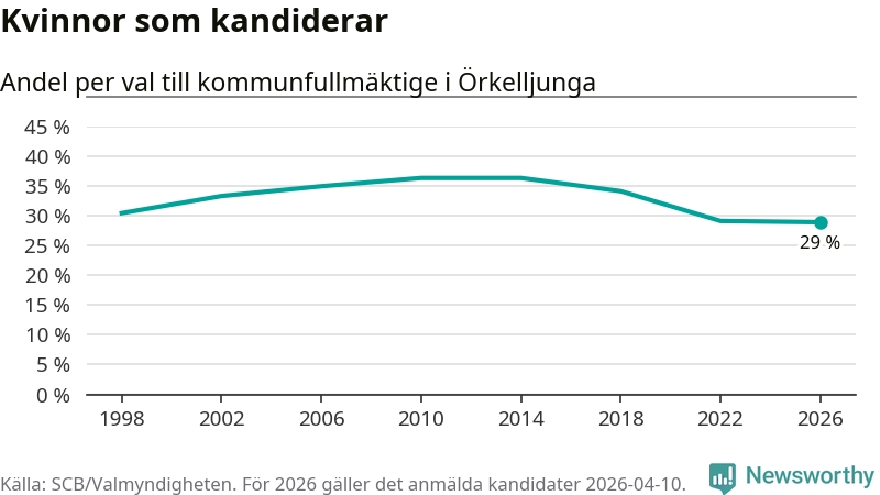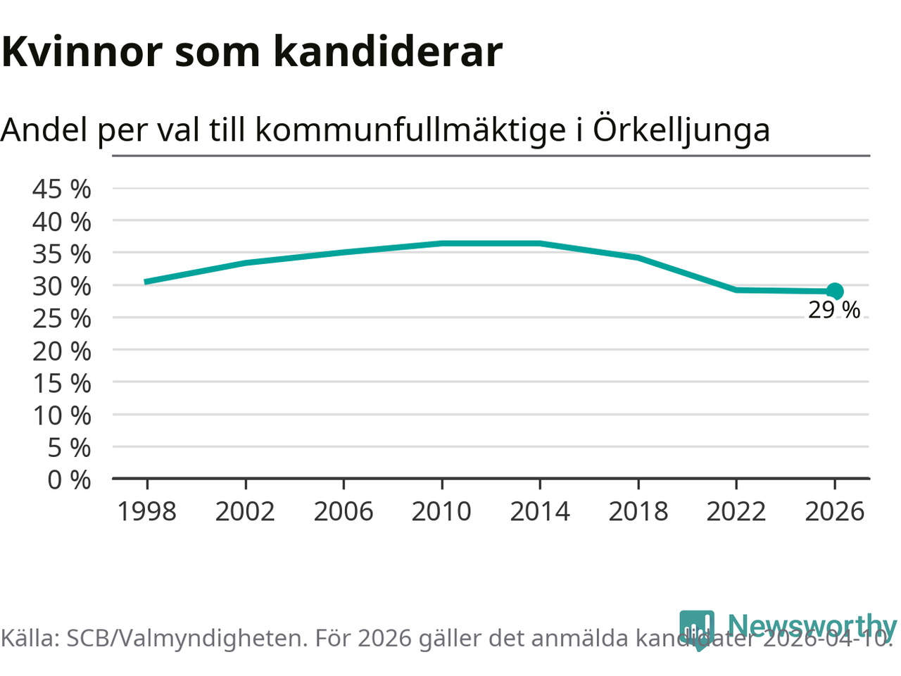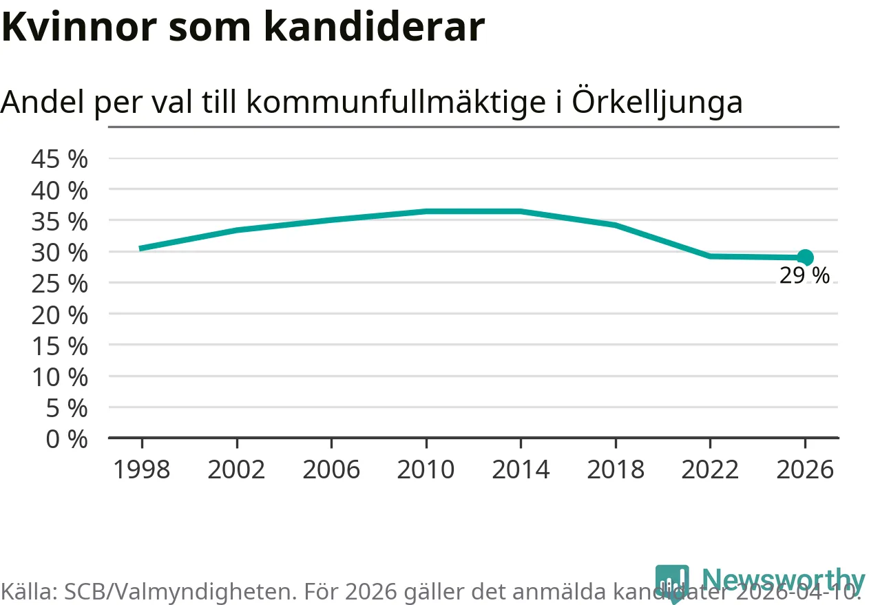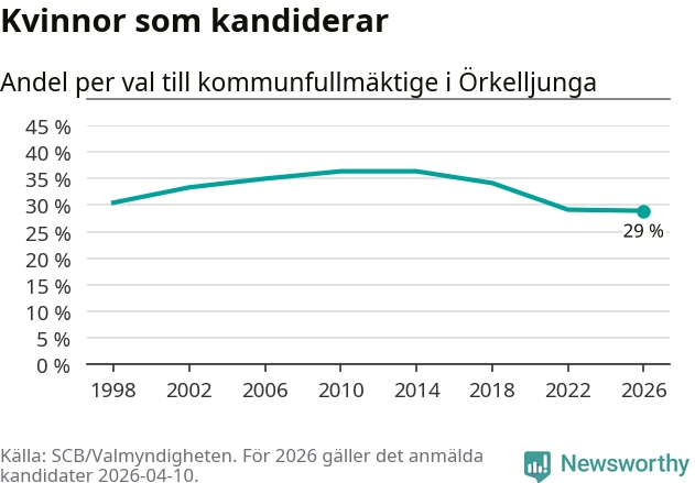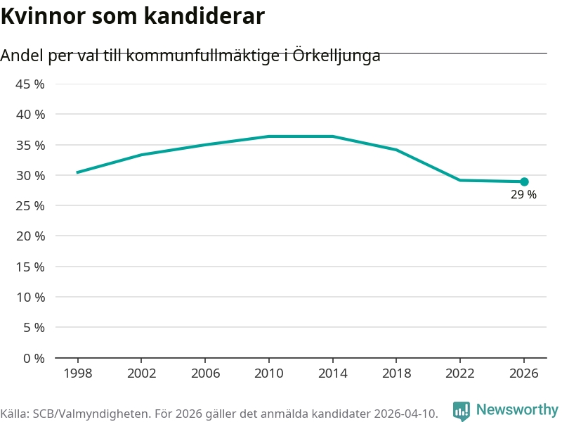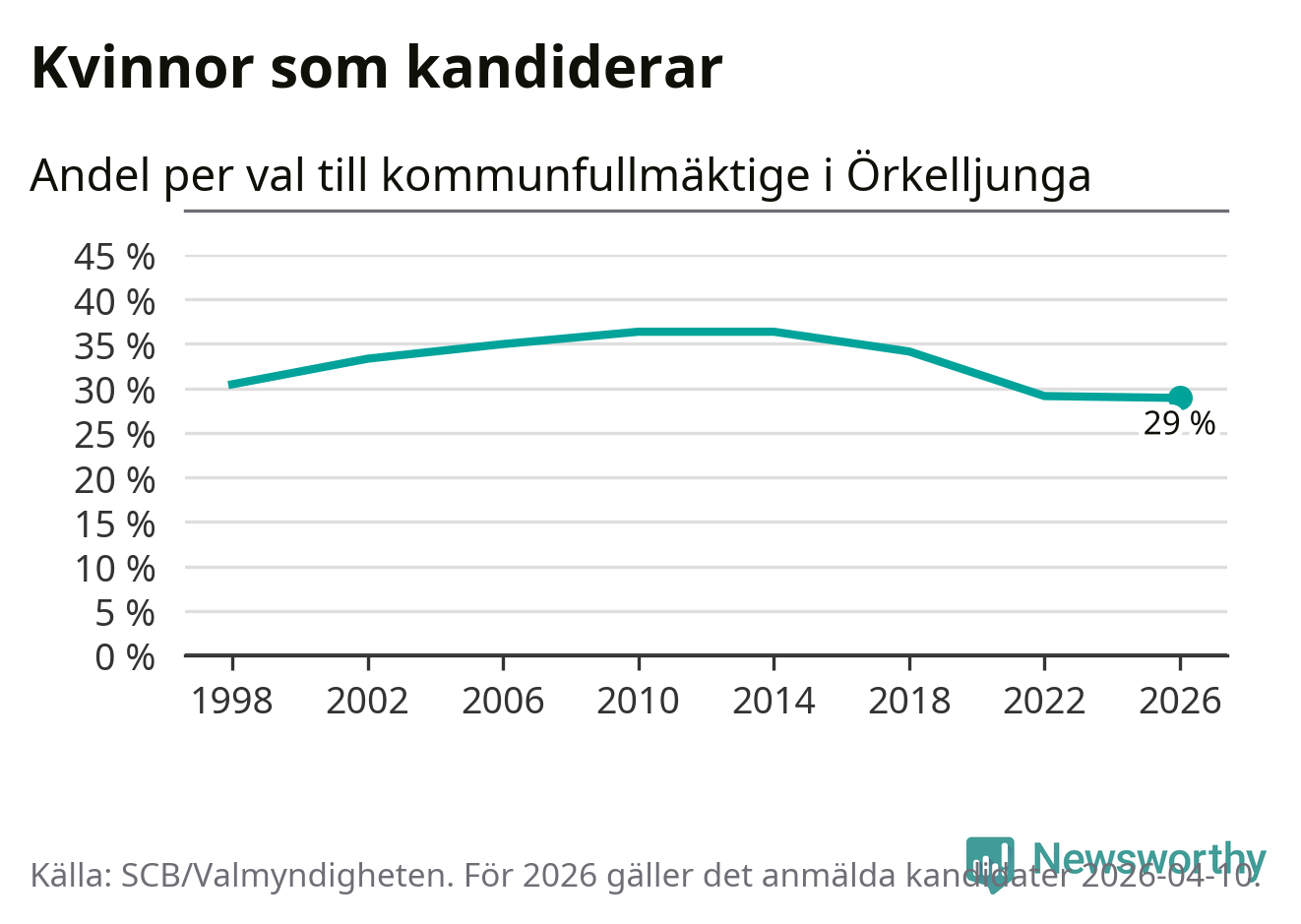 Kvinnorna utgör 29 procent av de hittills anmälda kandidaterna, vilket är den lägsta andelen på listorna till kommunfullmäktige i Örkelljunga sedan åtminstone valet 1998. Andelen kvinnor har minskat i Örkelljunga under de senaste två valen och minskningen ser alltså ut att forsätta i år. Örkelljunga är en av 264 kommuner i landet där männen utgör en majoritet av kandidaterna på listorna.
