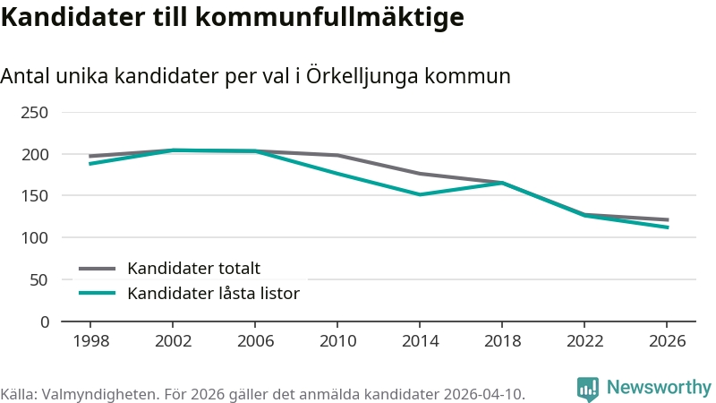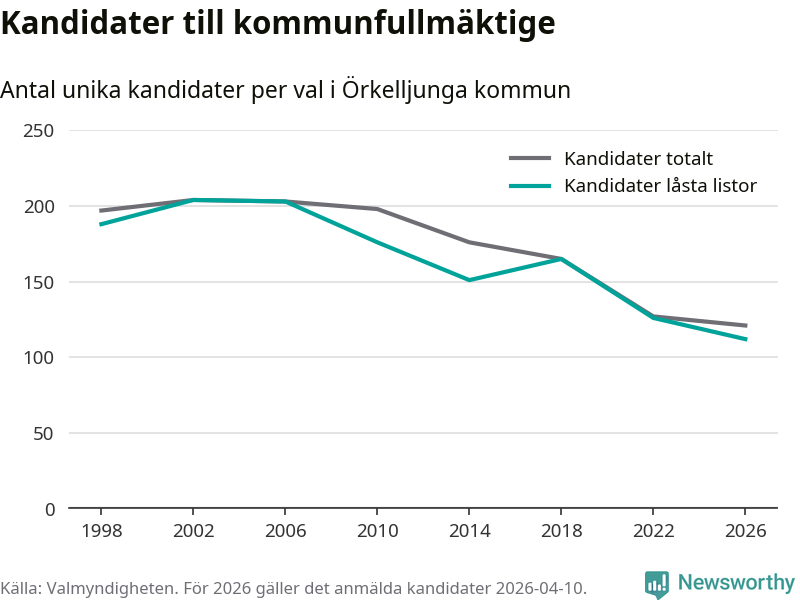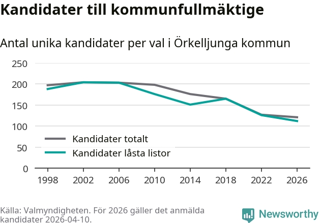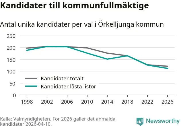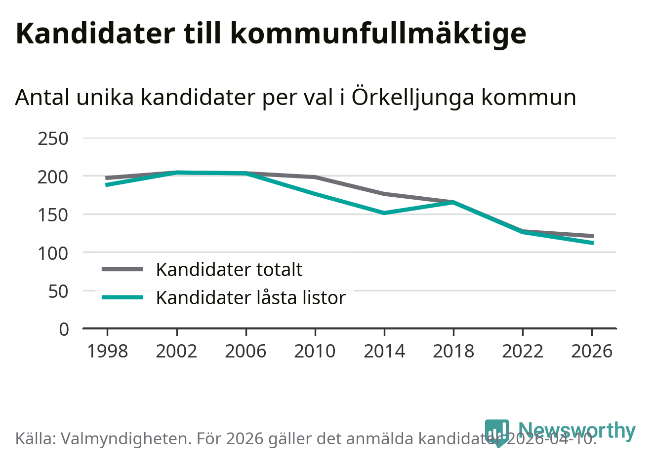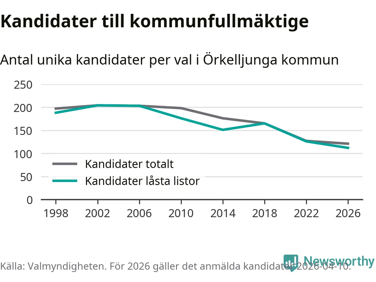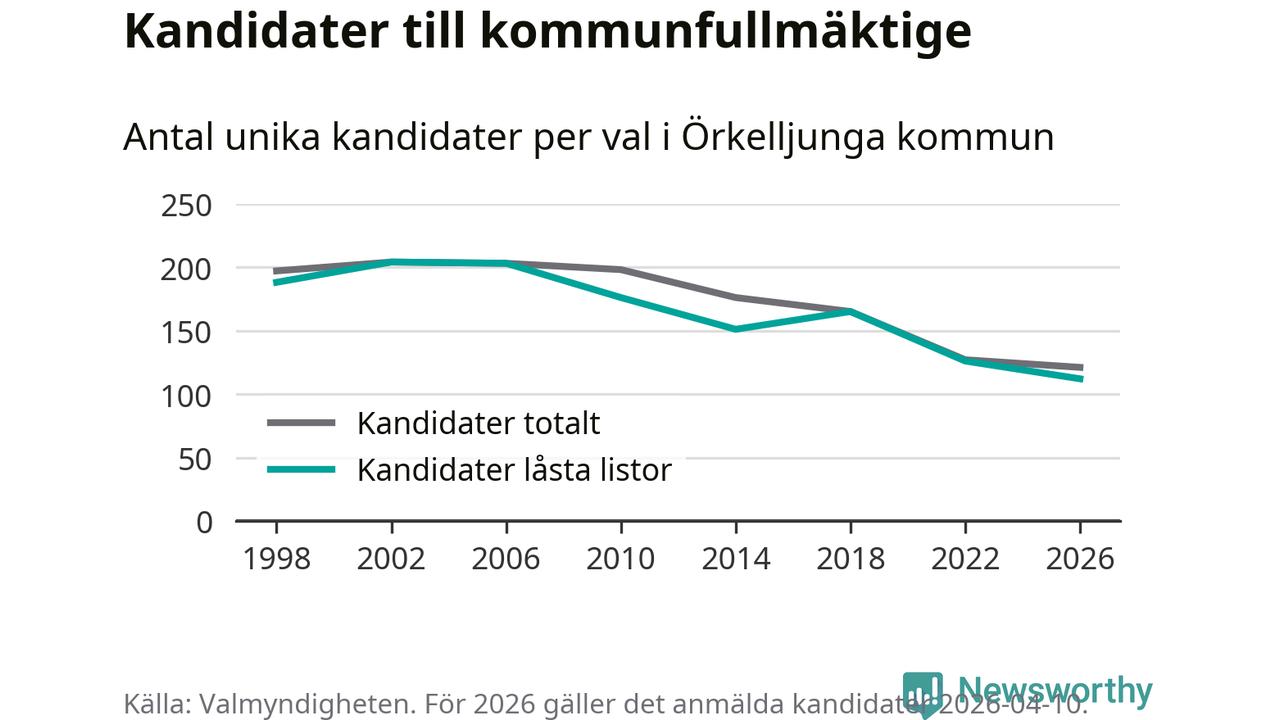 På torsdagen var det deadline för partier med låsta listor att registrera sina kandidater inför höstens val. Till valet till kommunfullmäktige i Örkelljunga är 112 kandidater anmälda på sådana listor, vilket är 14 färre än i valet 2022. Det är den lägsta siffran sedan åtminstone valet 1998, vilket är så långt tillbaka som vi har statistik för.