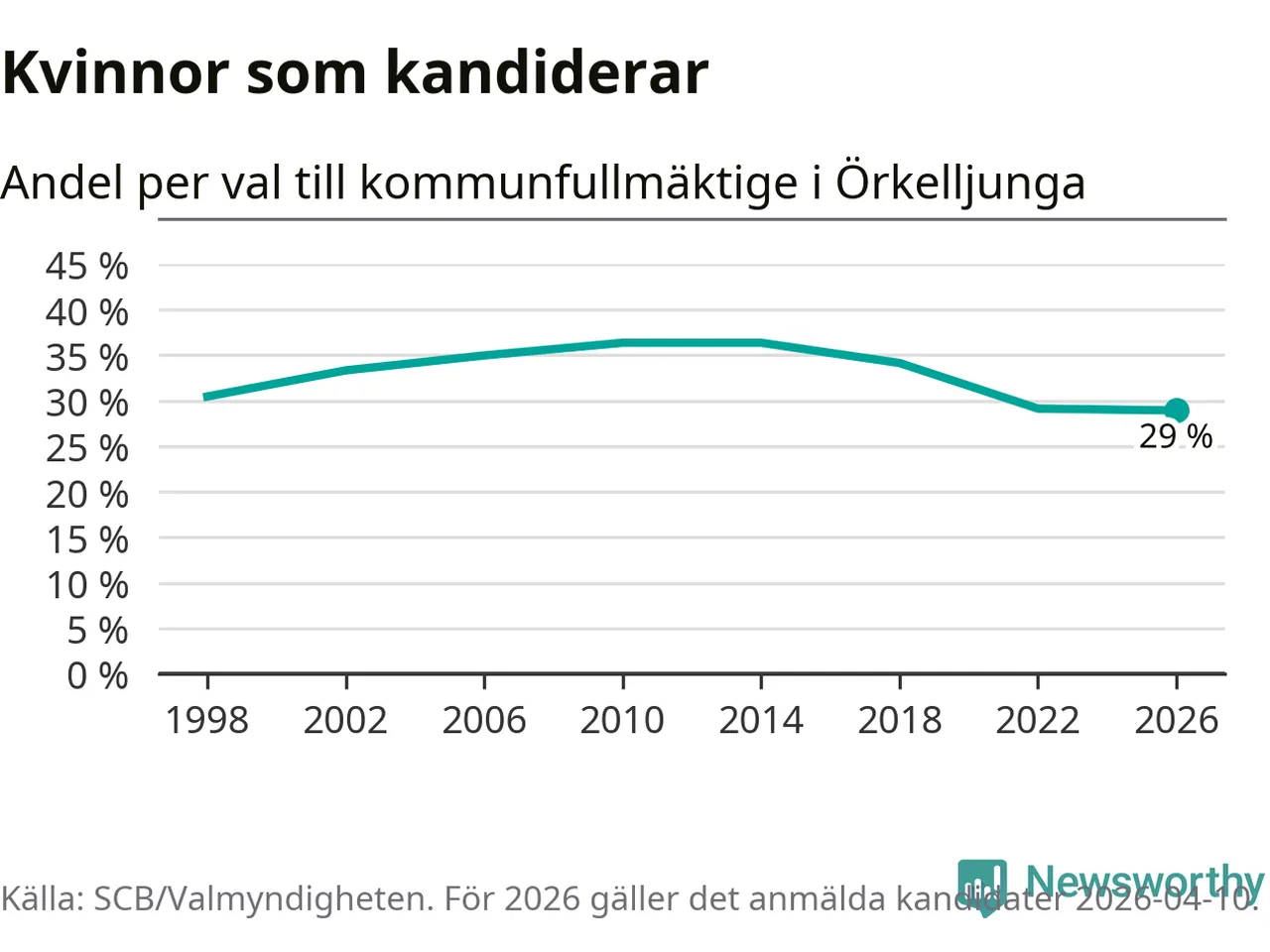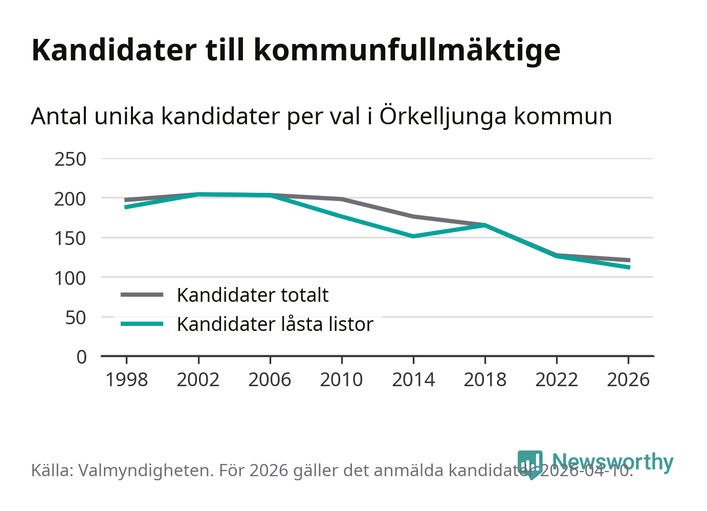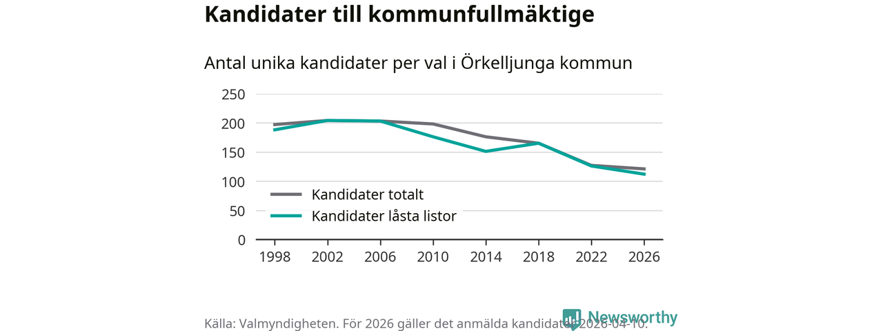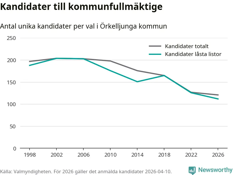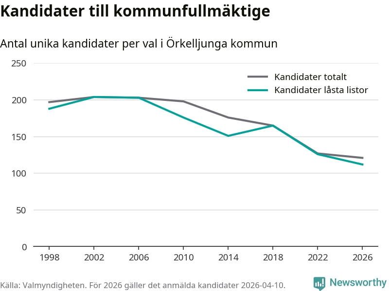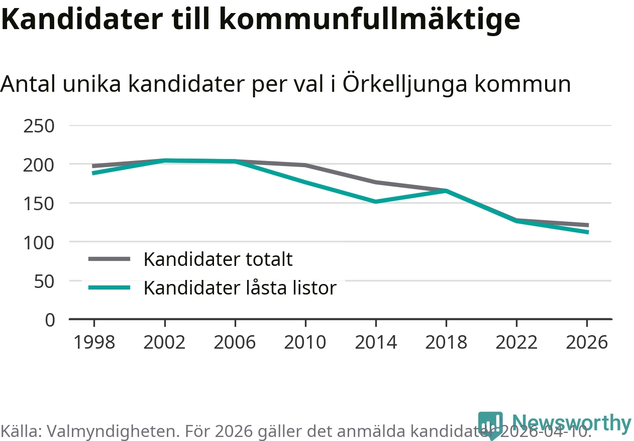 På torsdagen var det deadline för partier med låsta listor att registrera sina kandidater inför höstens val. Till valet till kommunfullmäktige i Örkelljunga är 112 kandidater anmälda på sådana listor, vilket är 14 färre än i valet 2022. Det är den lägsta siffran sedan åtminstone valet 1998, vilket är så långt tillbaka som vi har statistik för.