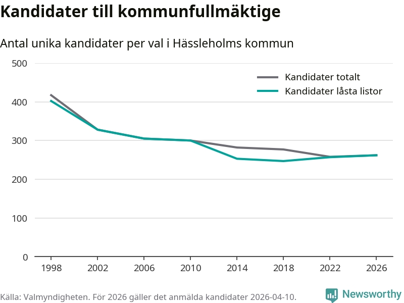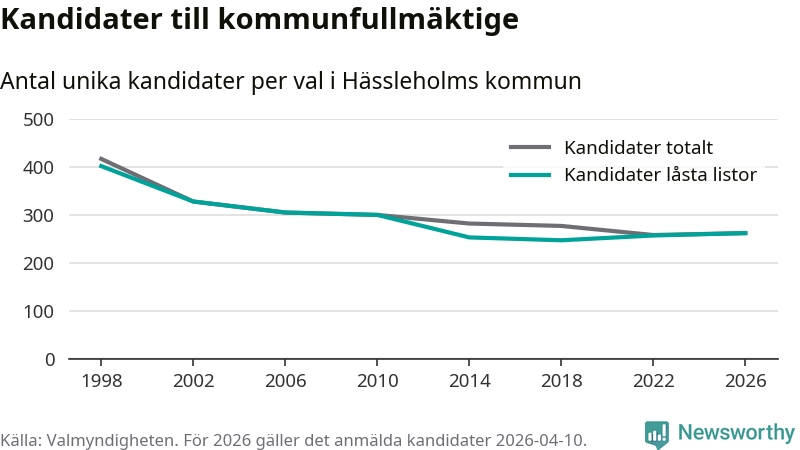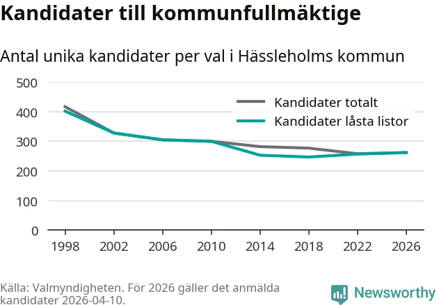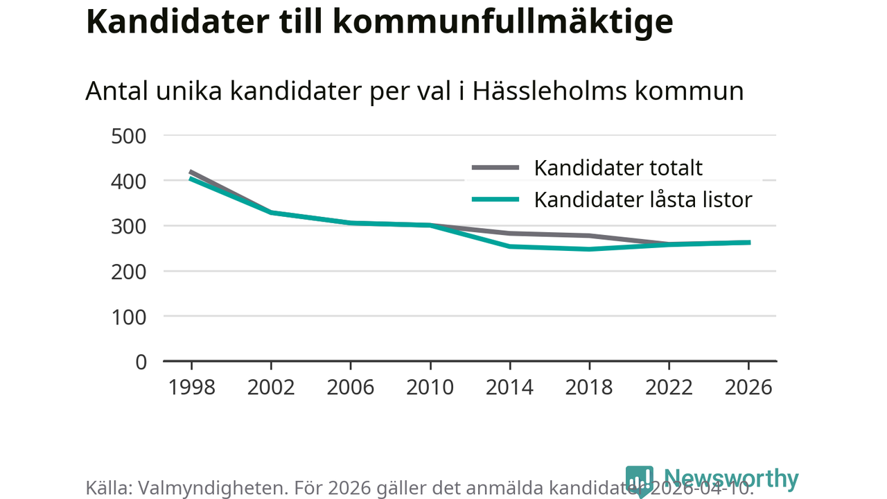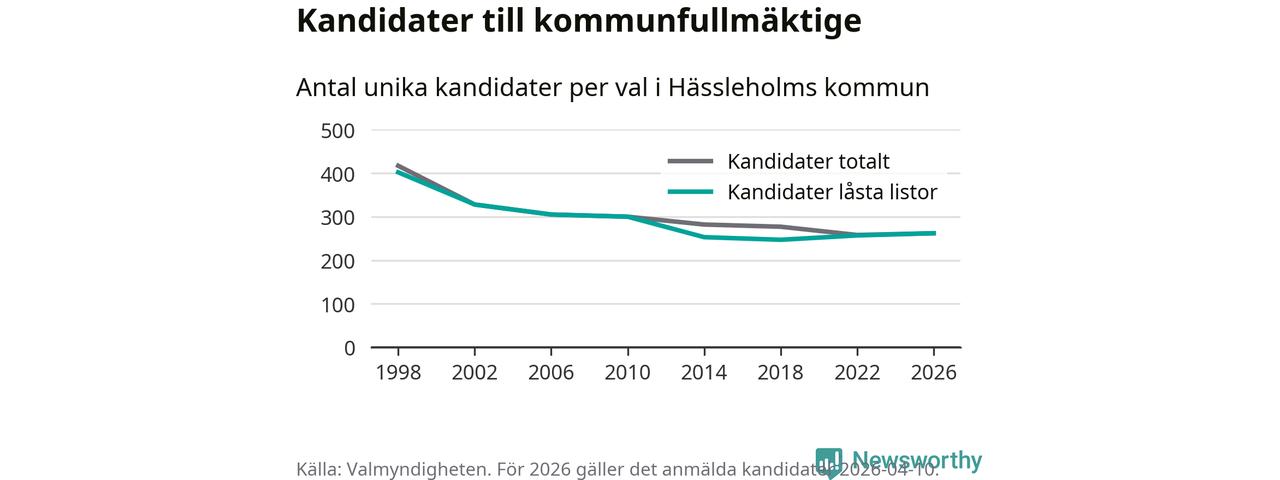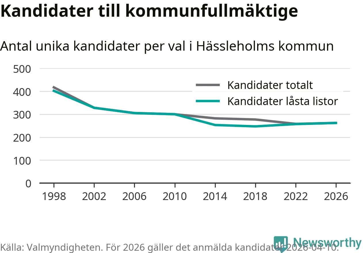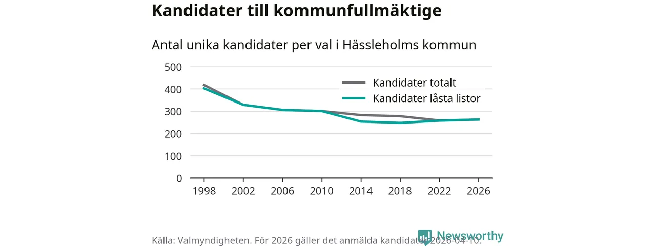 På torsdagen var det deadline för partier med låsta listor att registrera sina kandidater inför höstens val. Till valet till kommunfullmäktige i Hässleholm är 262 kandidater anmälda på sådana listor, vilket är fem fler än i valet 2022.