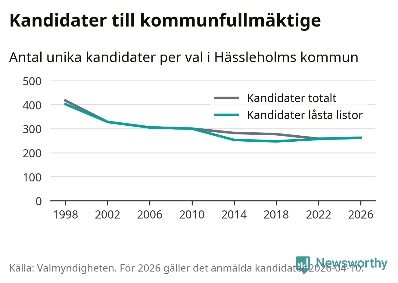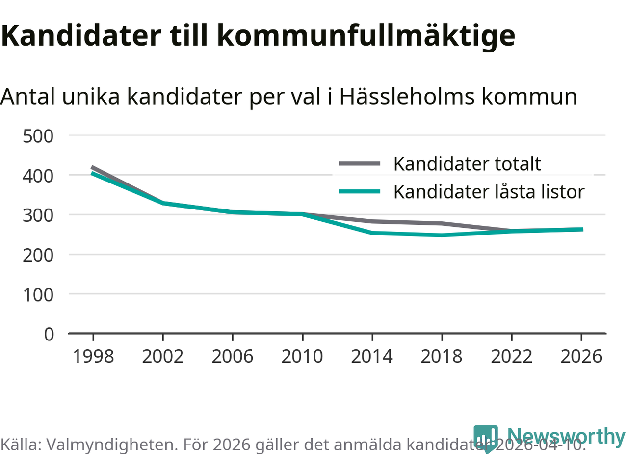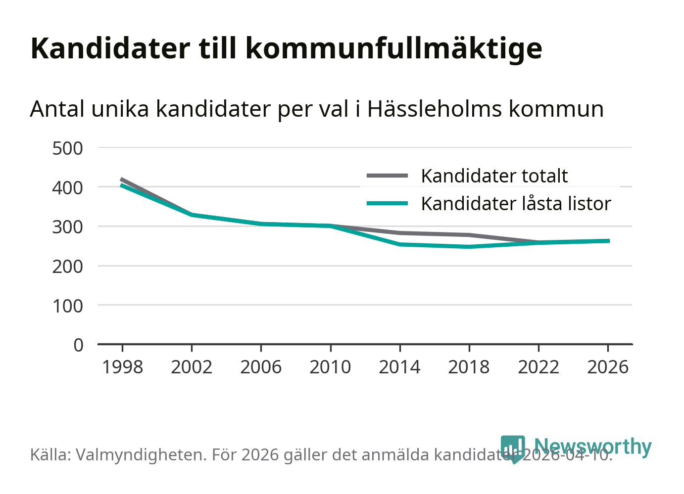 Källa: Valmyndigheten 10 april 2026. en kandidat har enligt Valmyndighetens uppgifter inte lämnat förklaring om samtycke, vilket de skulle ha gjort senast den 9 april för att vara med på listan. Det kan också vara så att förklaring har lämnats, men ännu inte hunnit registrerats i systemet.