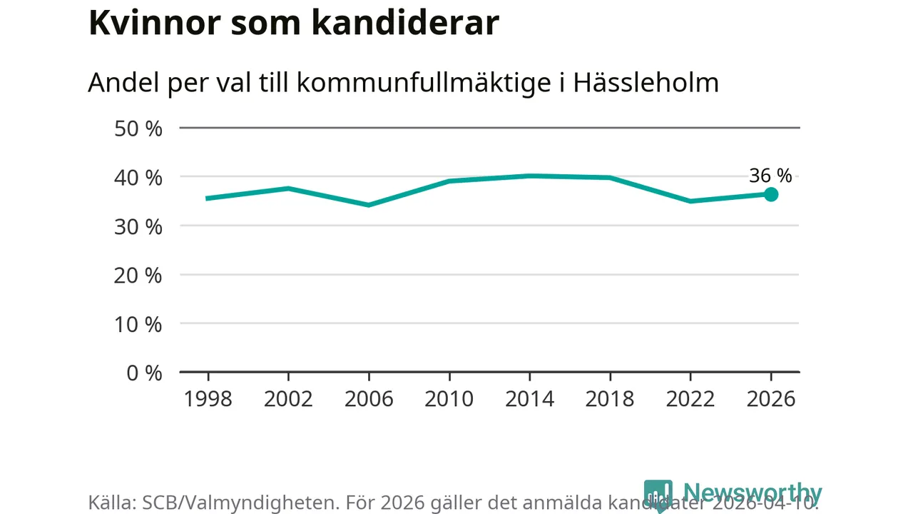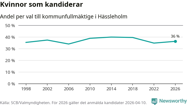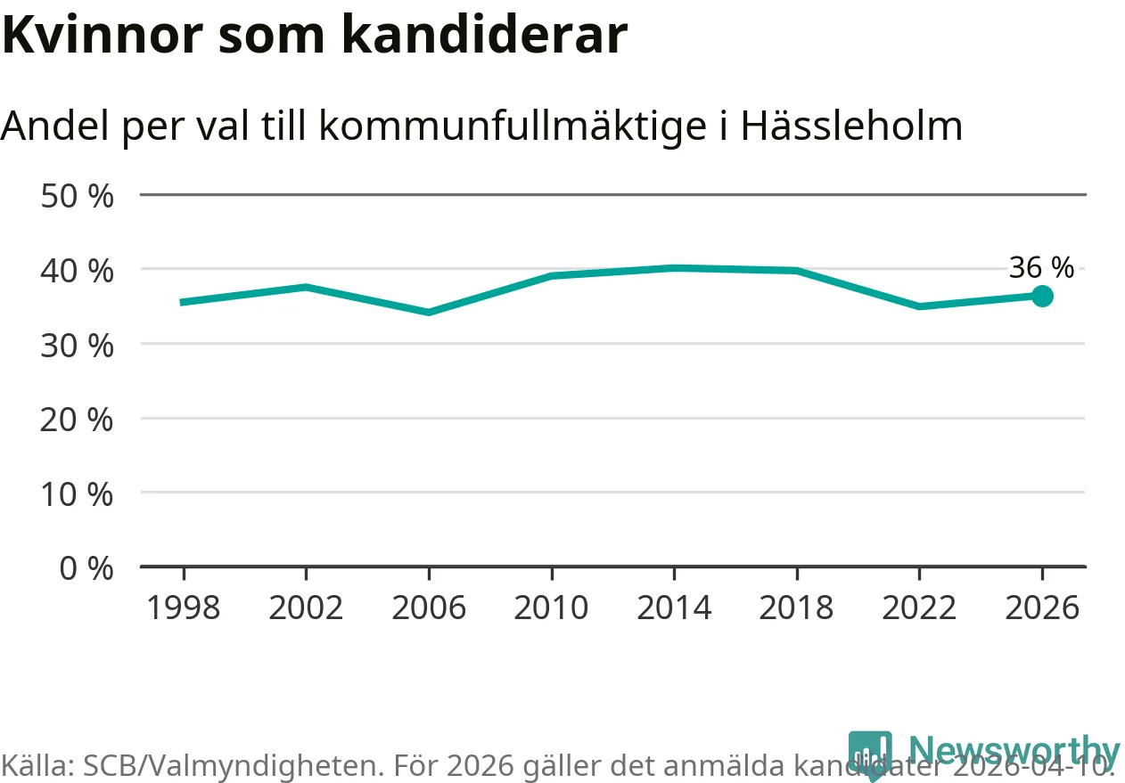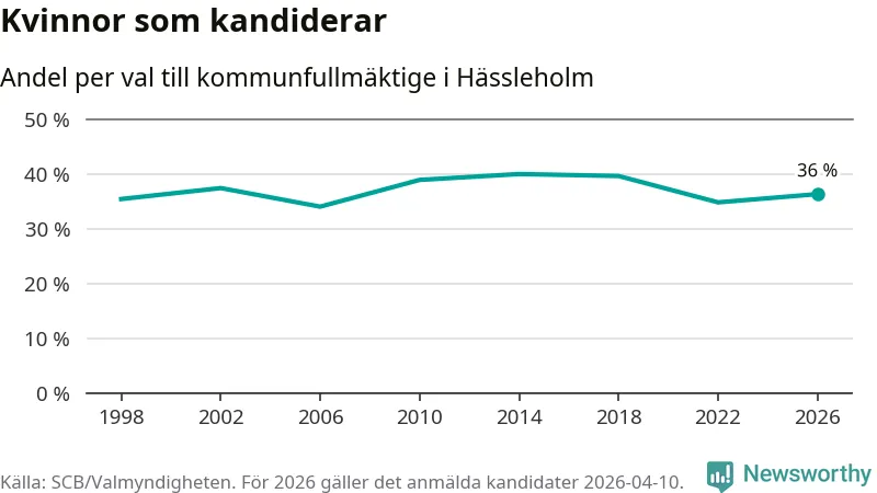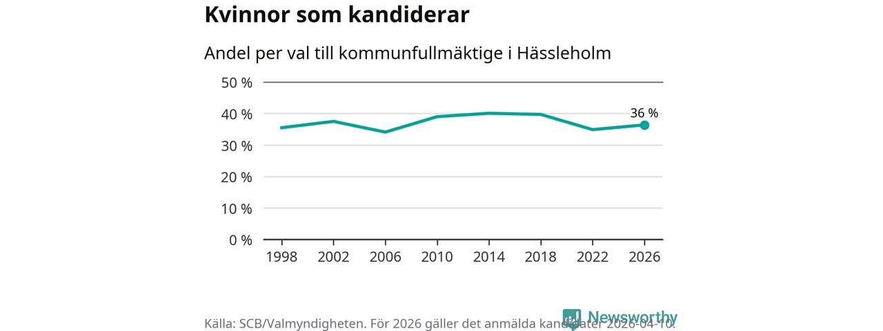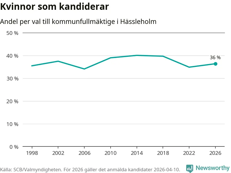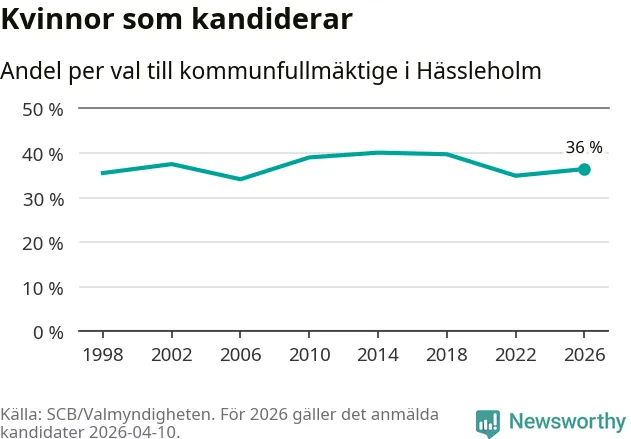 Kvinnorna utgör 36 procent av de hittills anmälda kandidaterna. Vid valet 2014 var 40 procent kvinnor, valet 2006 var motsvarande siffra 34 procent. Hässleholm är en av 264 kommuner i landet där männen utgör en majoritet av kandidaterna på listorna.