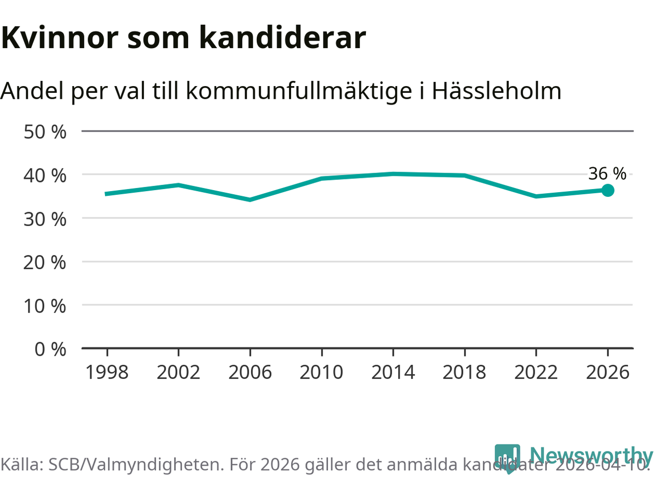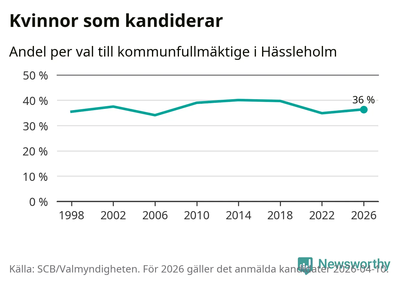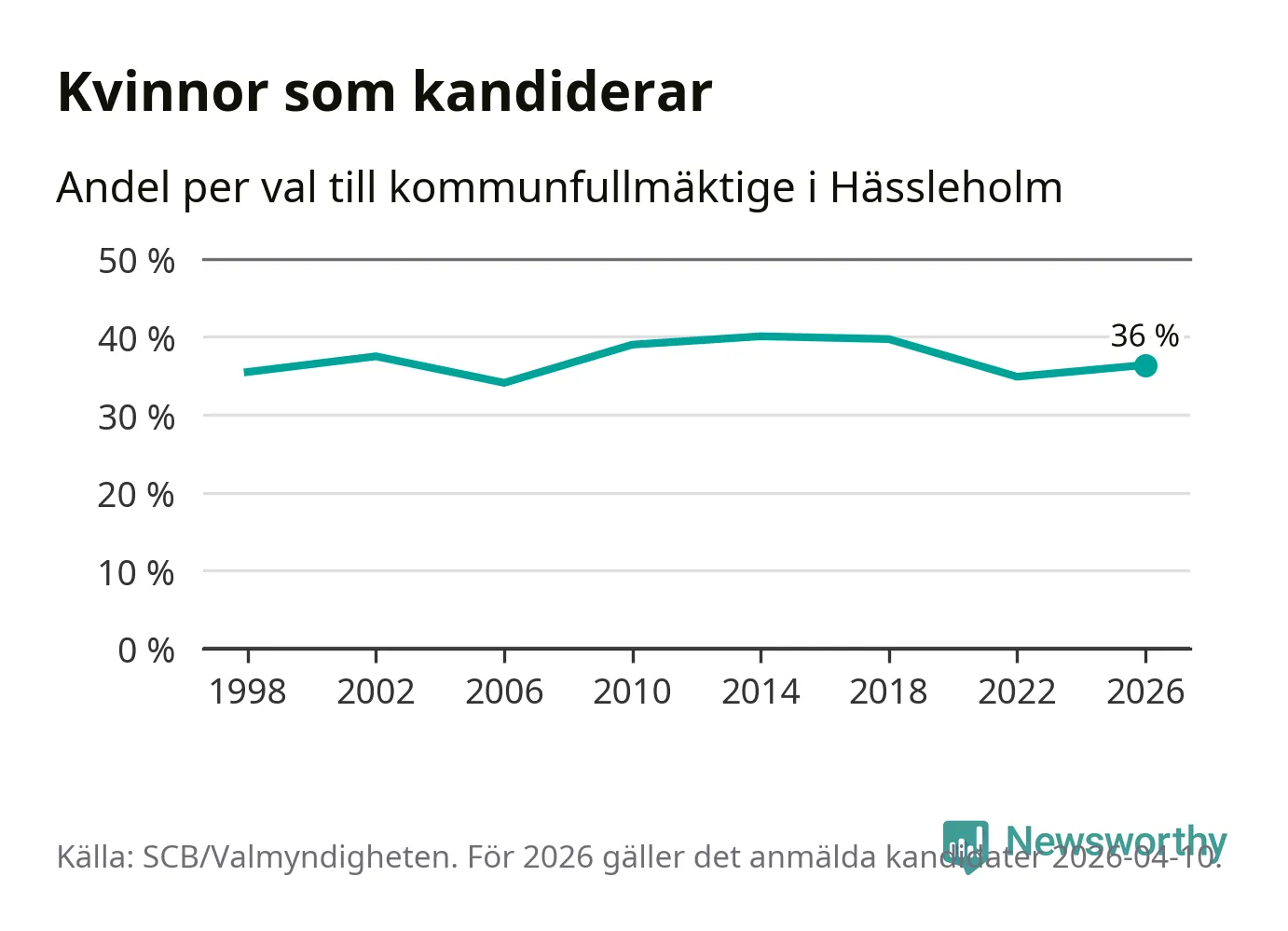 Kvinnorna utgör 36 procent av de hittills anmälda kandidaterna. Vid valet 2014 var 40 procent kvinnor, valet 2006 var motsvarande siffra 34 procent. Hässleholm är en av 264 kommuner i landet där männen utgör en majoritet av kandidaterna på listorna.