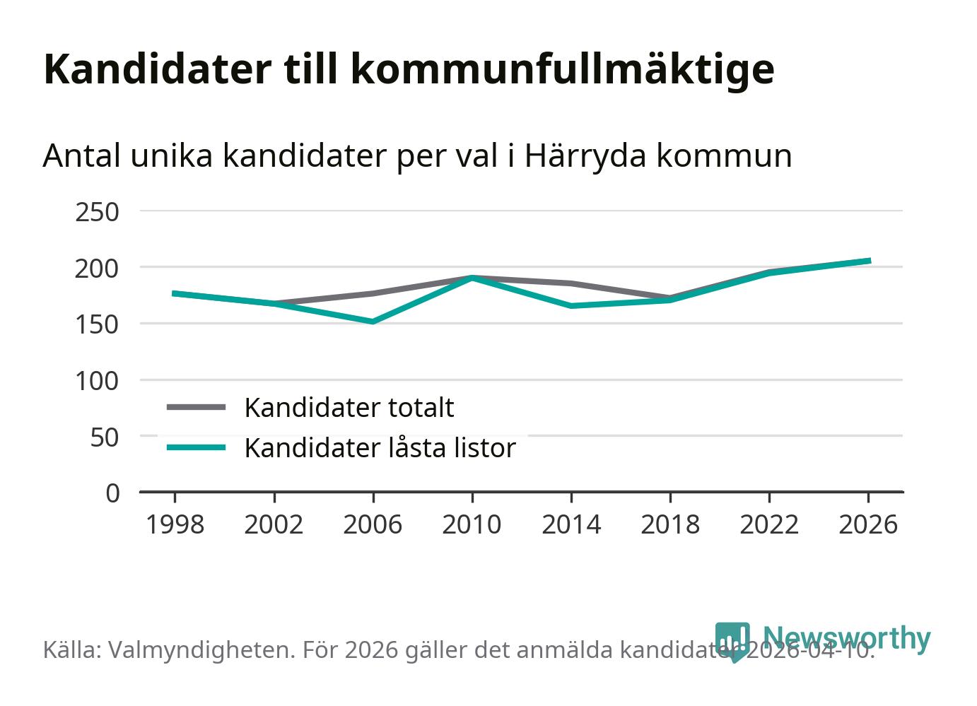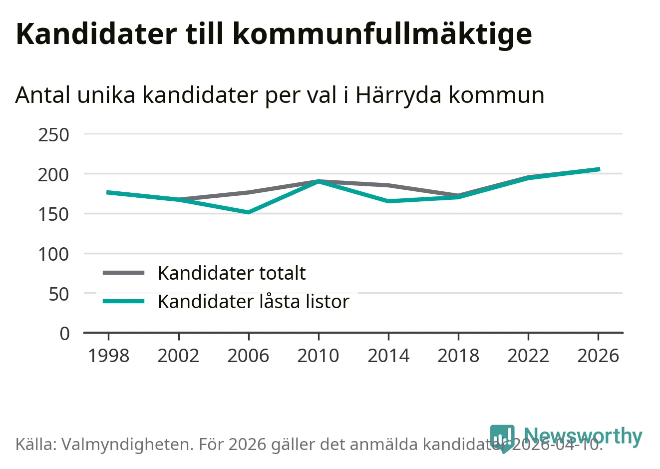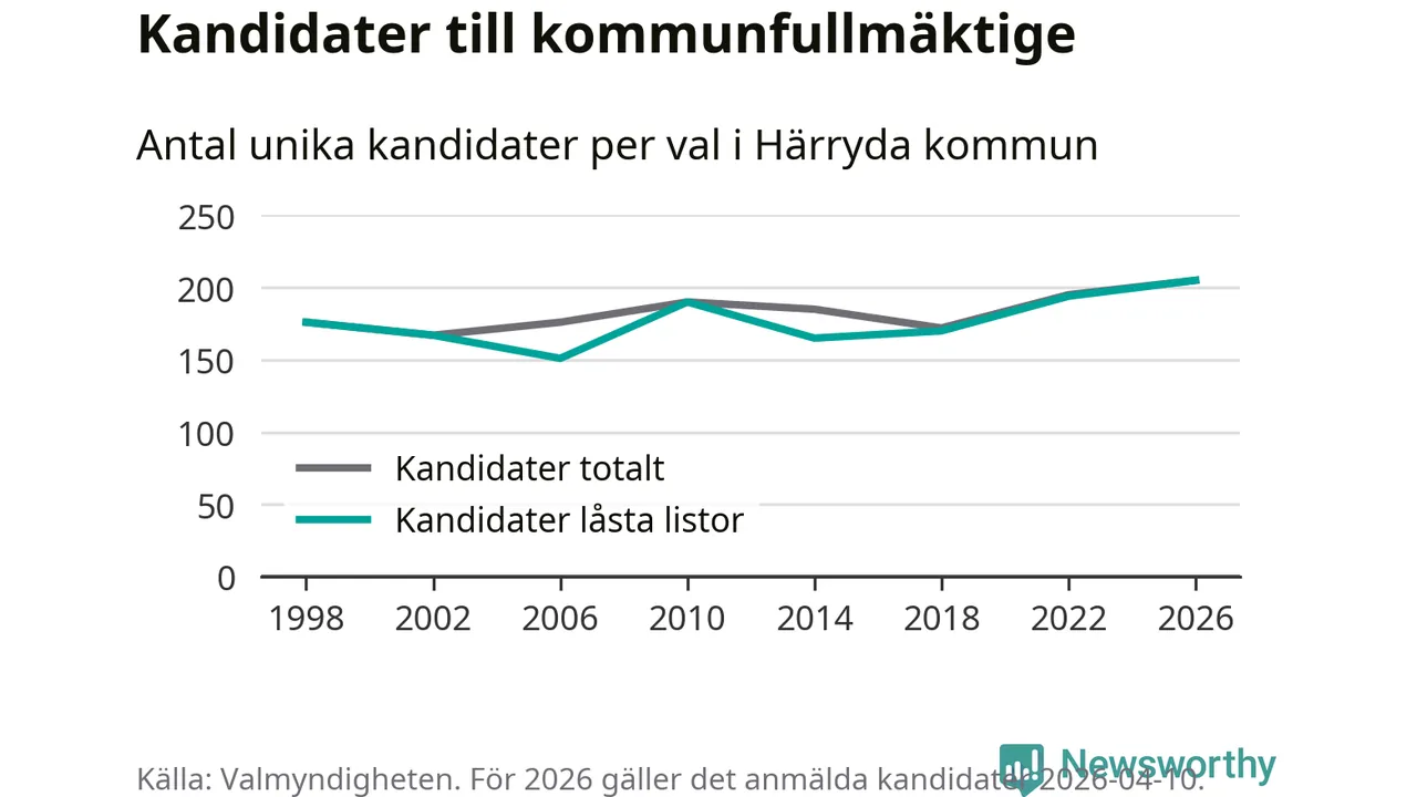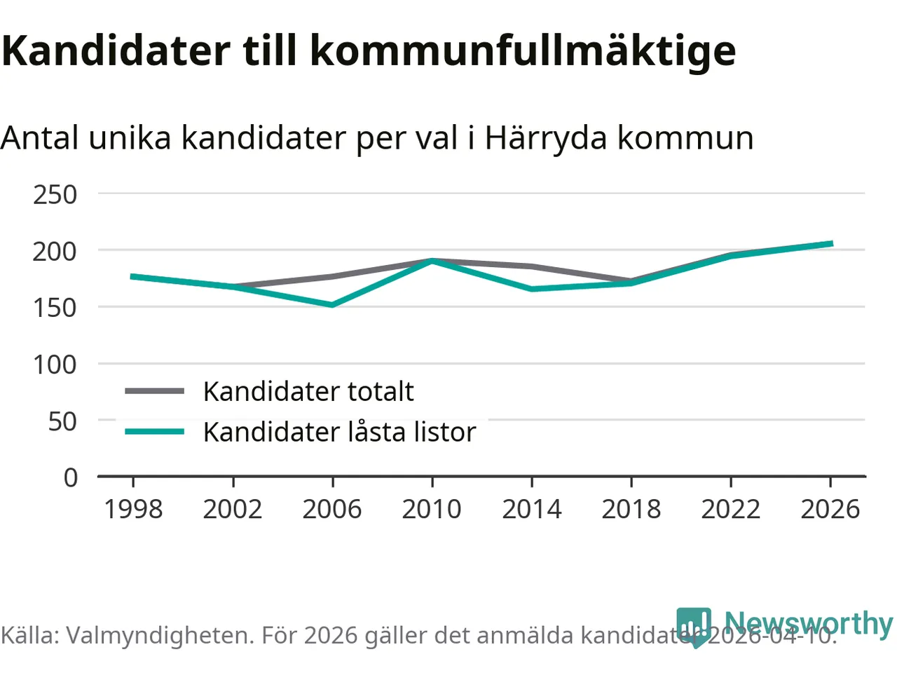 På torsdagen var det deadline för partier med låsta listor att registrera sina kandidater inför höstens val. Till valet till kommunfullmäktige i Härryda är 205 kandidater anmälda på sådana listor, vilket är elva fler än i valet 2022. Det är den högsta siffran sedan åtminstone valet 1998, vilket är så långt tillbaka som vi har statistik för.
