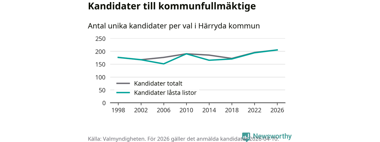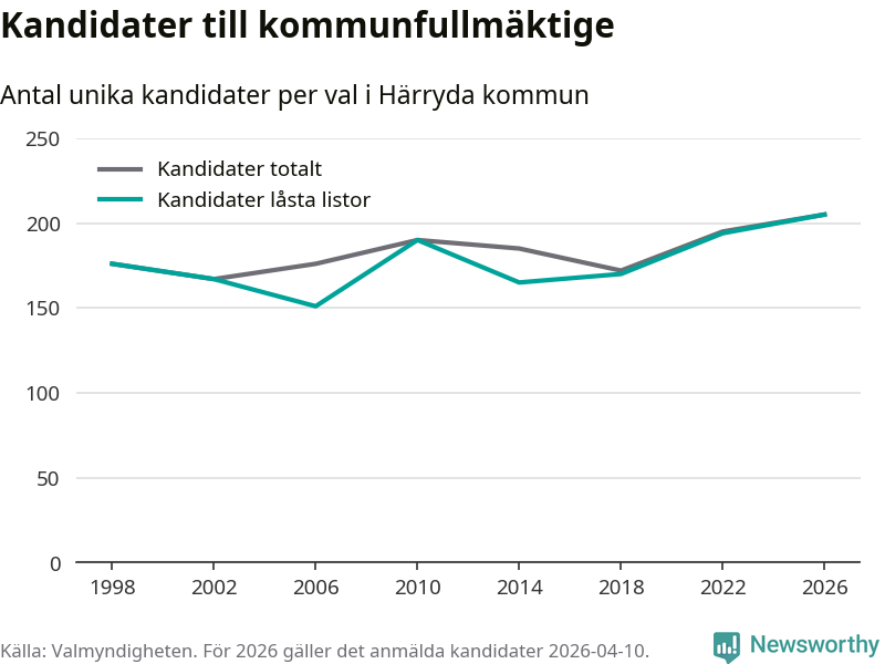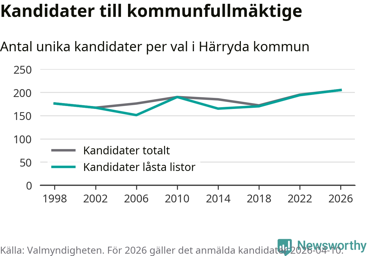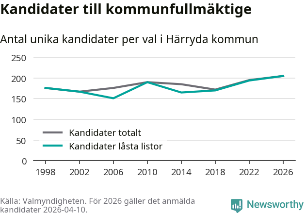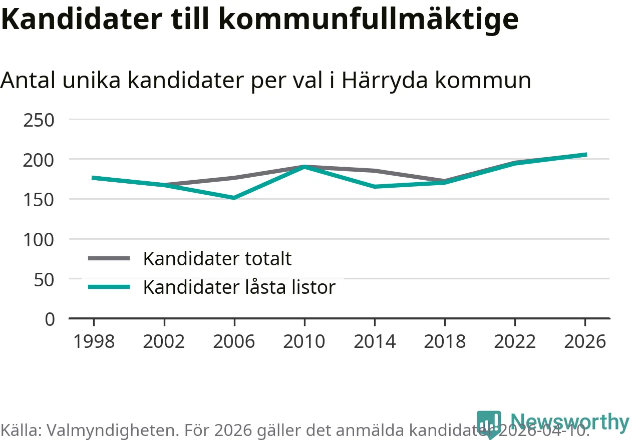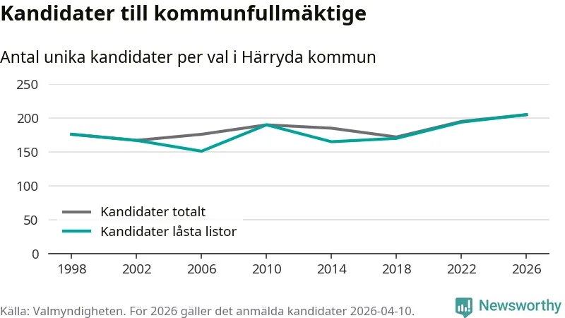 På torsdagen var det deadline för partier med låsta listor att registrera sina kandidater inför höstens val. Till valet till kommunfullmäktige i Härryda är 205 kandidater anmälda på sådana listor, vilket är elva fler än i valet 2022. Det är den högsta siffran sedan åtminstone valet 1998, vilket är så långt tillbaka som vi har statistik för.