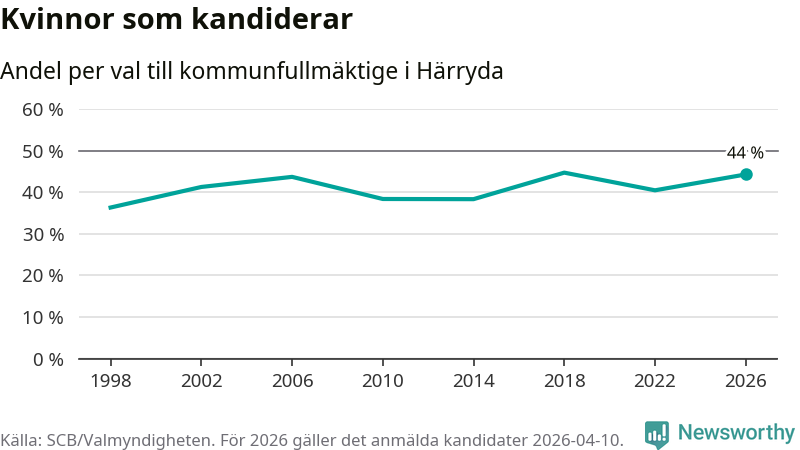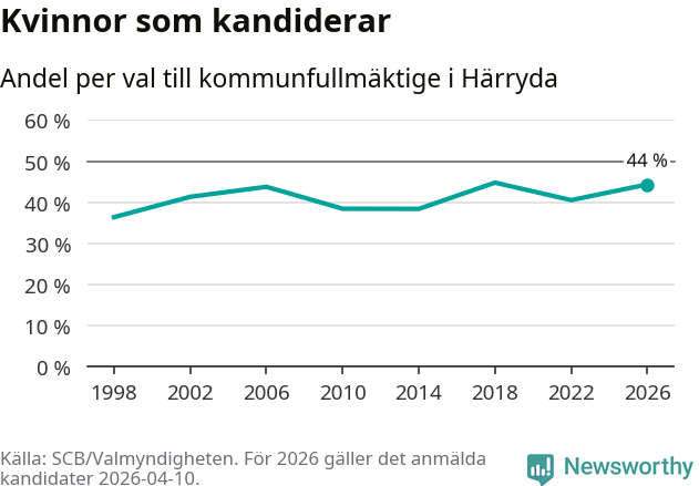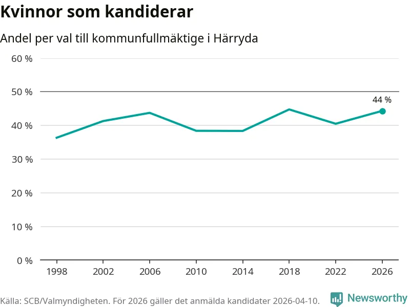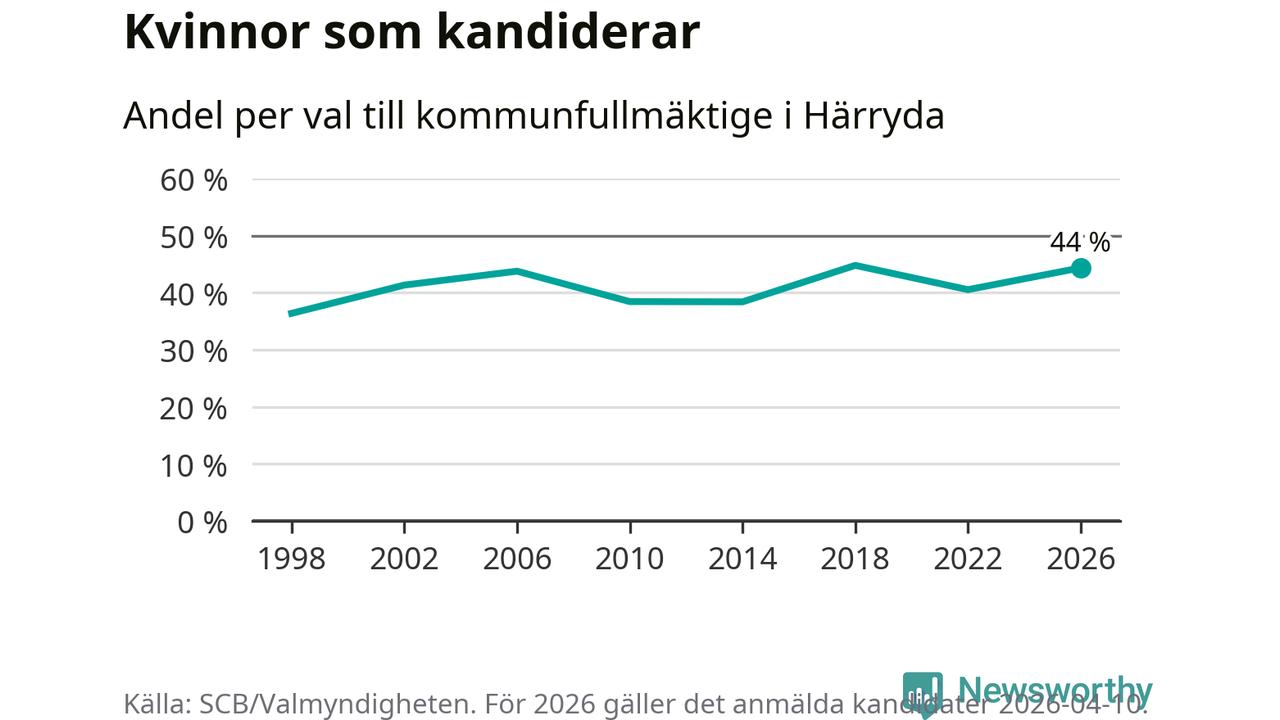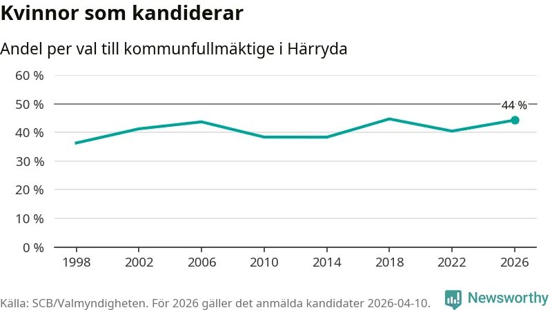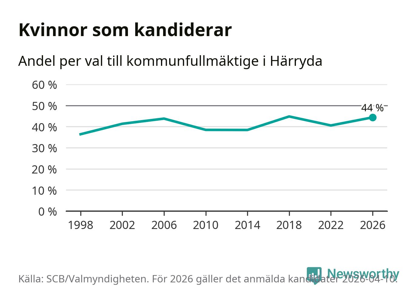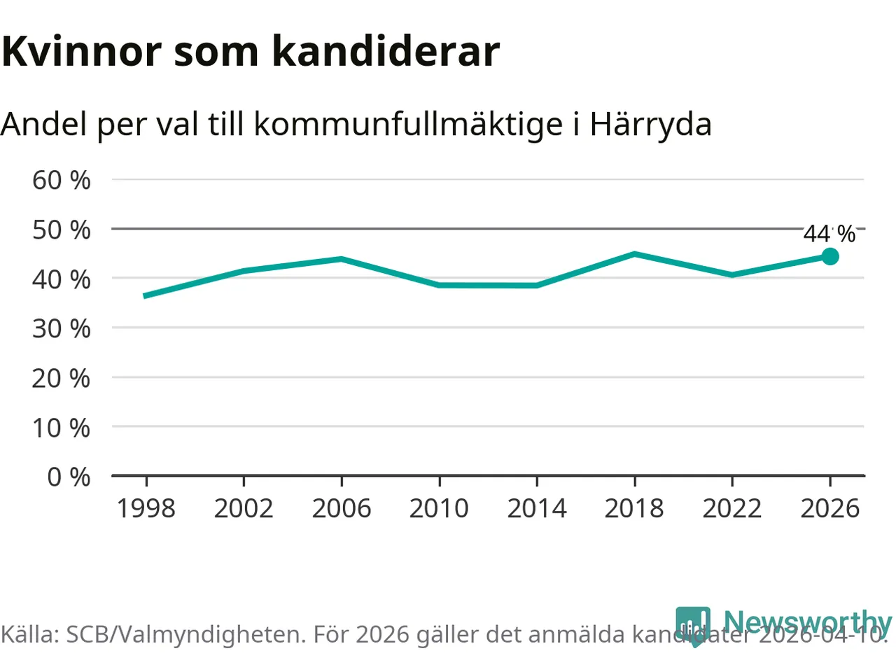 På torsdagen var det deadline för partier med låsta listor att registrera sina kandidater inför höstens val. Till valet till kommunfullmäktige i Härryda är 205 kandidater anmälda på sådana listor, vilket är elva fler än i valet 2022. Det är den högsta siffran sedan åtminstone valet 1998, vilket är så långt tillbaka som vi har statistik för.
