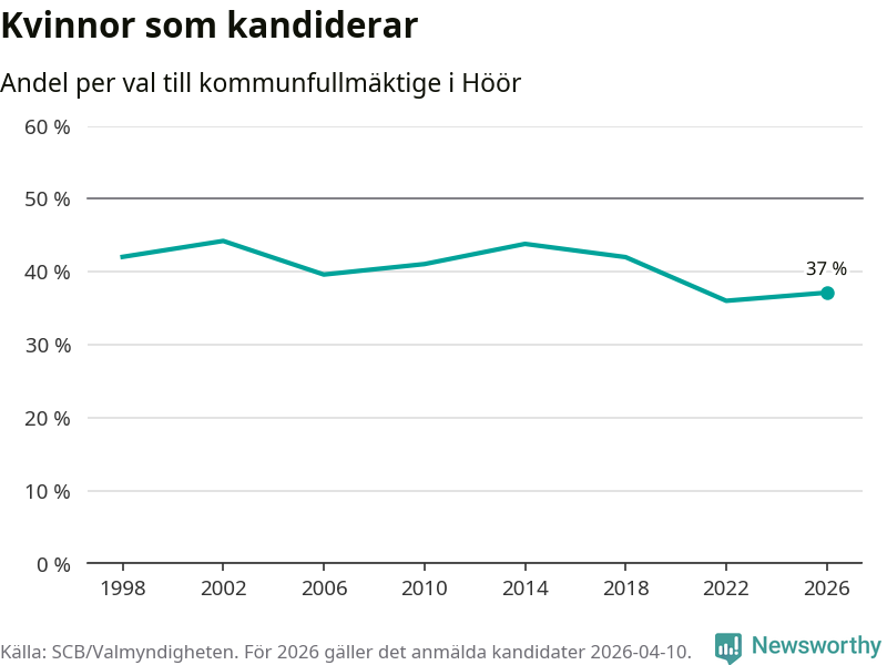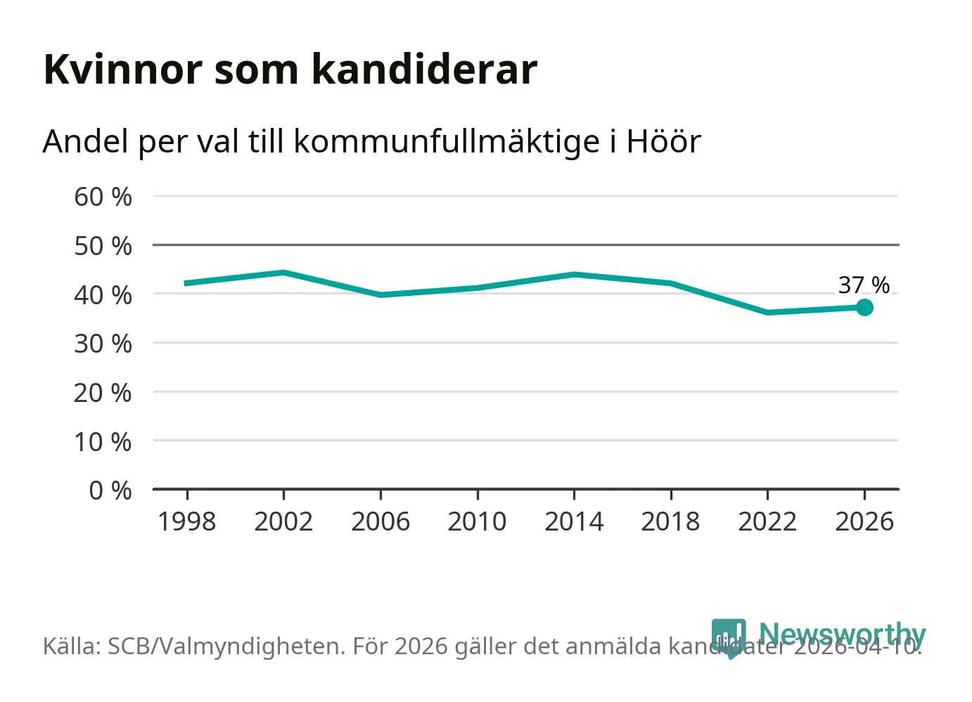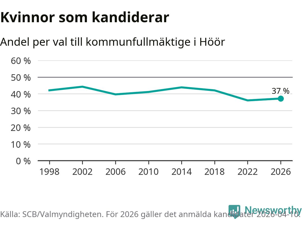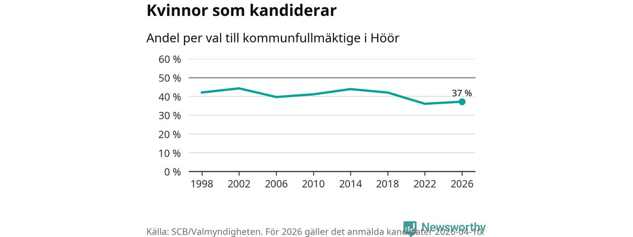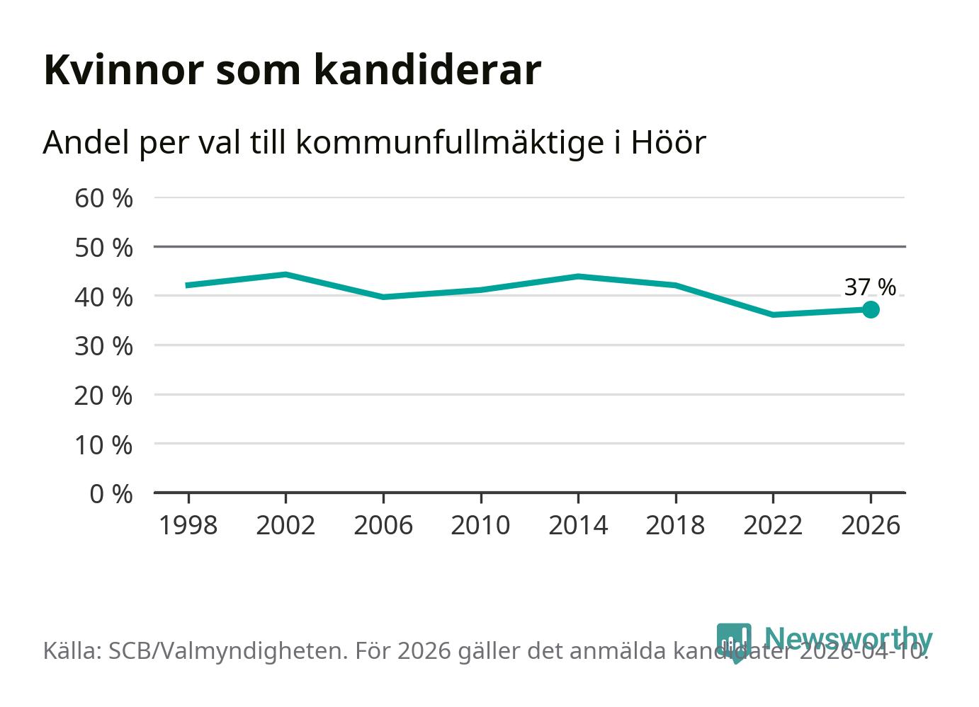 Kvinnorna utgör 37 procent av de hittills anmälda kandidaterna. Vid valet 2002 var 44 procent kvinnor, valet 2022 var motsvarande siffra 36 procent. Höör är en av 264 kommuner i landet där männen utgör en majoritet av kandidaterna på listorna.