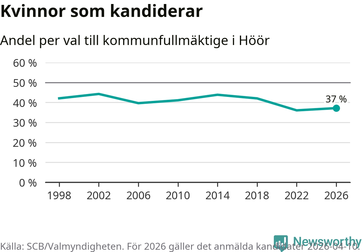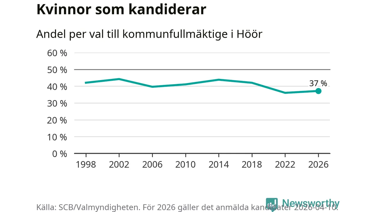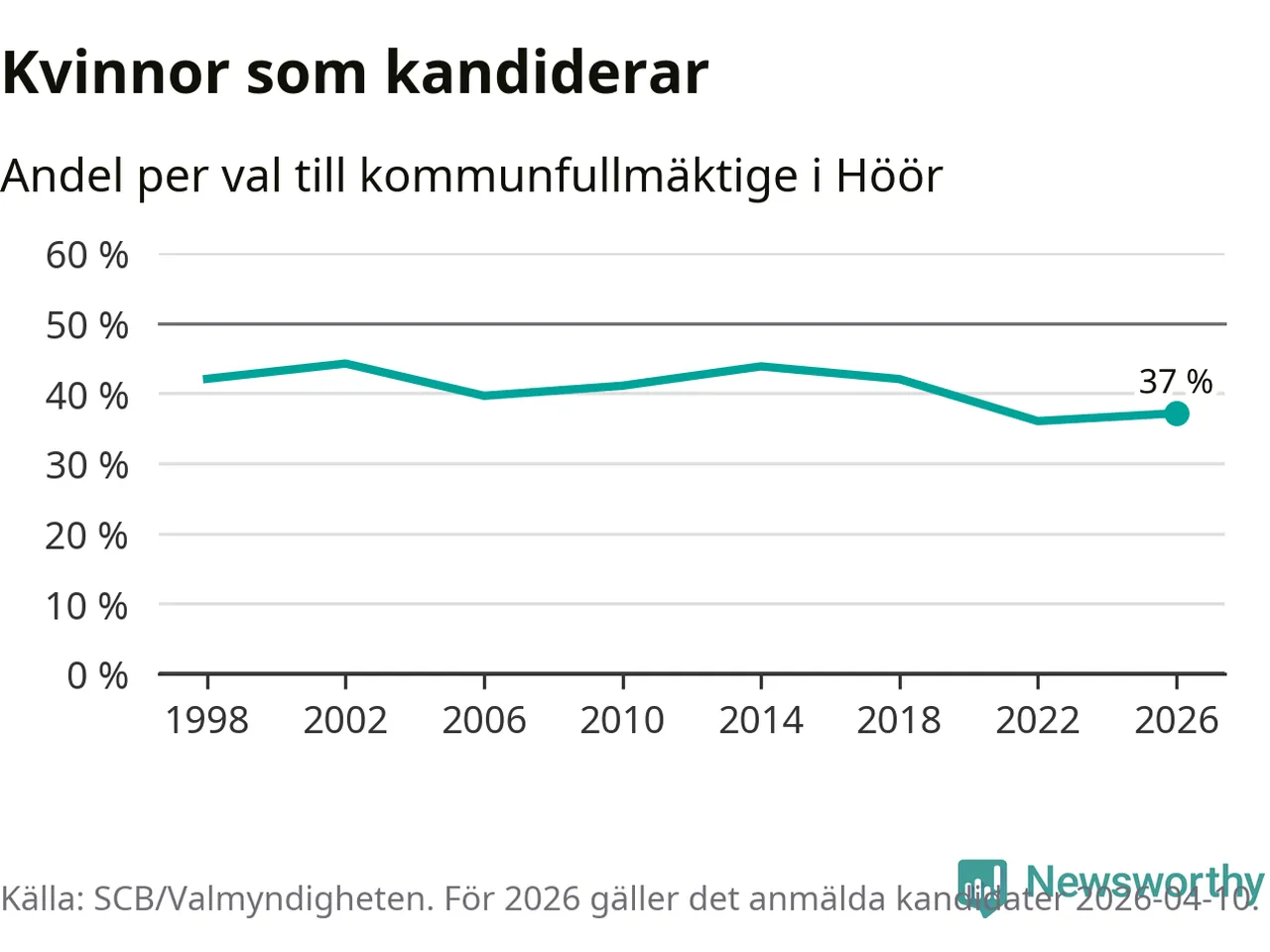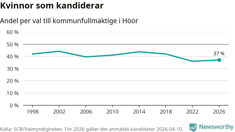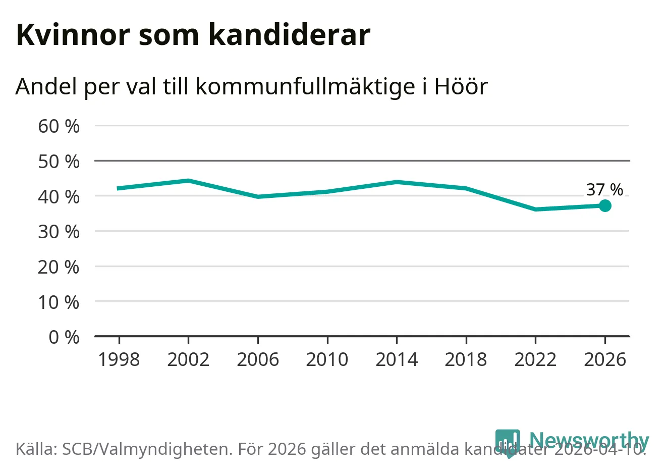 Kvinnorna utgör 37 procent av de hittills anmälda kandidaterna. Vid valet 2002 var 44 procent kvinnor, valet 2022 var motsvarande siffra 36 procent. Höör är en av 264 kommuner i landet där männen utgör en majoritet av kandidaterna på listorna.
