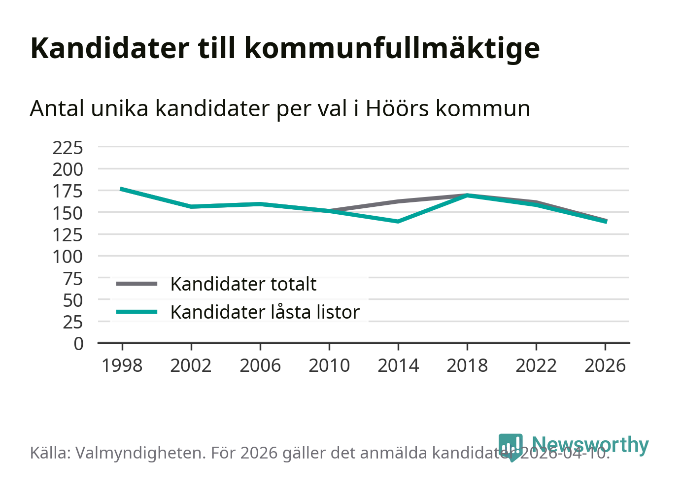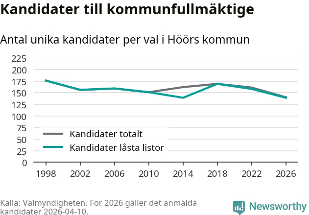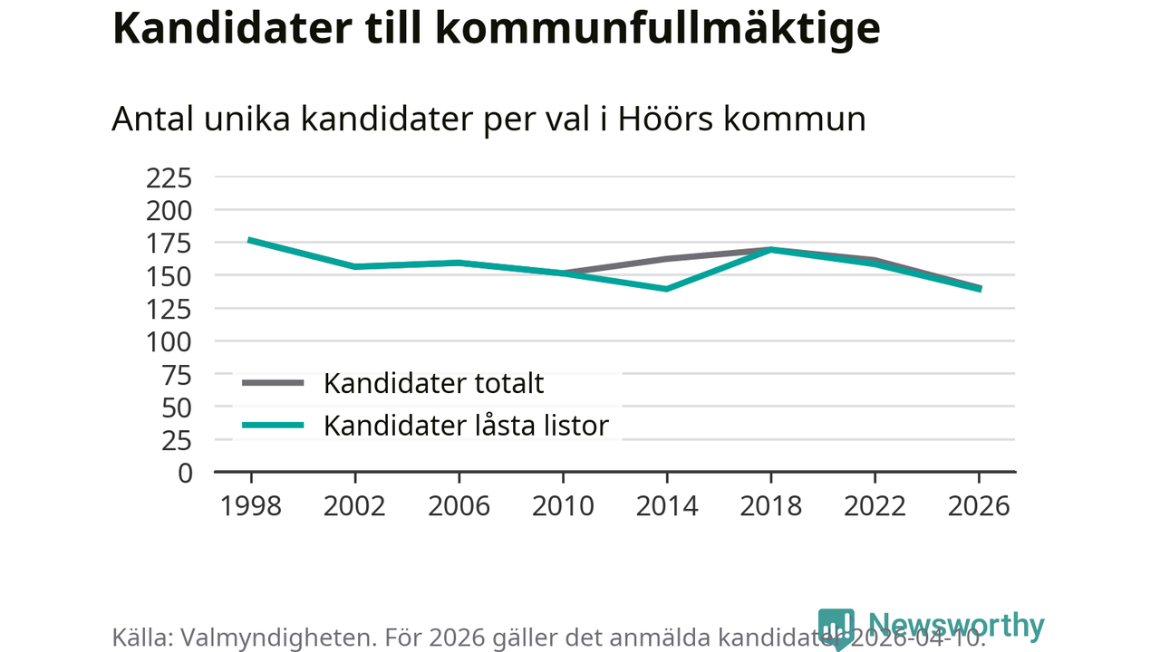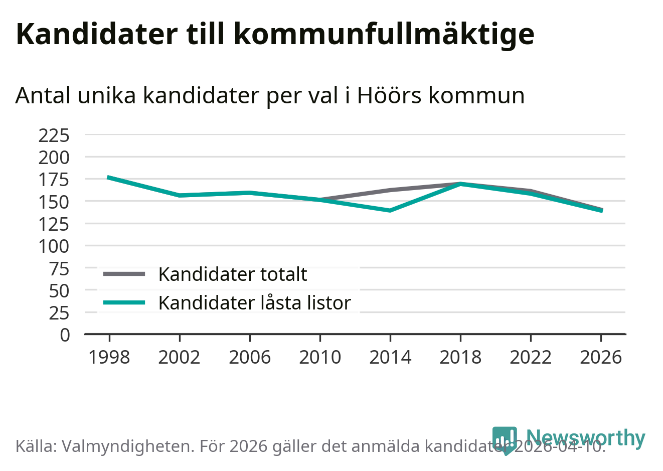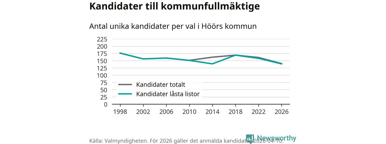 På torsdagen var det deadline för partier med låsta listor att registrera sina kandidater inför höstens val. Till valet till kommunfullmäktige i Höör är 139 kandidater anmälda på sådana listor, vilket är 19 färre än i valet 2022. Det är den lägsta siffran sedan åtminstone valet 1998, vilket är så långt tillbaka som vi har statistik för.