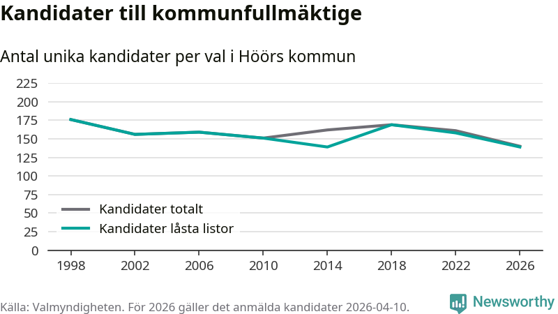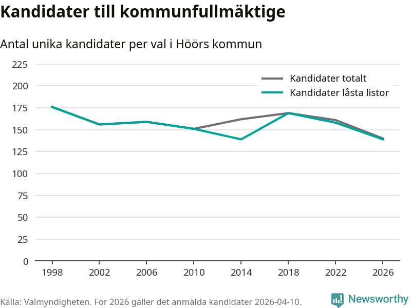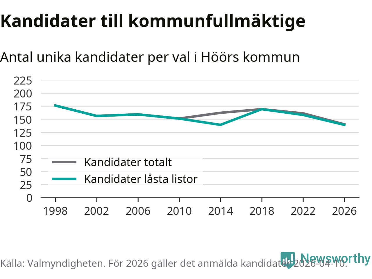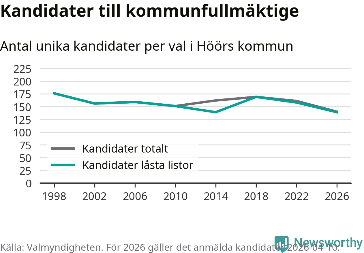 På torsdagen var det deadline för partier med låsta listor att registrera sina kandidater inför höstens val. Till valet till kommunfullmäktige i Höör är 139 kandidater anmälda på sådana listor, vilket är 19 färre än i valet 2022. Det är den lägsta siffran sedan åtminstone valet 1998, vilket är så långt tillbaka som vi har statistik för.