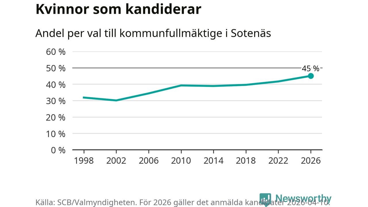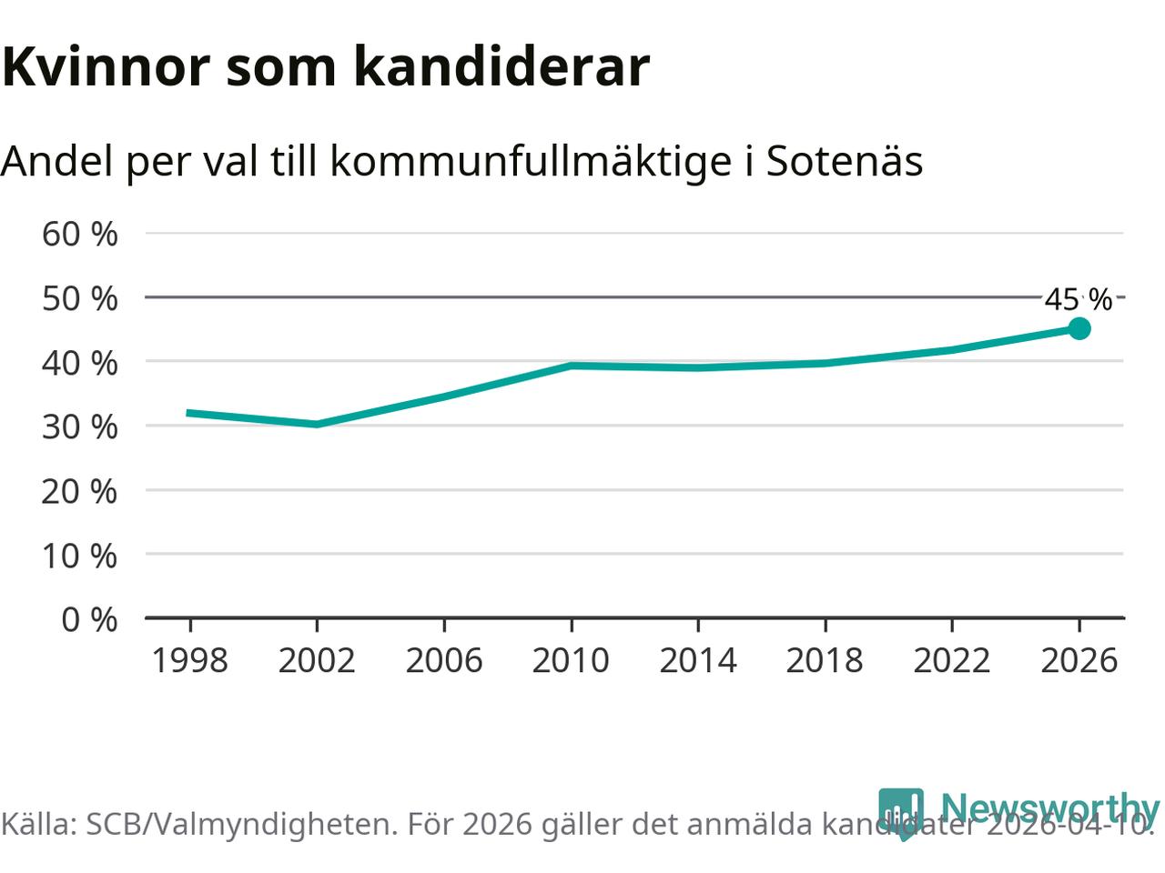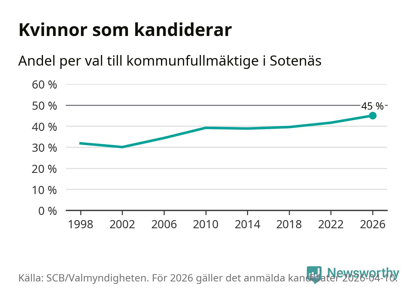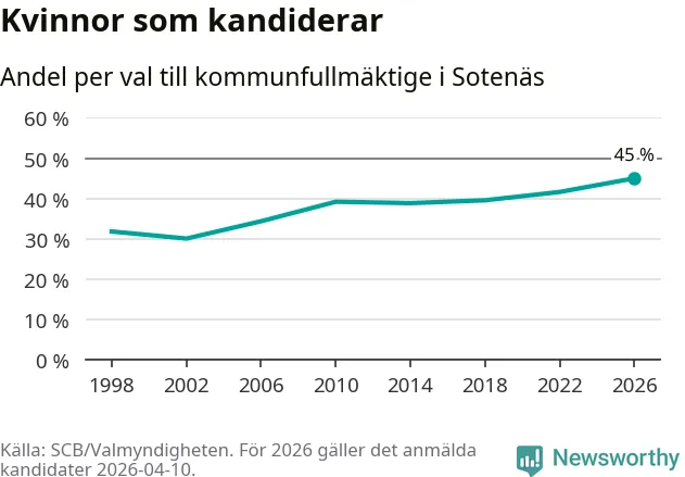 Kvinnorna utgör 45 procent av de hittills anmälda kandidaterna, vilket är den högsta andelen på listorna till kommunfullmäktige i Sotenäs sedan åtminstone valet 1998. Andelen kvinnor har ökat i Sotenäs under de senaste två valen och ökningen ser alltså ut att fortsätta i år. Sotenäs är en av 264 kommuner i landet där männen utgör en majoritet av kandidaterna på listorna.