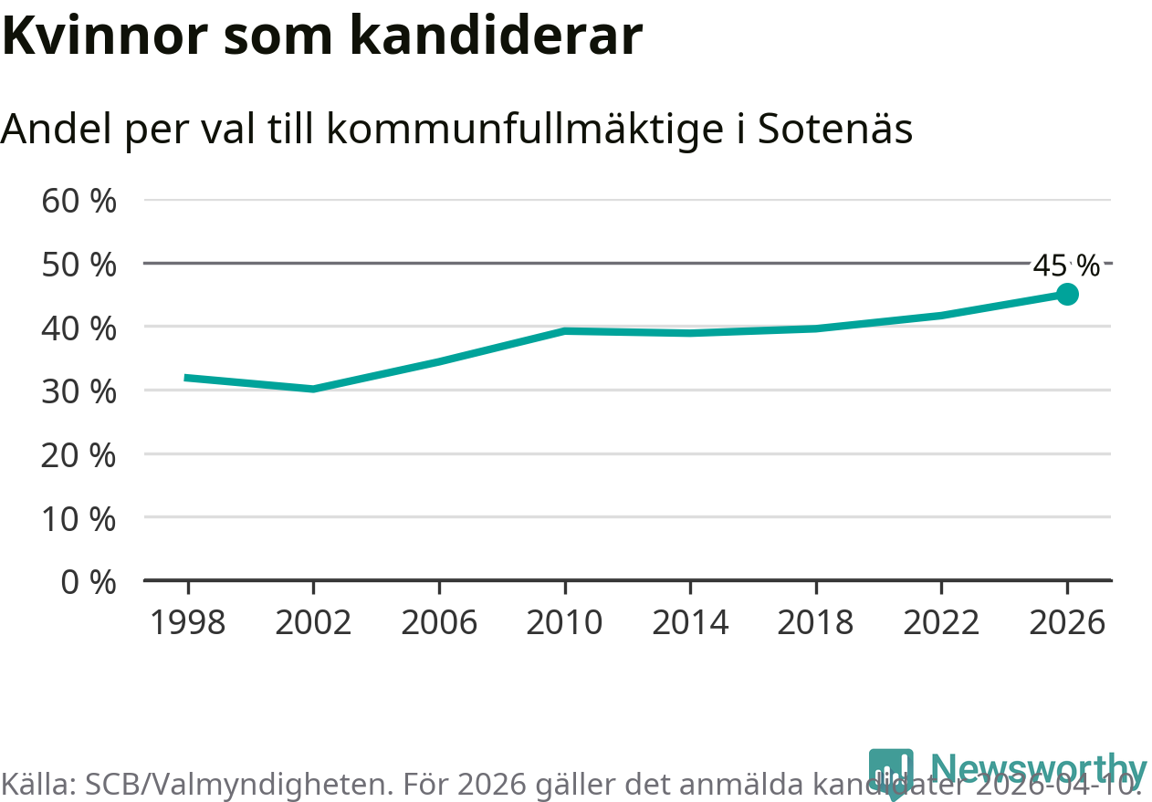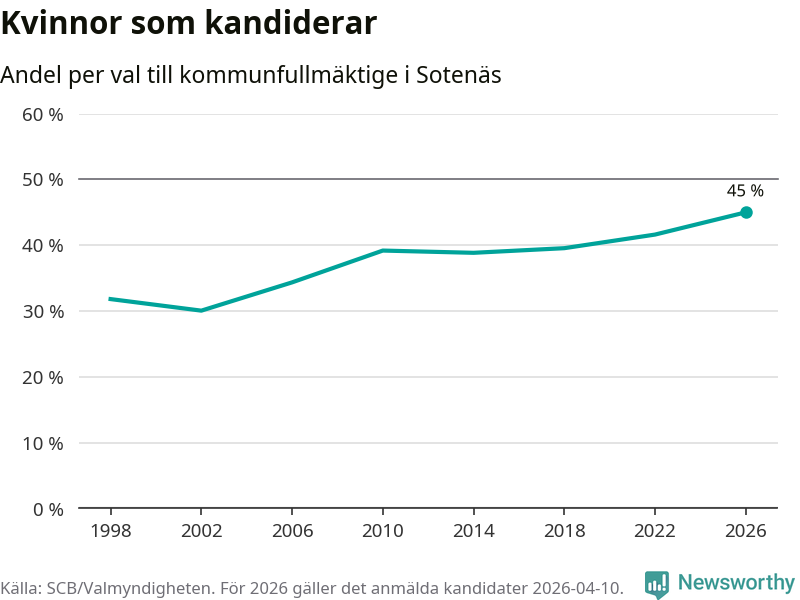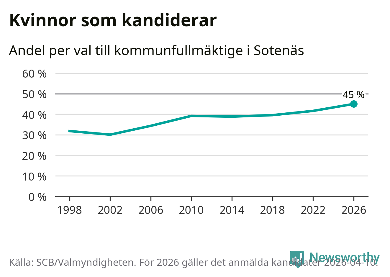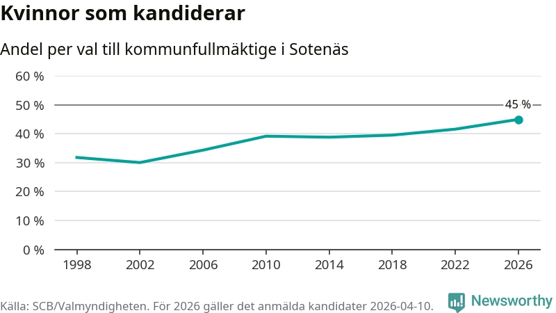 Kvinnorna utgör 45 procent av de hittills anmälda kandidaterna, vilket är den högsta andelen på listorna till kommunfullmäktige i Sotenäs sedan åtminstone valet 1998. Andelen kvinnor har ökat i Sotenäs under de senaste två valen och ökningen ser alltså ut att fortsätta i år. Sotenäs är en av 264 kommuner i landet där männen utgör en majoritet av kandidaterna på listorna.