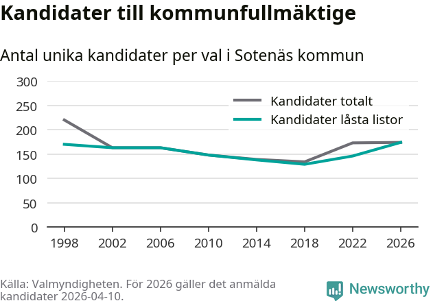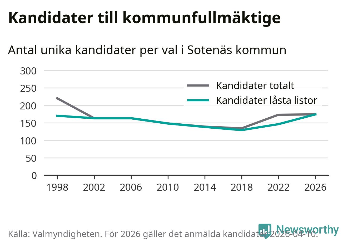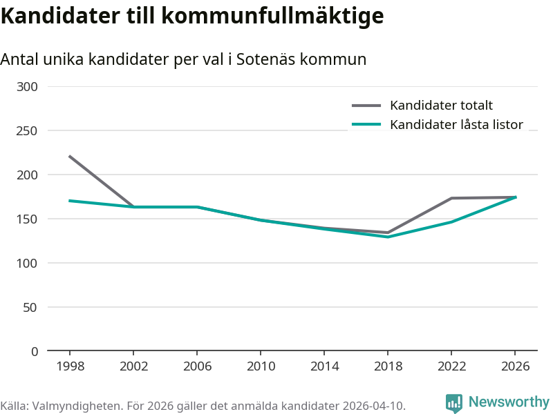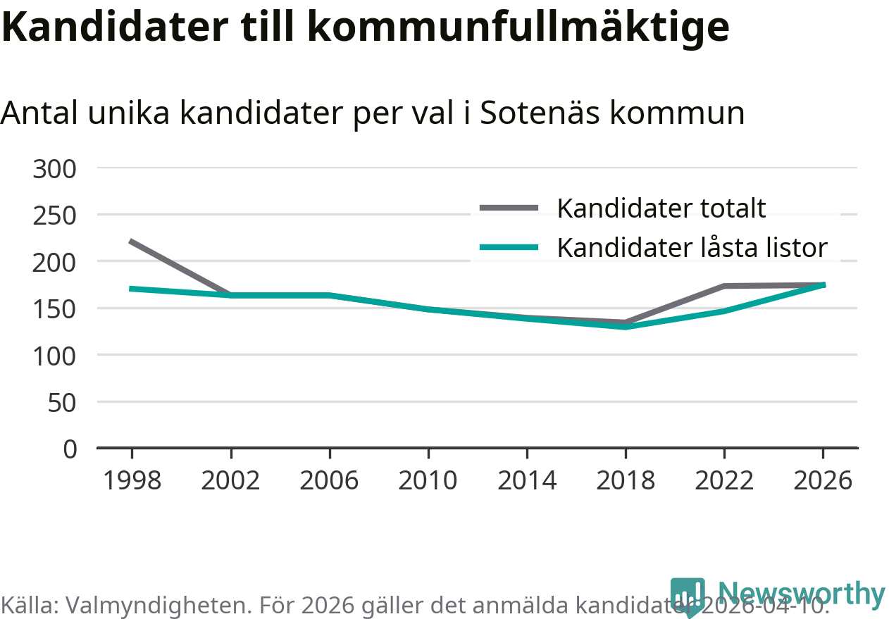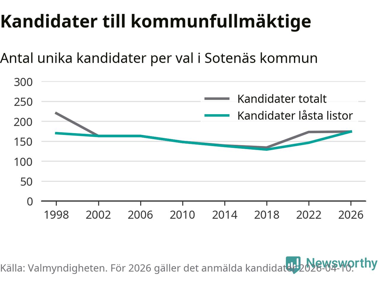 På torsdagen var det deadline för partier med låsta listor att registrera sina kandidater inför höstens val. Till valet till kommunfullmäktige i Sotenäs är 174 kandidater anmälda på sådana listor, vilket är 28 fler än i valet 2022. Det är den högsta siffran sedan åtminstone valet 1998, vilket är så långt tillbaka som vi har statistik för.