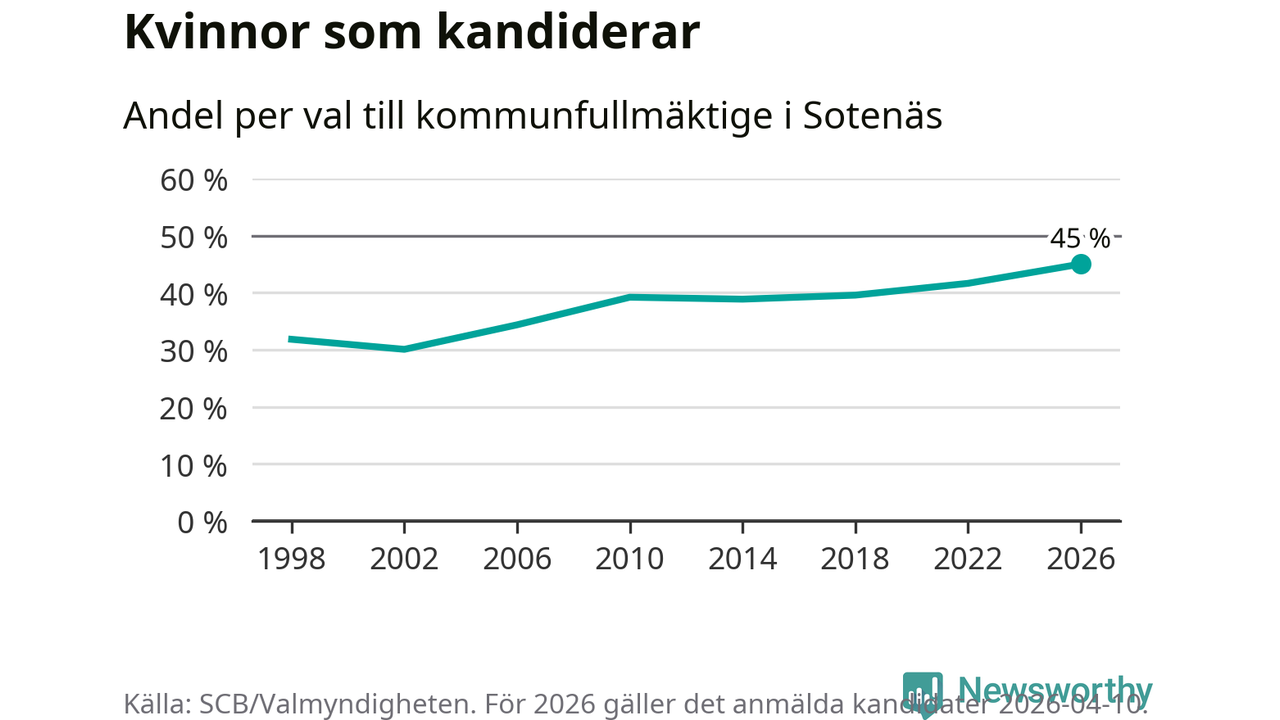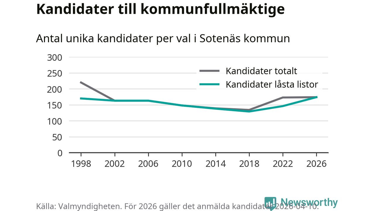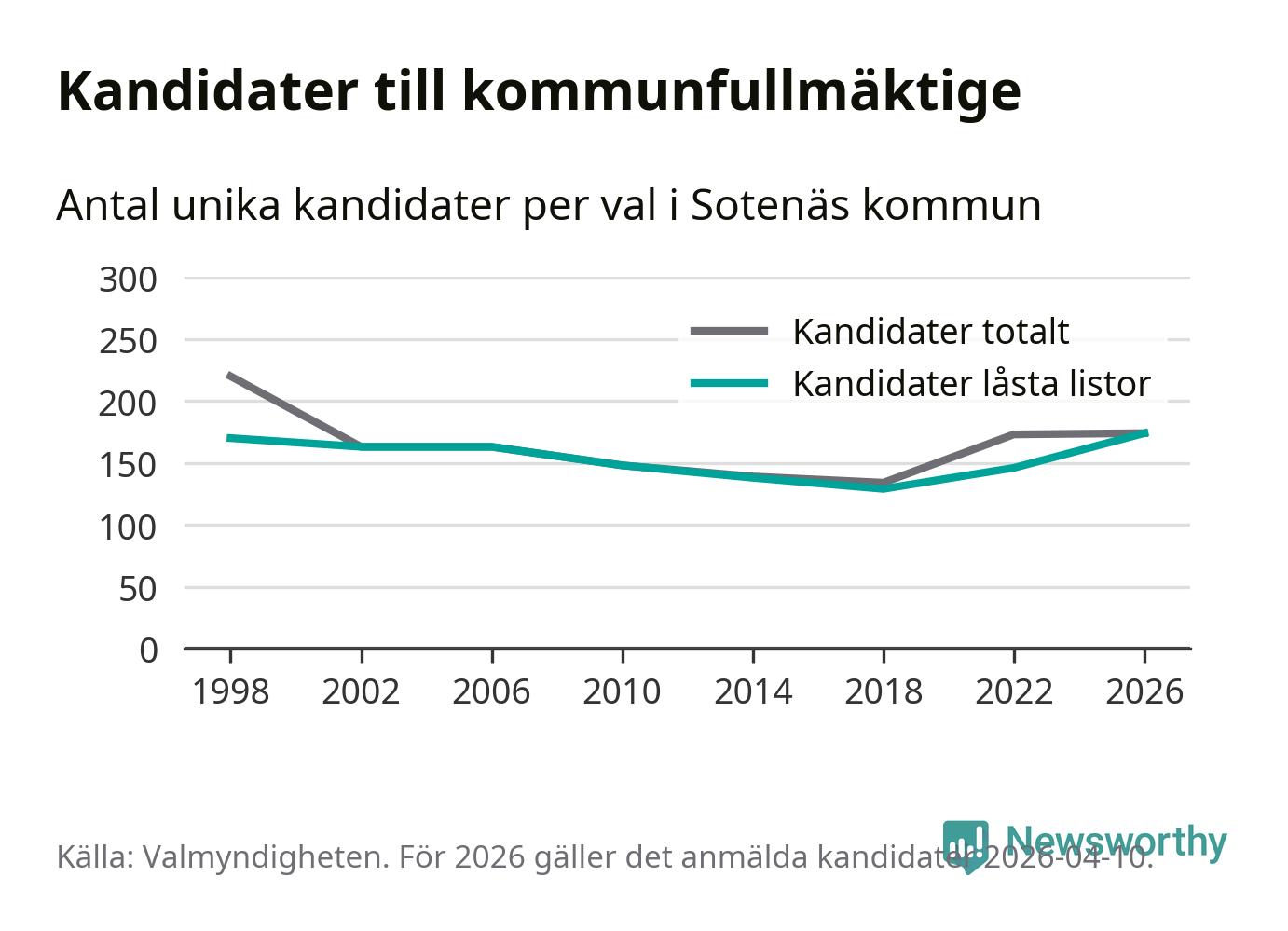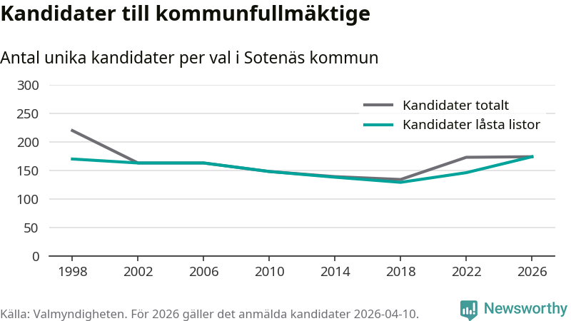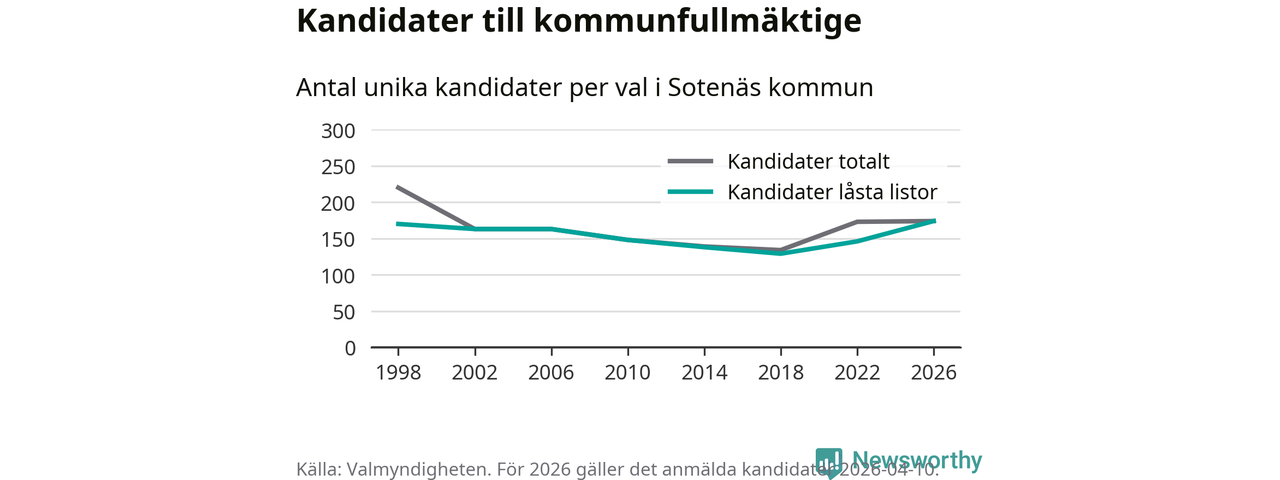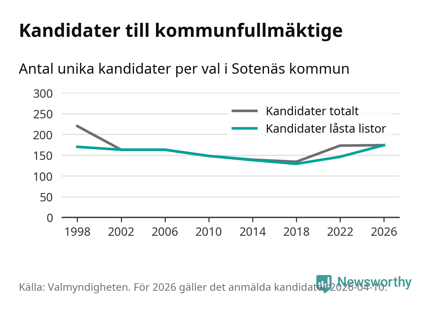 På torsdagen var det deadline för partier med låsta listor att registrera sina kandidater inför höstens val. Till valet till kommunfullmäktige i Sotenäs är 174 kandidater anmälda på sådana listor, vilket är 28 fler än i valet 2022. Det är den högsta siffran sedan åtminstone valet 1998, vilket är så långt tillbaka som vi har statistik för.