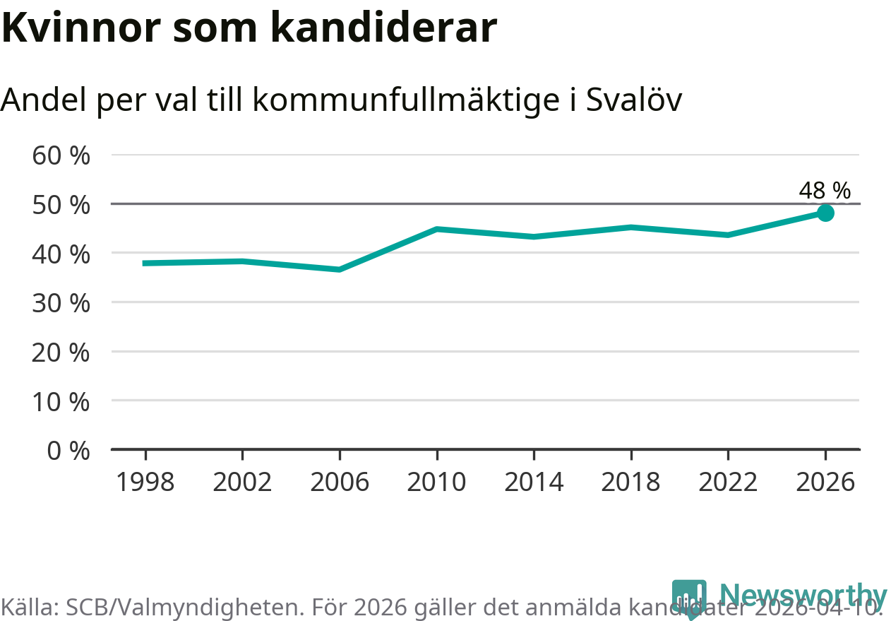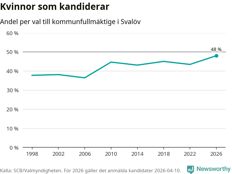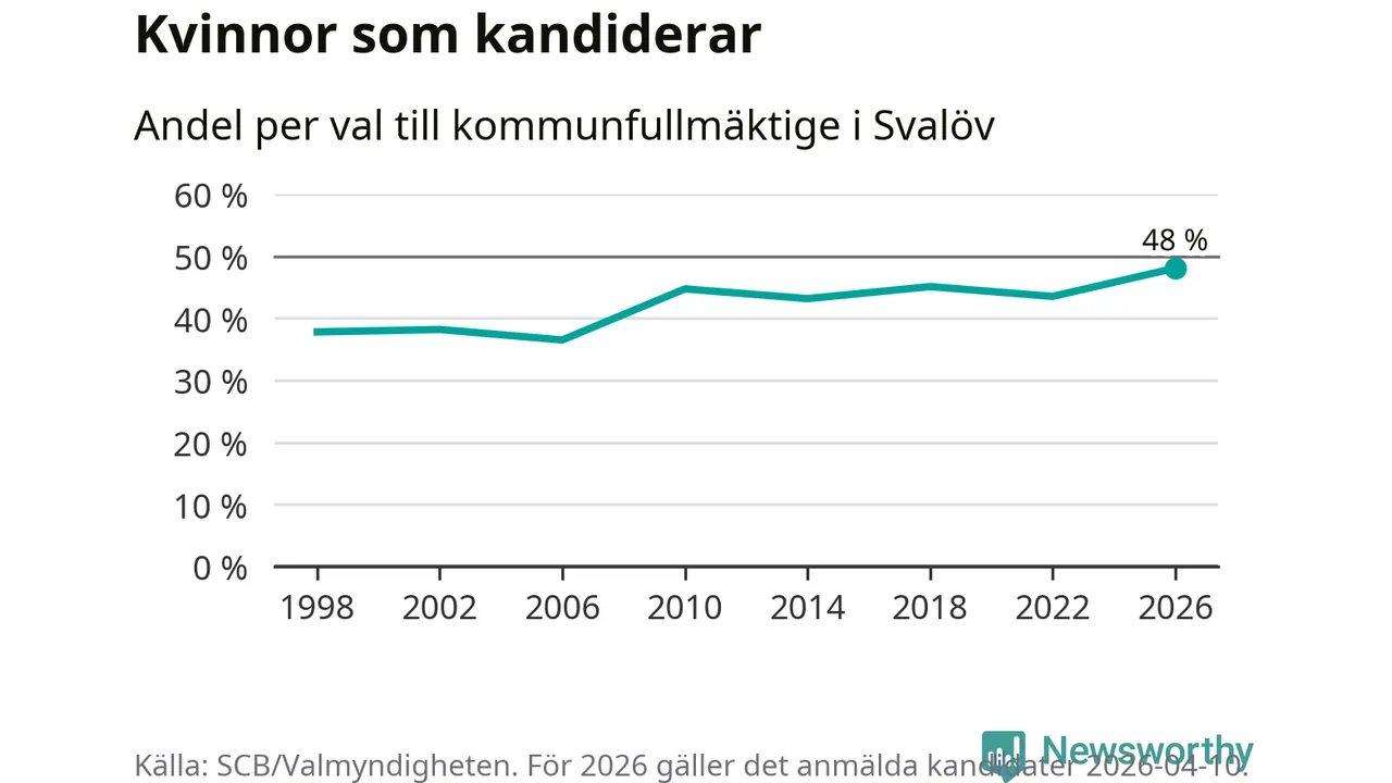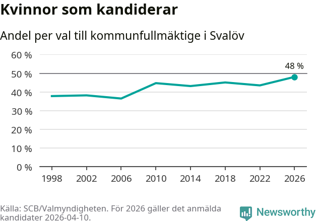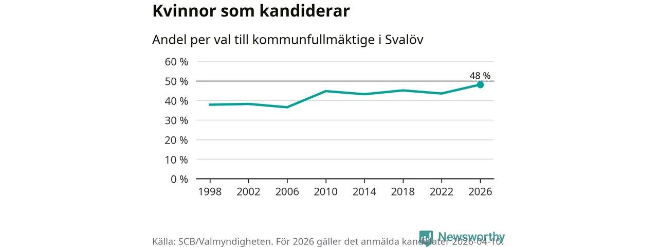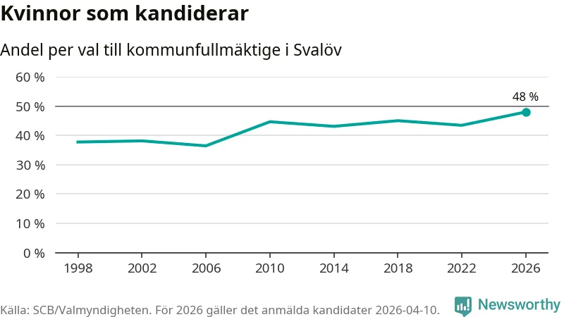 Kvinnorna utgör 48 procent av de hittills anmälda kandidaterna, vilket är den högsta andelen på listorna till kommunfullmäktige i Svalöv sedan åtminstone valet 1998. Svalöv är en av 264 kommuner i landet där männen utgör en majoritet av kandidaterna på listorna.