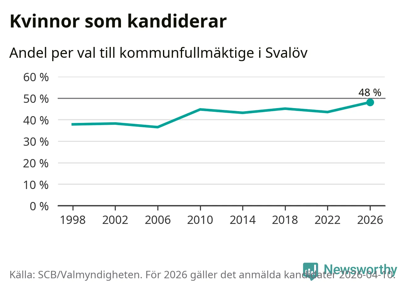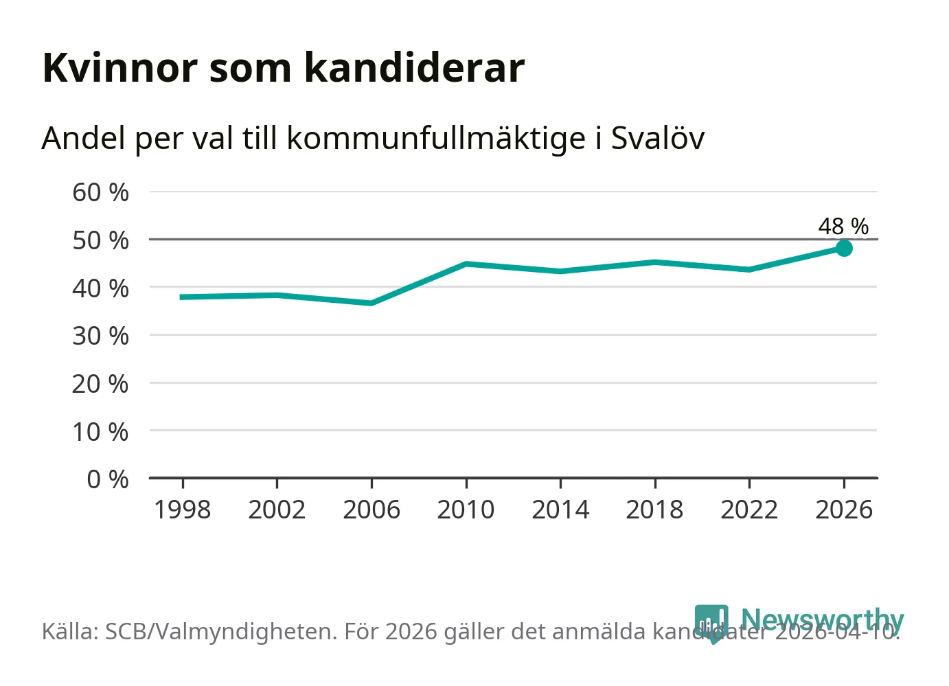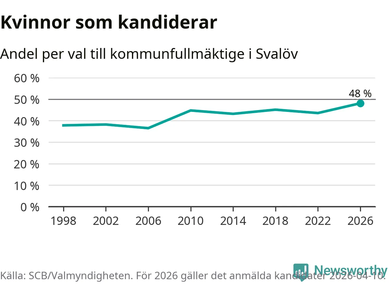 Kvinnorna utgör 48 procent av de hittills anmälda kandidaterna, vilket är den högsta andelen på listorna till kommunfullmäktige i Svalöv sedan åtminstone valet 1998. Svalöv är en av 264 kommuner i landet där männen utgör en majoritet av kandidaterna på listorna.