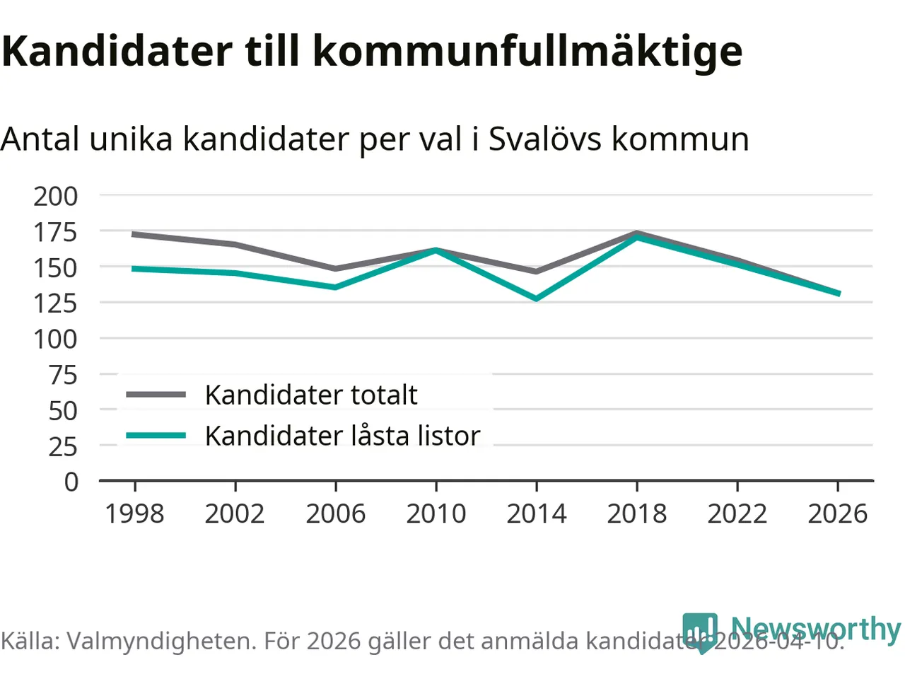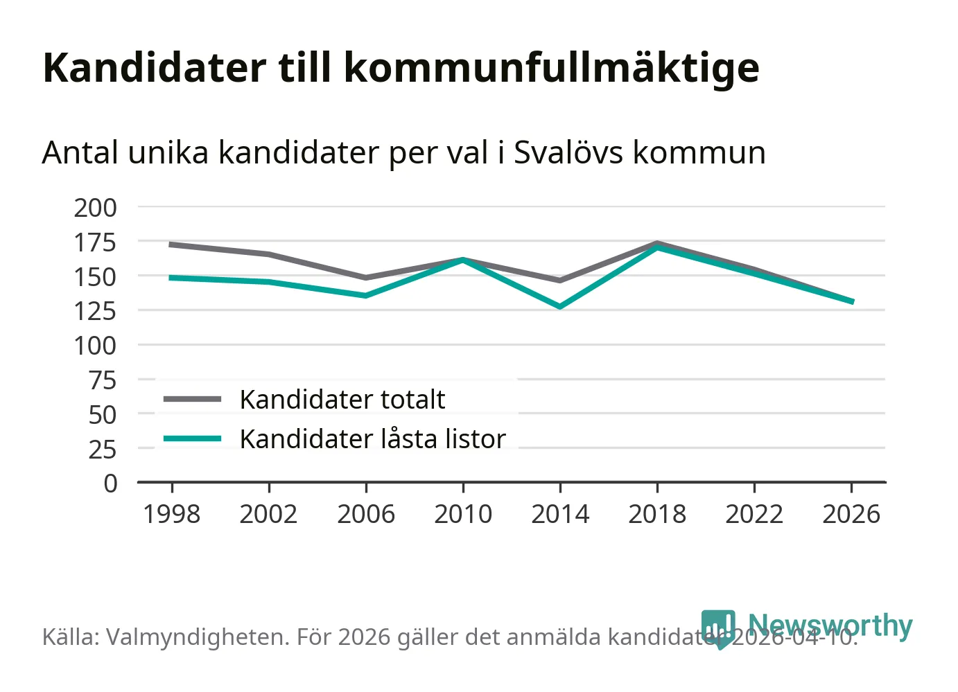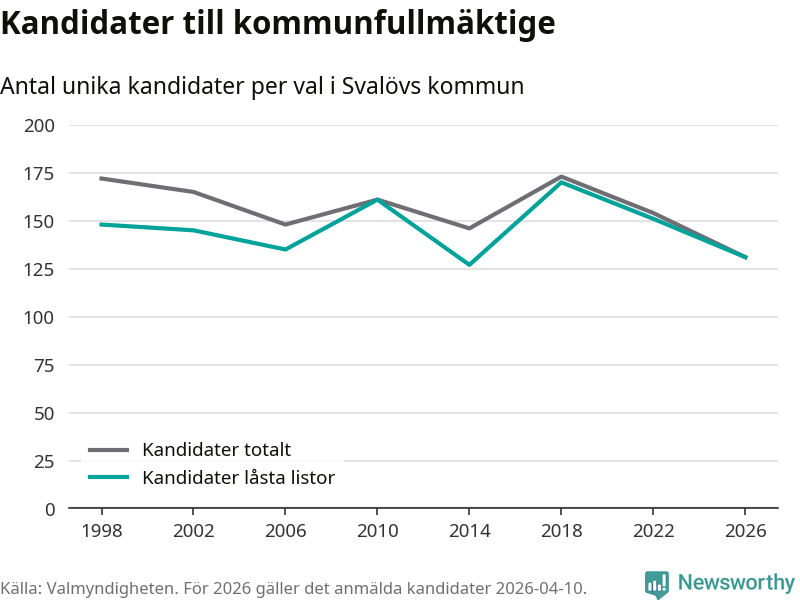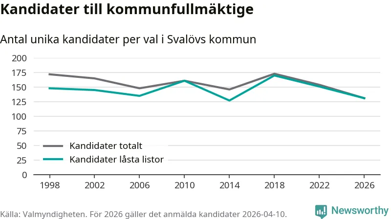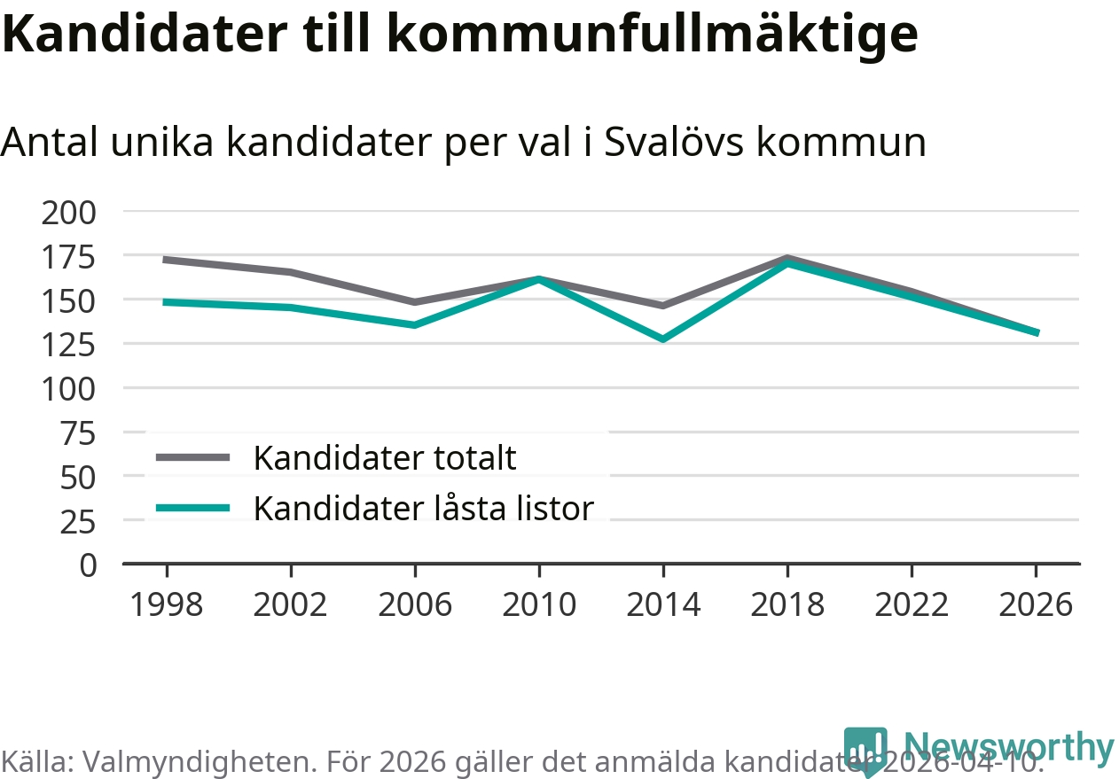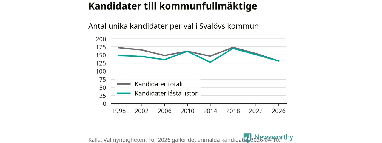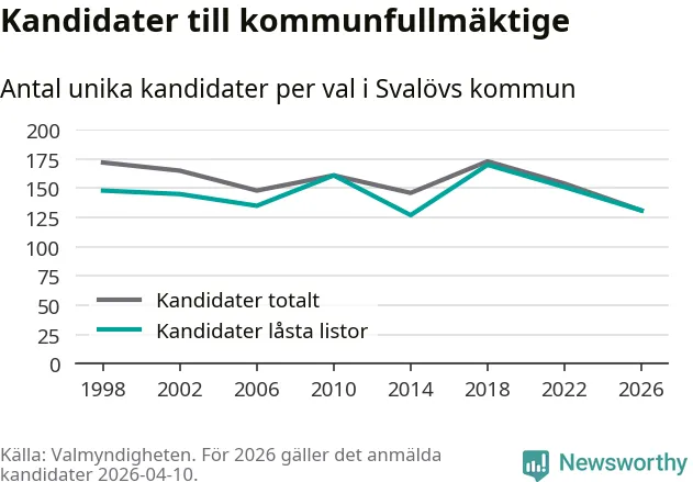 På torsdagen var det deadline för partier med låsta listor att registrera sina kandidater inför höstens val. Till valet till kommunfullmäktige i Svalöv är 131 kandidater anmälda på sådana listor, vilket är 20 färre än i valet 2022.