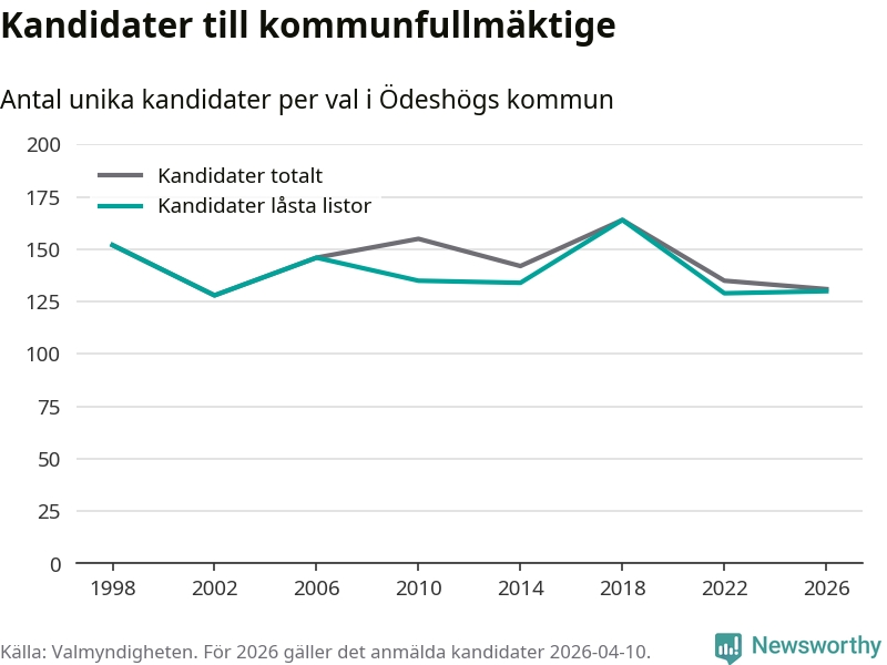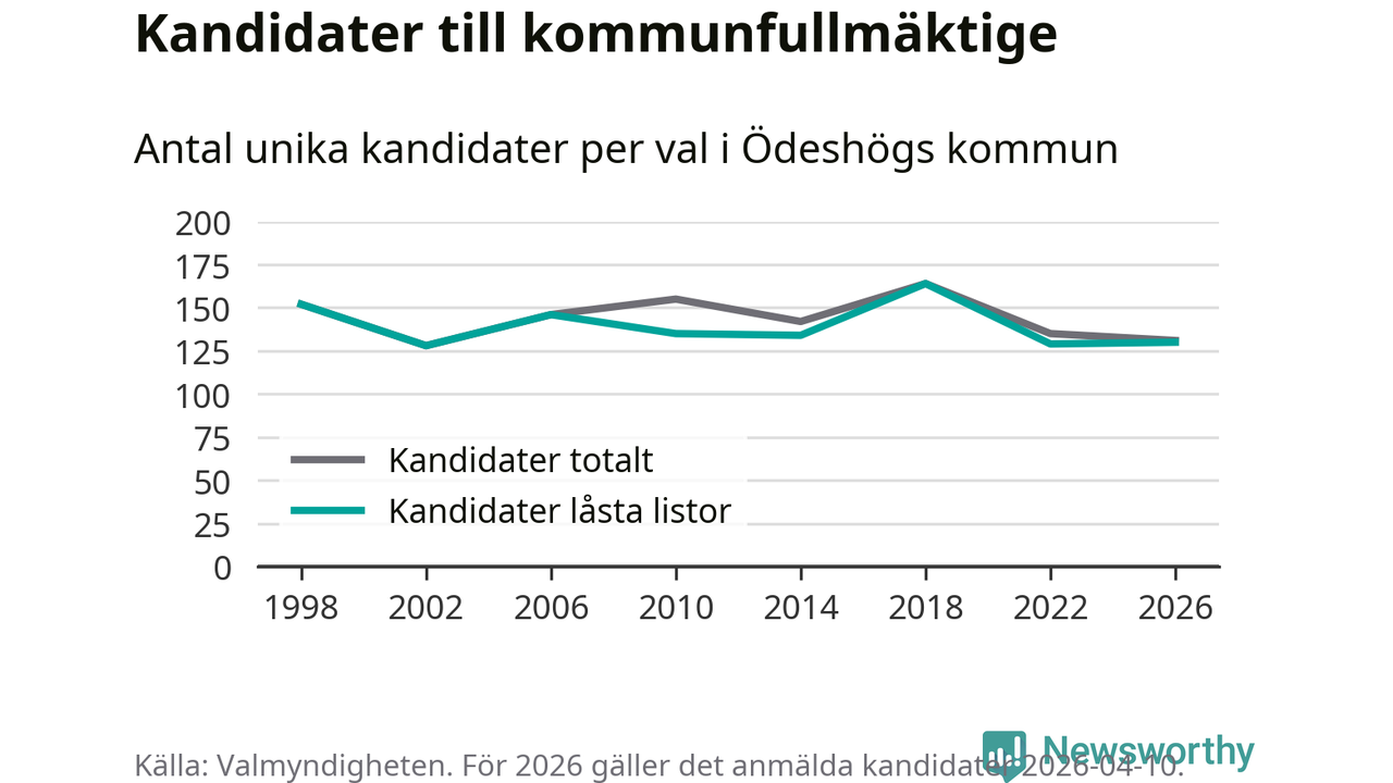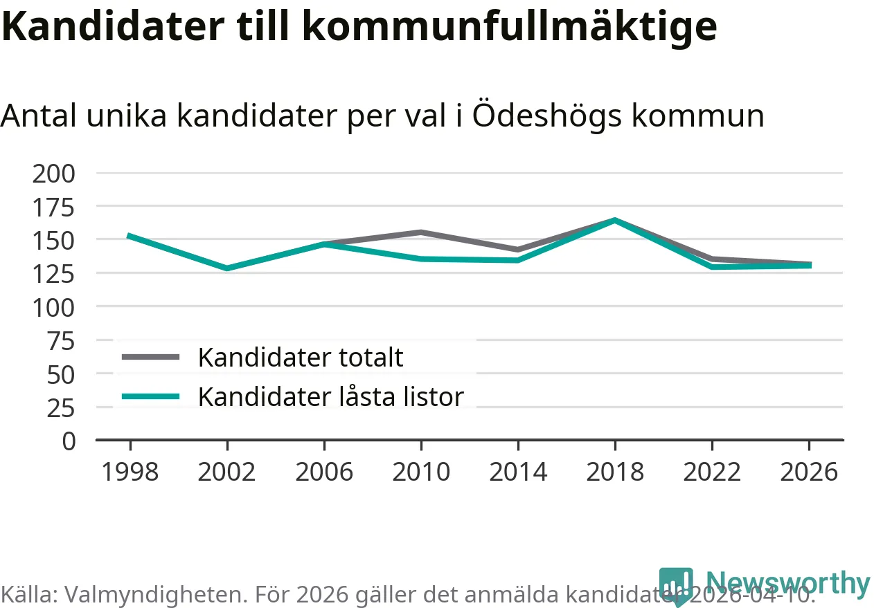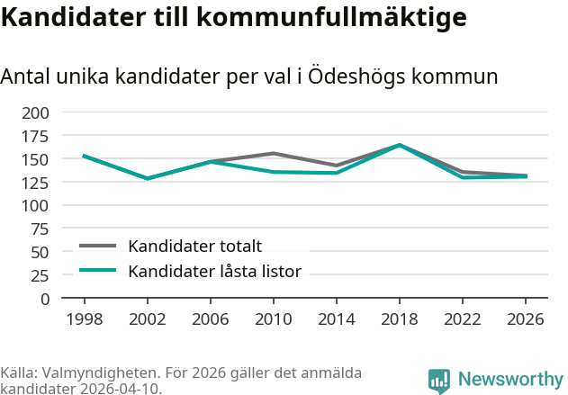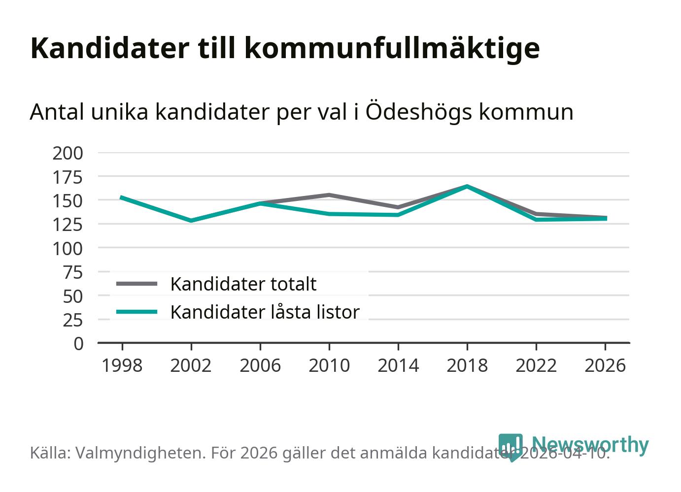 På torsdagen var det deadline för partier med låsta listor att registrera sina kandidater inför höstens val. Till valet till kommunfullmäktige i Ödeshög är 130 kandidater anmälda på sådana listor, vilket är ett fler än i valet 2022.